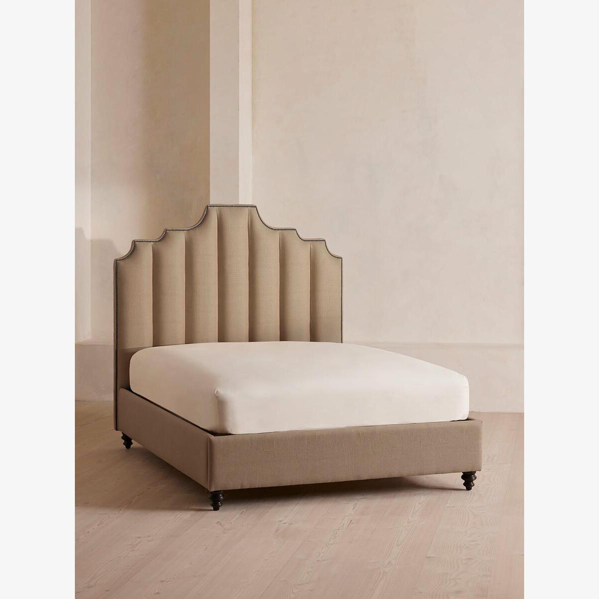 Created for the bedrooms at Babington House, our Gerrard style makes the bed the focal point of the room with a tall, fluted headboard in natural linen and decorative hand-studded border. Handmade in the UK by skilled craftsmen, this design rests on turned hardwood legs for added texture and sits low to the floor. Add it to your bedroom to bring a touch of our country retreat into your home. Double bed Handcrafted in the UK Upholstered in 100% linen Available in other colours and fabrics Tall, fluted headboard Decorative hand-studded border Turned legs Sits low to the floor Available in other fabrics and sizes Pair with our SH Hypnos Double Mattress Inspired by Babington House