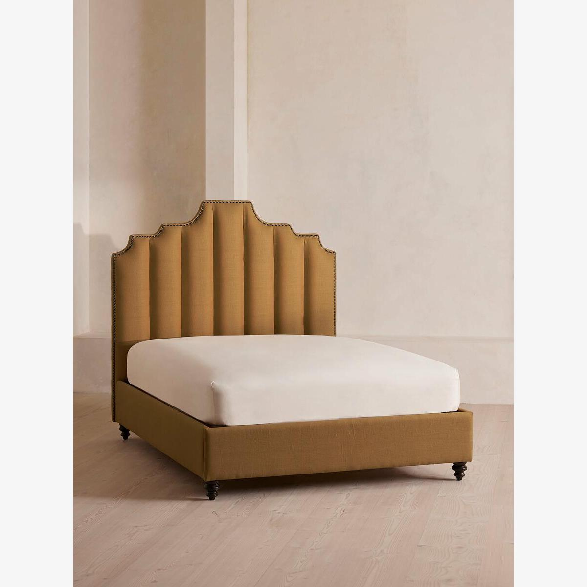 Created for the bedrooms at Babington House, our Gerrard style makes the bed the focal point of the room with a tall, fluted headboard in natural linen and decorative hand-studded border. Handmade in the UK by skilled craftsmen, this design rests on turned hardwood legs for added texture and sits low to the floor. Add it to your bedroom to bring a touch of our country retreat into your home. King-size bed Handcrafted in the UK Upholstered in 100% linen Available in other colours and fabrics Tall, fluted headboard Decorative hand-studded border Turned legs Sits low to the floor Available in other fabrics and sizes Pair with our SH Hypnos King Mattress Inspired by Babington House