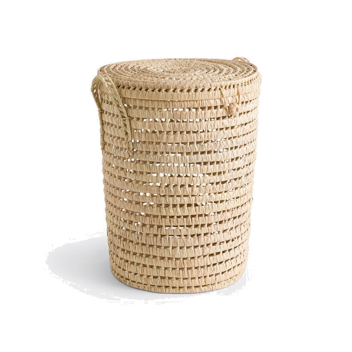 Made of natural fibres with a practical desgin, this is Ghada, the Moroccan-inspired laundry basket. Perfect for storing your laundry in the bathroom. Product Details • In woven palm leaves • With lid • 2 handles. Quality Info • Hand-crafted, each piece is unique: colours and dimensions may vary from product to product. Dimensions • Diameter: 40cm • Height: 50cm Parcel dimensions and weight:1 parcel • L42 x H52 x D42cm. 2.8kg
