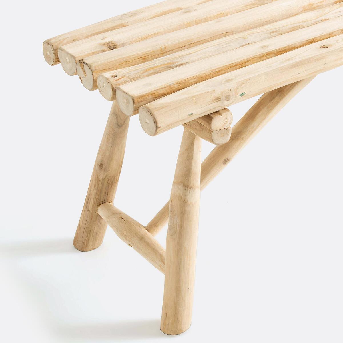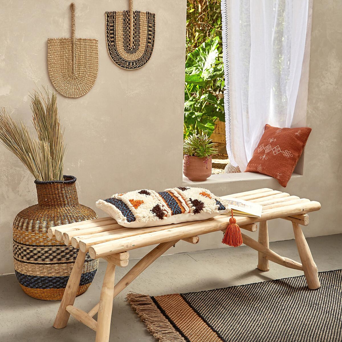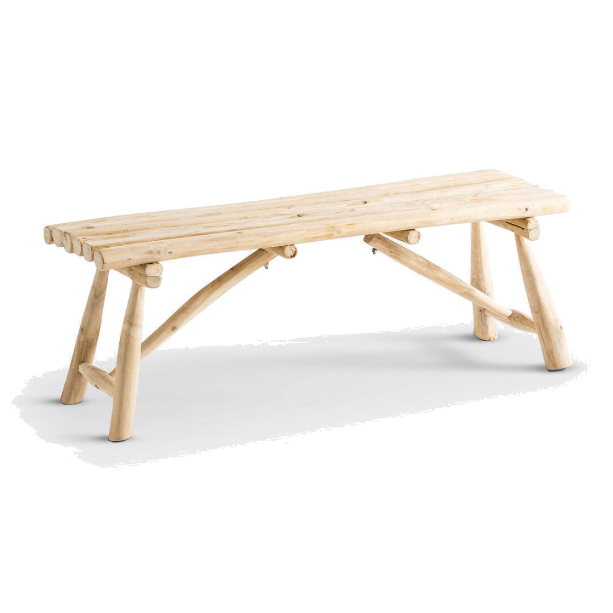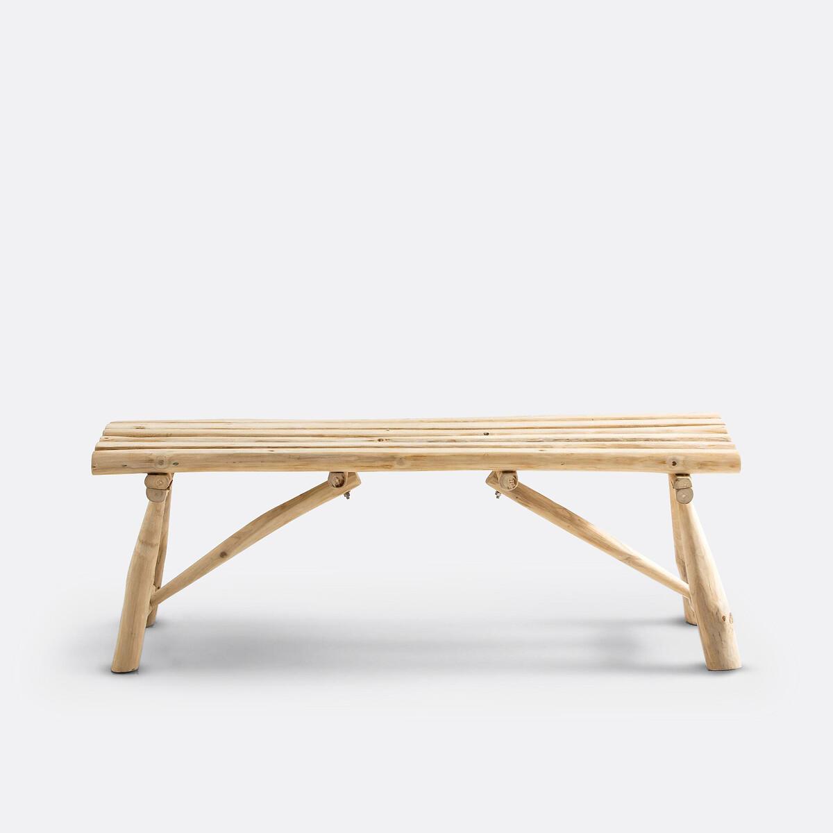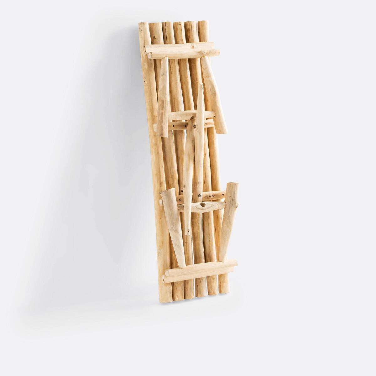 Bring a bohemian touch to your interior with this bench designed in teak branches. Feet are foldable for easy storage. Product Details • 1 slightly perforated seat • Structure made from teak branches • Foldable legs. Dimensions • Length: 125cm • Height: 45cm • Depth: 39cmDelivery:. This product is sold for self-assembly. It will be delivered to your door. Note! Please check that all access points are large enough to accommodate your delivery (doors, stairs, lifts).Parcel dimensions and weight:1 parcel • L135 x H23 x D45.5 cm • 16kg
