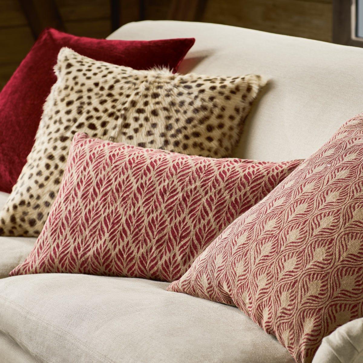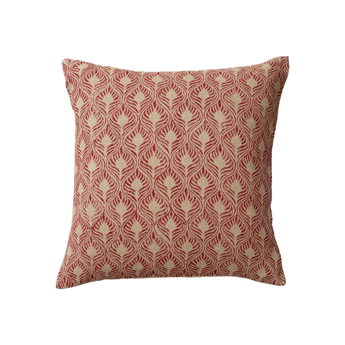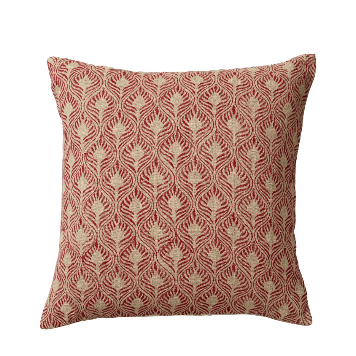 Our Ghini Cushion Covers draw inspiration from the tropical plants, flowers and birds found in a botanical garden. Choose between flowers and fronds (available in two different sizes) or opt for leaves and feathers (available in our larger size only). The original patterns are printed in vivid blues and reds, but the natural-coloured linen used cools the designs down, along with the painterly technique in which they are applied. Ghini Feathers Cushion Cover - Red
