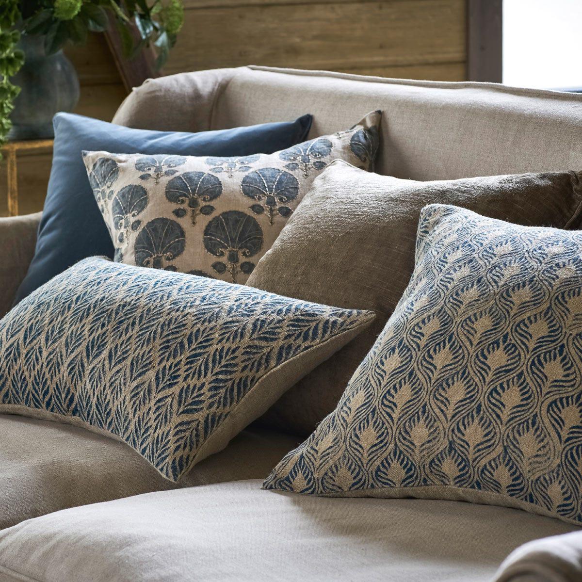 Our Ghini Cushion Covers draw inspiration from the tropical plants, flowers and birds found in a botanical garden. Choose between flowers and fronds (available in two different sizes) or opt for leaves and feathers (available in our larger size only). The original patterns are printed in vivid blues and reds, but the natural-coloured linen used cools the designs down, along with the painterly technique in which they are applied.