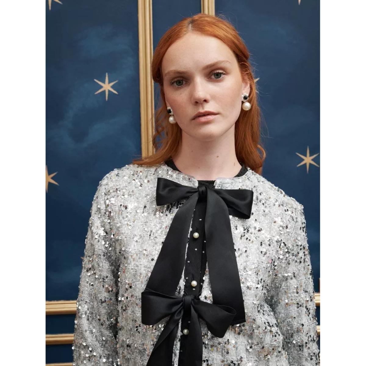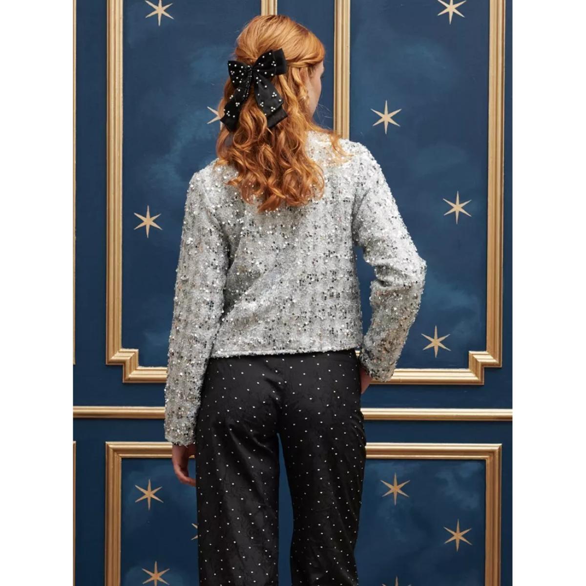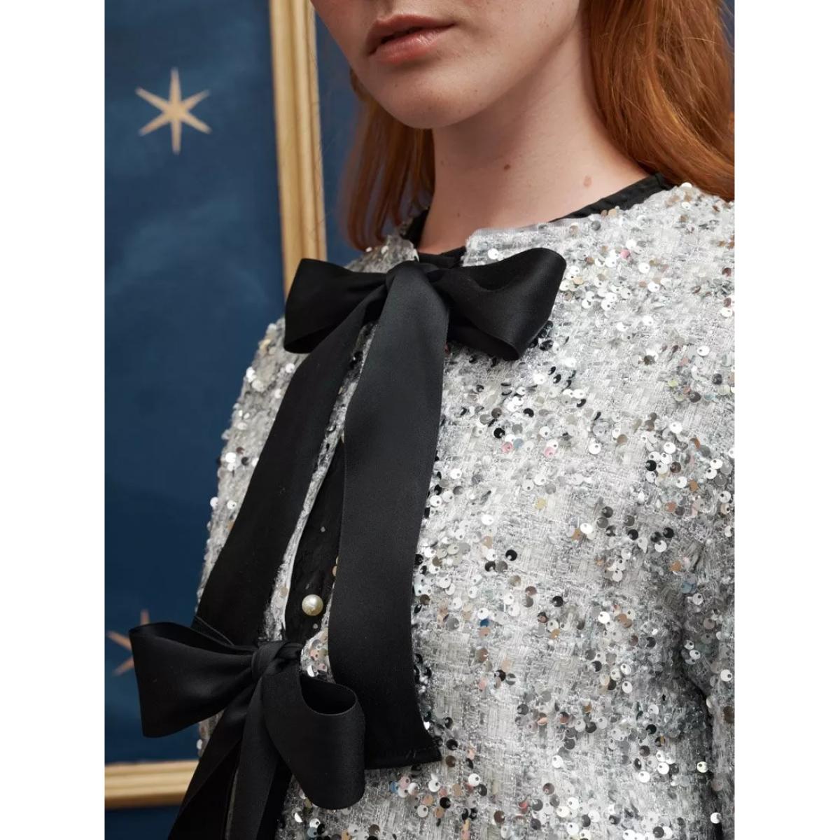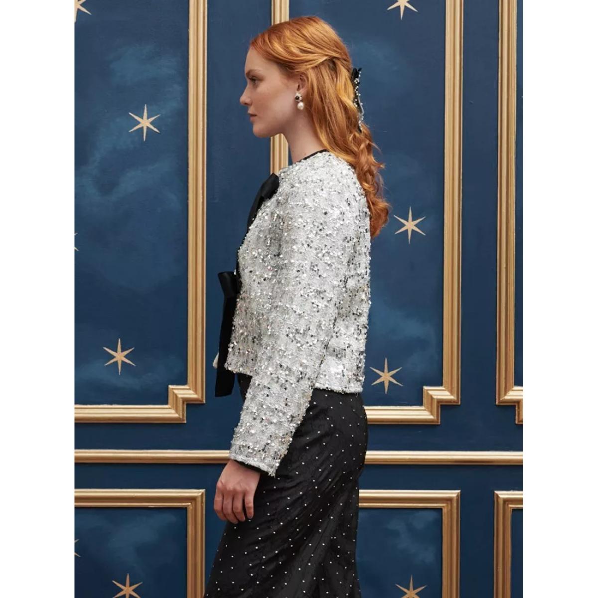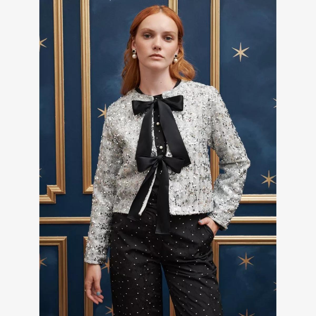 Made from a sequin tweed fabric, this cropped cardigan from Sister Jane is fully lines and detailed with contrast adjustable multiway ties.