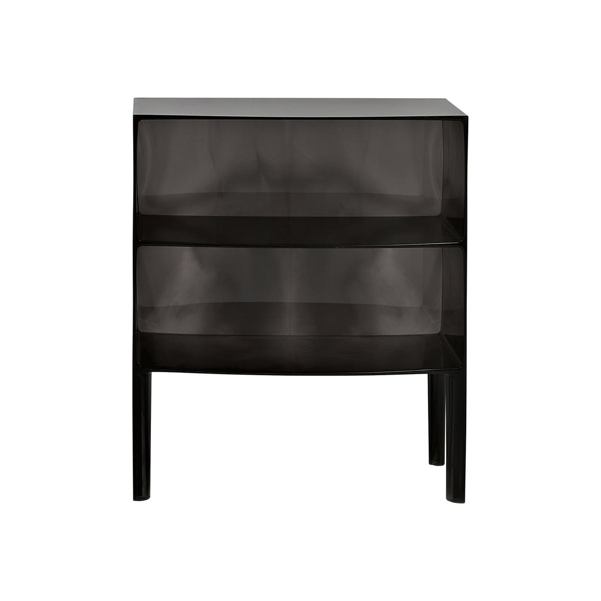 Ghost Buster, designed by Philippe Starck & Eugeni Quitllet is a development in the Ghost range of furniture, this time dedicated to designs for home storage. Ghost Buster evokes the lines of classic furniture but with a contemporary accent in its use of transparency and plastic. It features a unit of open fronted shelves which sits on slender bifacial legs. With its combination of corners and curves, straight and sinuous lines Ghost Buster is a combination of eye catching perspectives and reflections.
