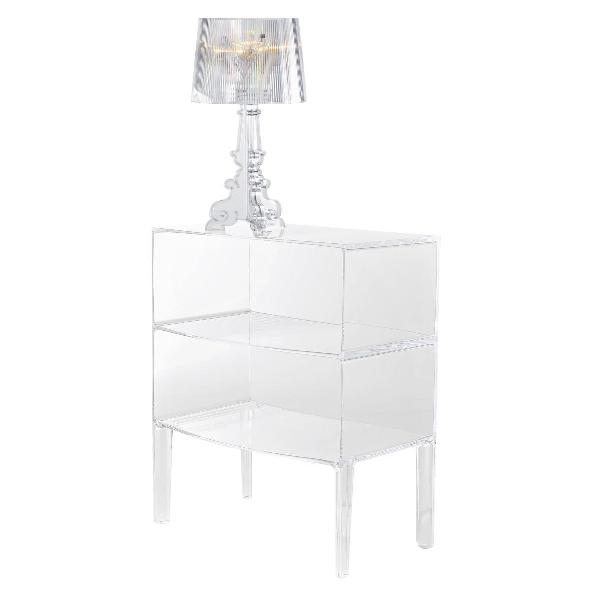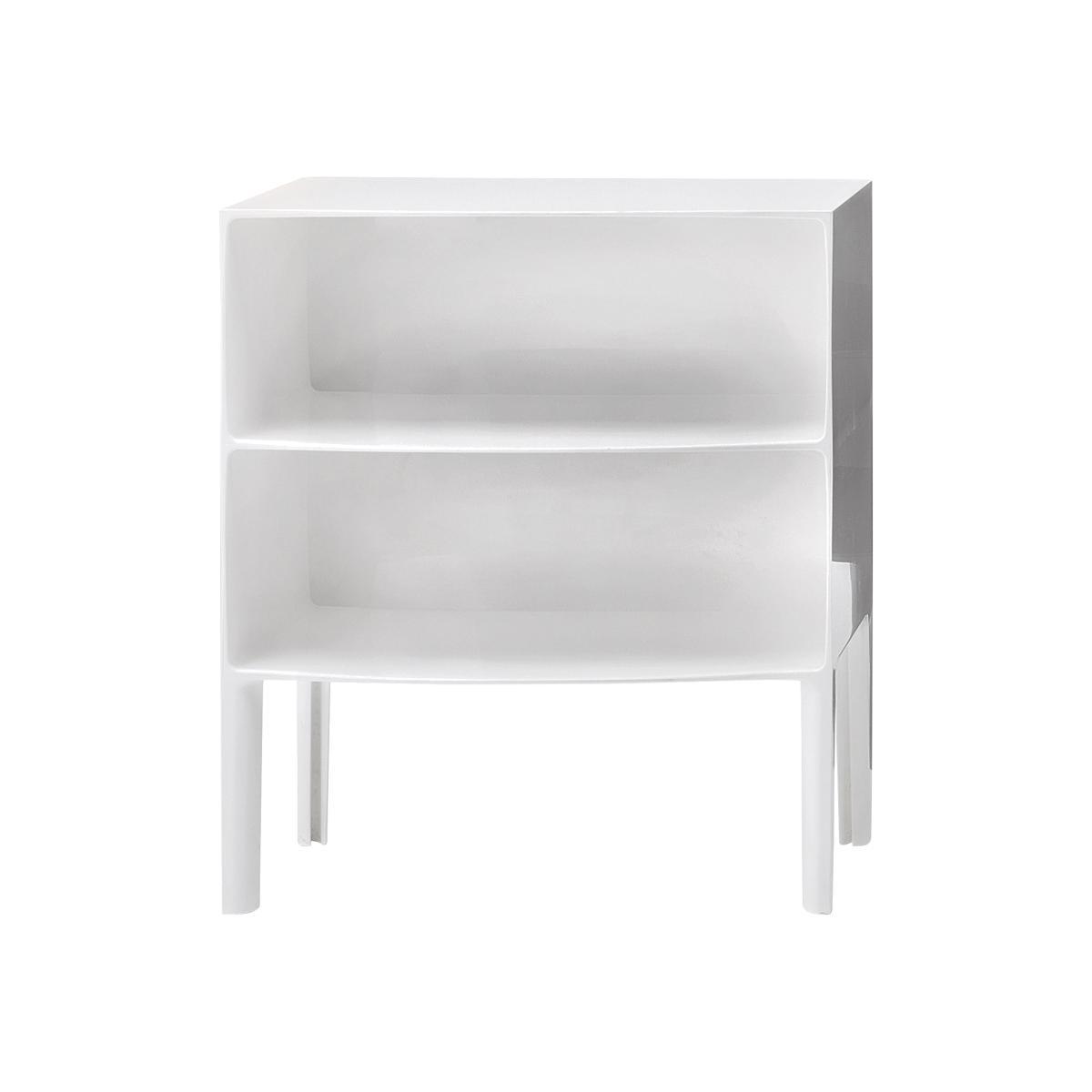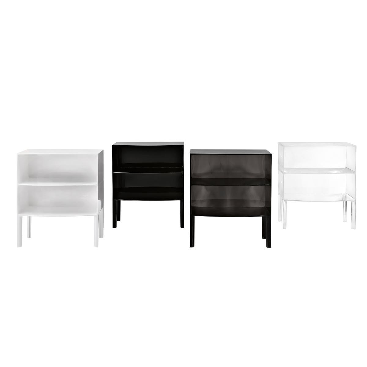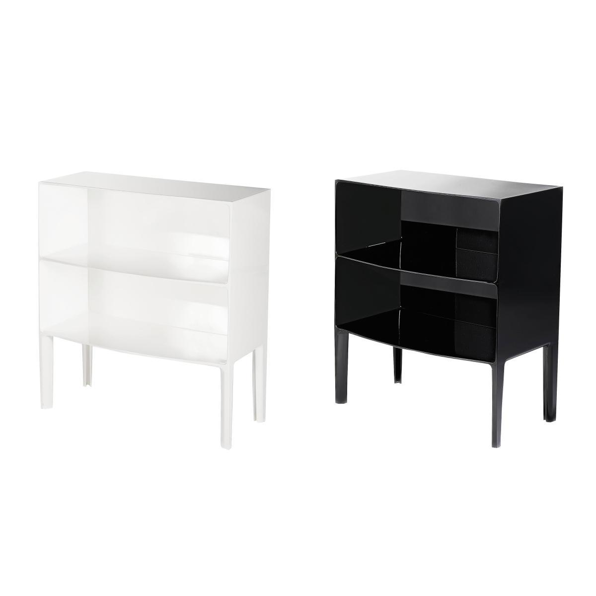 Ghost Buster, designed by Philippe Starck & Eugeni Quitllet is a development in the Ghost range of furniture, this time dedicated to designs for home storage. Ghost Buster evokes the lines of classic furniture but with a contemporary accent in its use of transparency and plastic. It features a unit of open fronted shelves which sits on slender bifacial legs. With its combination of corners and curves, straight and sinuous lines Ghost Buster is a combination of eye catching perspectives and reflections.