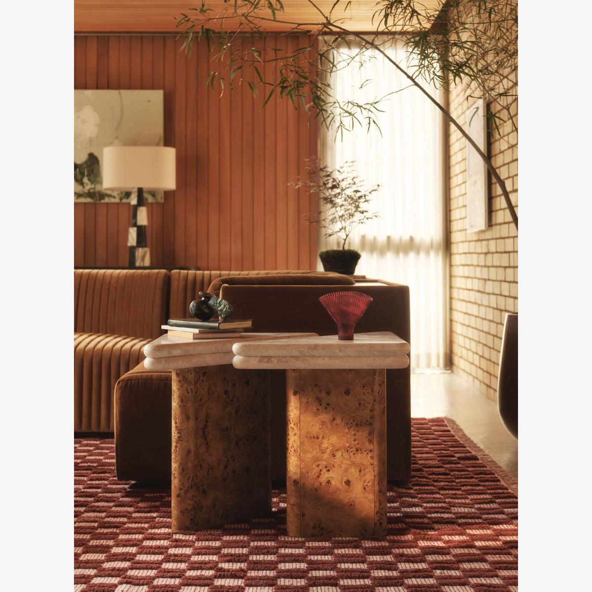 I’m a big fan of these marble-top side tables for their clean lines and warm tones - the cylindrical bases give just enough sculptural interest without overwhelming a room. They work equally well in a minimalist scheme or layered into a mid-century-inspired lounge. Styling tip: tuck them beside a sofa or armchair and keep one slightly taller than the other for a staggered effect. Use them to display a stack of books, a small plant or a simple ceramic vase, and leave enough clear surface to rest a cup or remote. Their neutral palette also lets you introduce bolder textiles or art elsewhere without clashing.