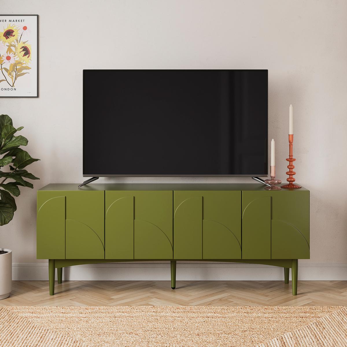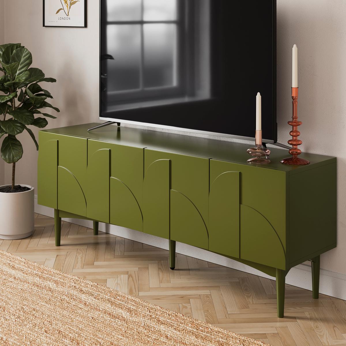 I’m a big fan of this moss green TV unit - its clean lines and subtle geometric detailing make it a versatile centrepiece in both Scandi-inspired and mid-century modern living rooms. The muted yet rich colour works well against a neutral backdrop or teamed with natural timbers and woven rugs for an easy, contemporary vibe. For styling, keep the top surface uncluttered: a slim soundbar, a pair of candleholders or a low planter will complement rather than compete with the finish. Use the concealed storage to hide cables, remotes and media, and add a few coffee-table books or a decorative bowl inside one of the compartments for a curated feel. Finish with a cosy rug in a complementary tone and a couple of framed prints on the wall to anchor the space.