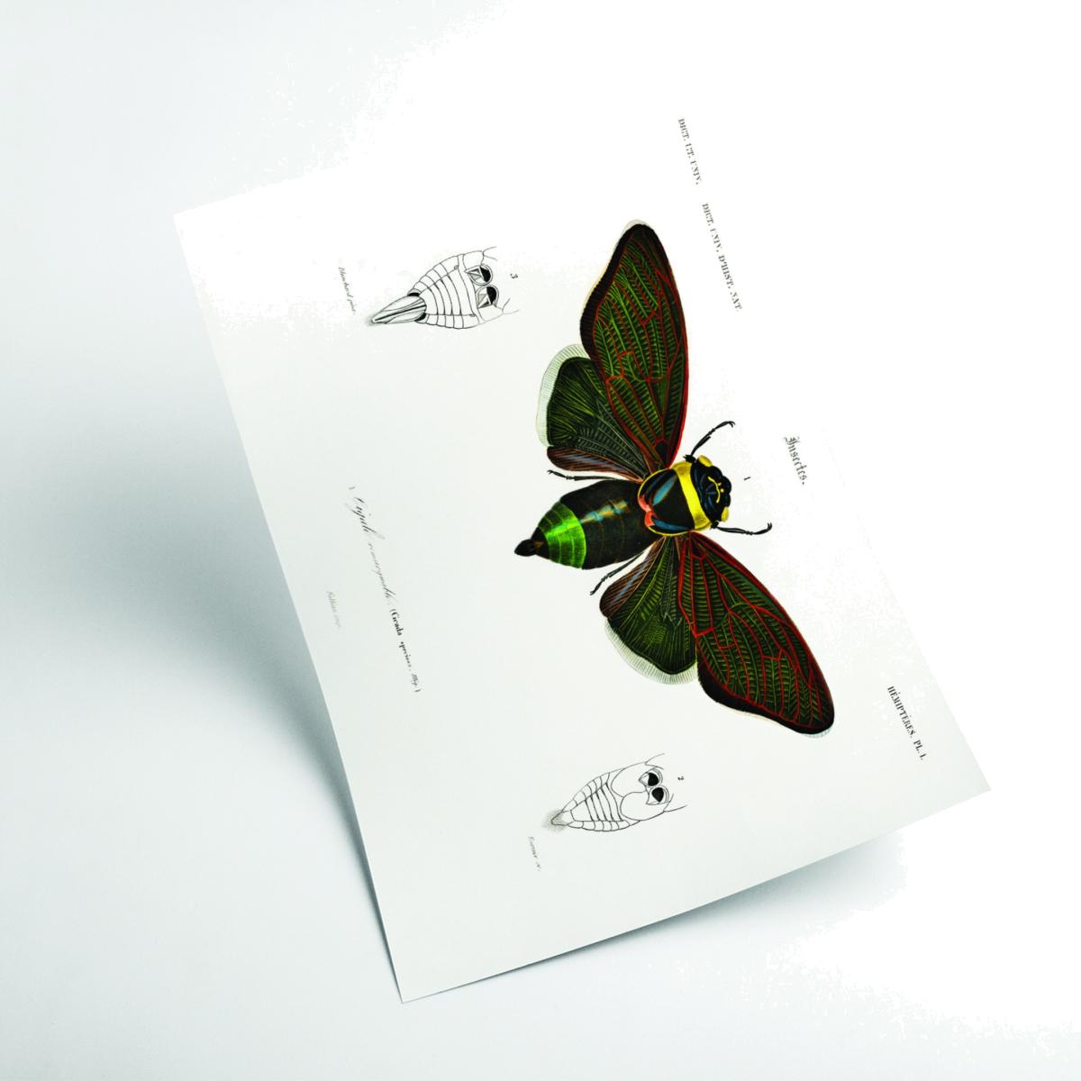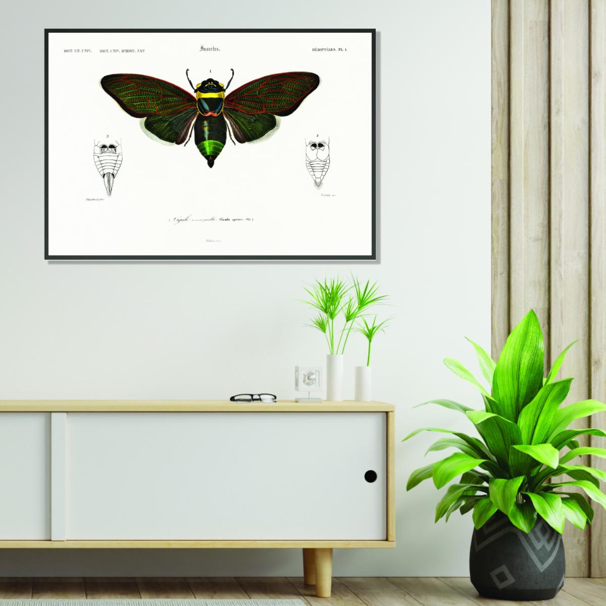 I love this print for its understated scientific appeal combined with a touch of nature-inspired drama. It works particularly well in contemporary or minimalist interiors, where it can serve as a subtle statement piece. The combination of botanical and insect illustrations adds a hint of vintage charm, making it ideal for eclectic or bohemian spaces as well. For styling, consider framing it in a sleek black or natural wood frame to keep the focus on the artwork, and hang it at eye level with good natural light to highlight the details. It also pairs well with other nature-themed prints or simple decor to create a curated, stylish vignette.