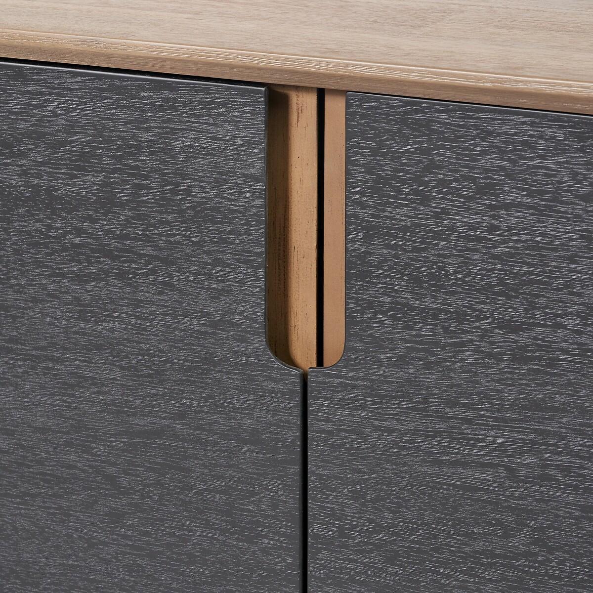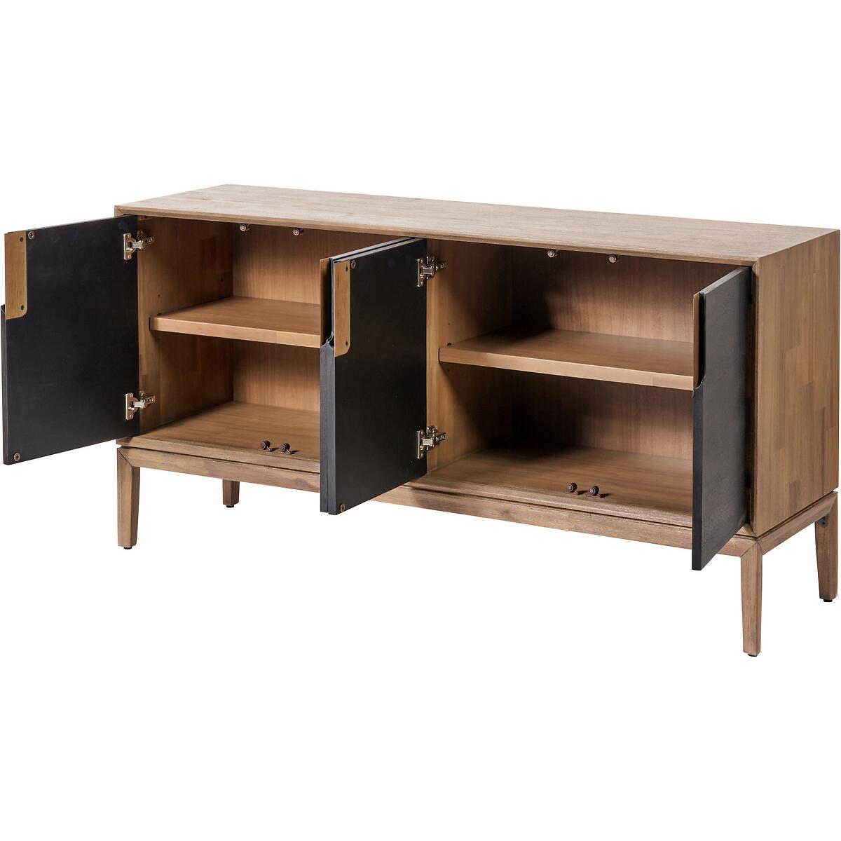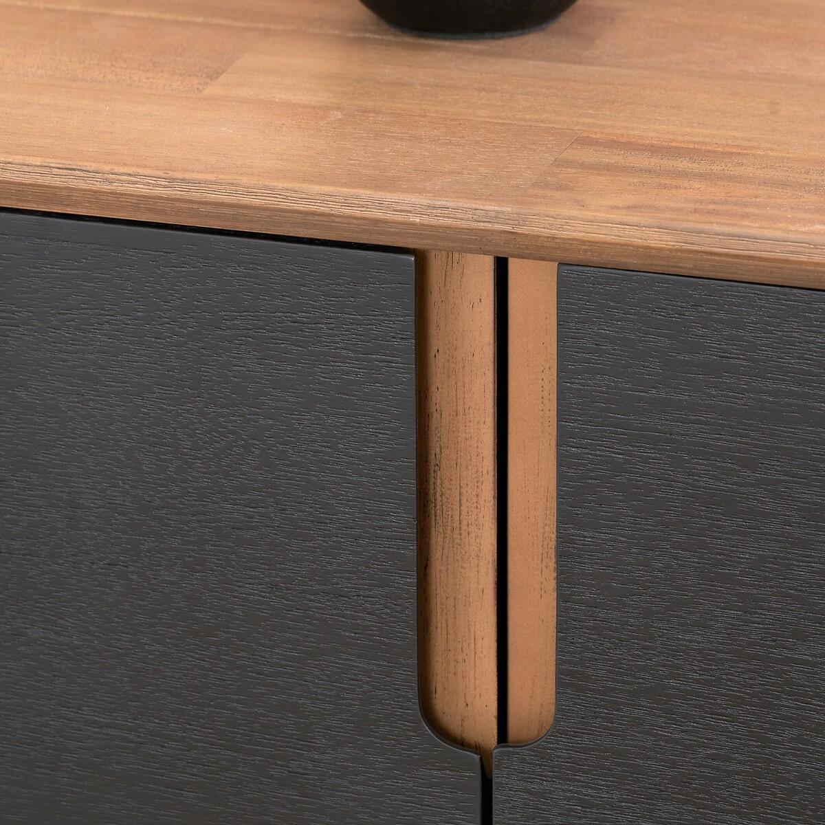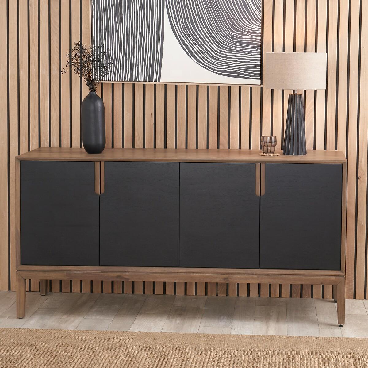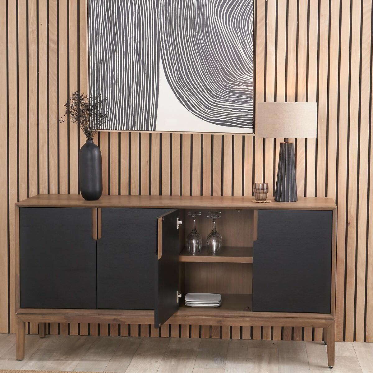 The Giano Sideboard is a bold yet refined statement piece, expertly crafted in Vietnam from premium acacia wood. Its striking contrast of natural and black finishes creates a clean, Scandinavian-inspired aesthetic that brings warmth and modern elegance to any home. Behind its four doors, generous internal shelving provides ample storage for dinnerware, glassware, or everyday essentials, keeping your space beautifully organized. Perfect for dining rooms, hallways, or open-plan living areas, the Giano Sideboard balances contemporary design with everyday functionality. Product Details• 4 doors• Interior shelving maximises storage space (fixed height)• Matte grained wood finish• Tapered legs• Wall fixings included• Delivered fully assembled• 1 year manufacturers warranty. Product Composition - Acacia wood 55%, MDF 43%, Steel 2%Product Dimensions - 160 cm x45 cm x80 cm , Weight - 50 KG• Clearance to floor: 20 cm Package Dimensions - 169 cm x 90 cm x 52 cm, Weight 71 kg. This product will be dispatched by one of our trusted suppliers. You’ll be contacted by their selected courier about your delivery.