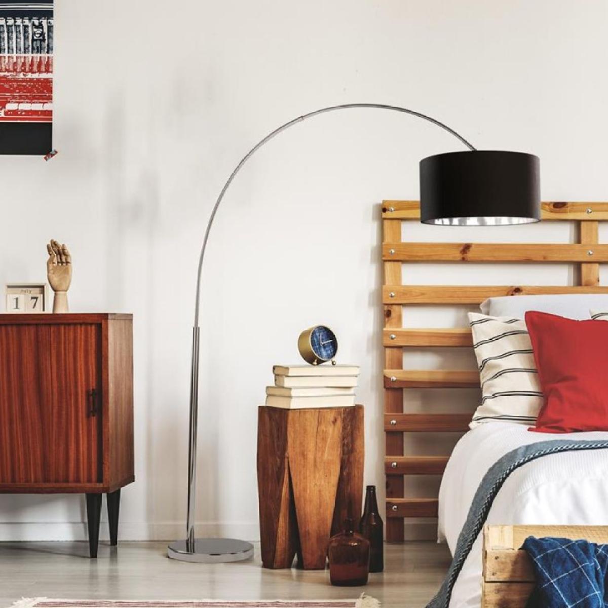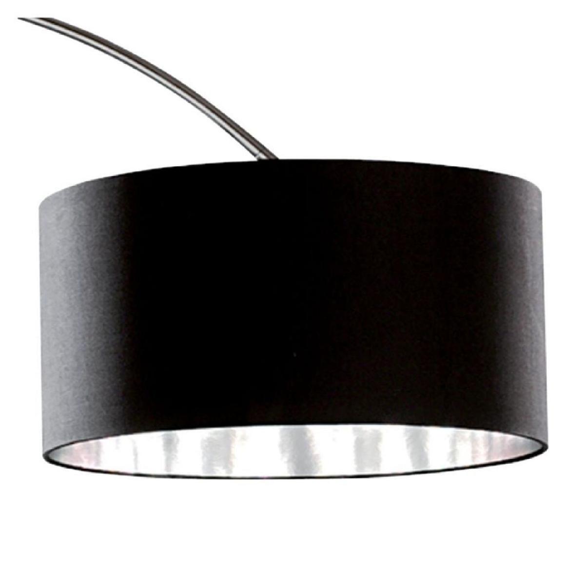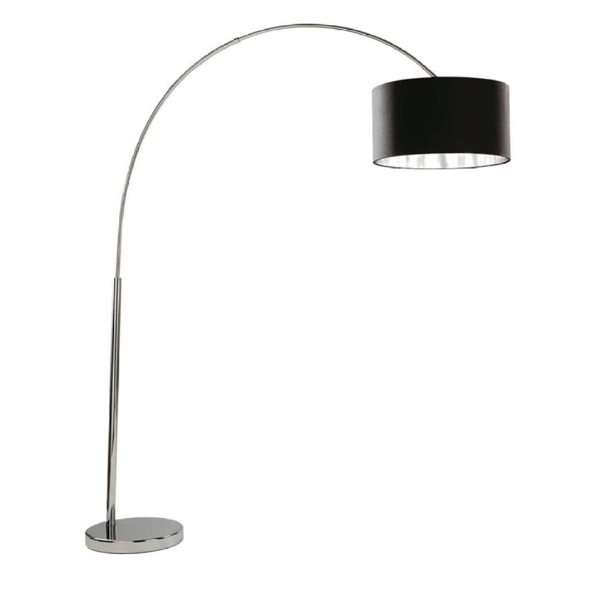 Giant Arc floor, featuring a contemporary curved design, black drum shade with silver lining and polished chrome finish. Giant Arc floor, featuring a contemporary curved design, black drum shade with silver lining and polished chrome finish.