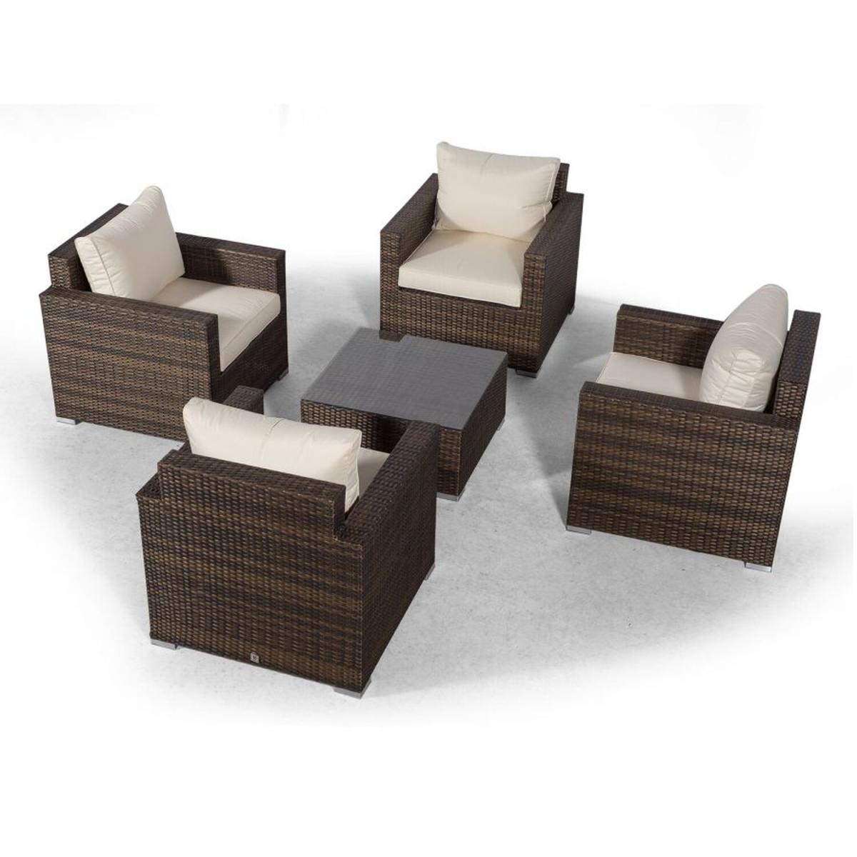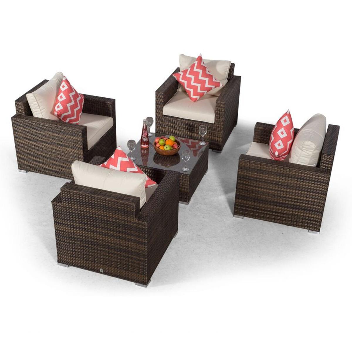Relax in style with the Sydney 4 seat outdoor rattan conversation set, it is a flexible seating solution configurable in multiple ways and features a glass top coffee table, perfect for drinks and snacks. This stylish rattan lounge set is available in a stylish mixed grey or the stunning mixed brown rattan weave. Giardino rattan garden furniture features multi-density foam and fiber padded cushions making this outdoor rattan chair set super comfortable. Featuring 10cm thick seat cushions and 20cm thick back cushions, the multi density fillings enhance the shape and structure of the cushions providing comfort and support to your rattan conversation set. Giardino rattan garden furniture is made using aluminium frames and polyethylene all weather rattan, making this outdoor rattan sofa set strong, light-weight and corrosion resistant. Each armchair and coffee table comes fully assembled and the impressive synthetic wicker furniture material is UV resistant, able to withstand temperatures from -15 degrees celsius to 60 degrees celsius. Our special water-resistant fabrics protect your rattan garden set cushions from showers and all cushions feature easily removable zip-off covers for easy maintenance. The Sydney rattan sofa set is designed to be left outdoors all year round without the need for covering, however it comes complete with a high quality all weather furniture covers to keep dust and leaves away during winter months. A damp cloth or garden hose is all that's needed to maintain this rattan furniture. At Thats Furniture, we pride ourselves on meeting all our customers' individual needs. Along with our impeccably designed outdoor furniture, our dedication to customer satisfaction means our rattan garden furniture comes with a full 12-month manufacturers warranty and 5 year extended warranty on the internal frames, backed by our no quibble 30 day money back guarantee so you can buy your garden furniture with complete confidence.