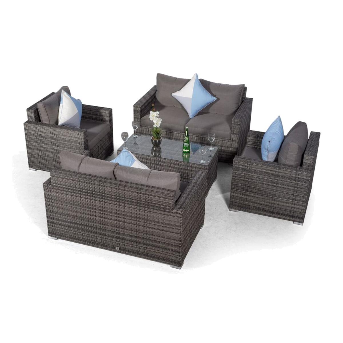 The Sydney rattan patio conversation set consists of 2 x 2 seater sofas, 2 x armchairs and a large glass top coffee table and offers a flexible outdoor seating solution configurable in multiple ways. This stylish rattan sofa set is available in a stylish mixed grey or the stunning mixed brown rattan weave and can seat up to 6 people. Giardino rattan garden furniture features multi-density foam and fiber padded cushions making this outdoor rattan sofa set super comfortable. Featuring 10cm thick seat cushions and 20cm thick back cushions, the multi density fillings enhance the shape and structure of the cushions providing comfort and support to your rattan conversation set. The perfectly proportioned glass top coffee table provides the ideal setting for drinks and snacks. Giardino rattan garden furniture is made using aluminium frames and polyethylene all weather rattan, making this outdoor rattan sofa set strong, light-weight and corrosion resistant. Each piece of rattan furniture comes fully assembled and the impressive synthetic wicker furniture material is UV resistant, able to withstand temperatures from -15 degrees celsius to 60 degrees celsius. Our special water-resistant fabrics protect your rattan garden set cushions from showers and all cushions feature easily removable zip-off covers for easy maintenance. The Sydney rattan sofa set is designed to be left outdoors all year round without the need for covering, however it comes complete with a high quality all weather furniture covers to keep dust and leaves away during winter months. At Thats Furniture, we pride ourselves on meeting all our customers' individual needs. Along with our impeccably designed outdoor furniture, our dedication to customer satisfaction means our rattan garden furniture comes with a full 12-month manufacturers warranty and 5 year extended warranty on the internal frames, backed by our no quibble 30 day money back guarantee so you can buy your garden furniture with complete confidence.