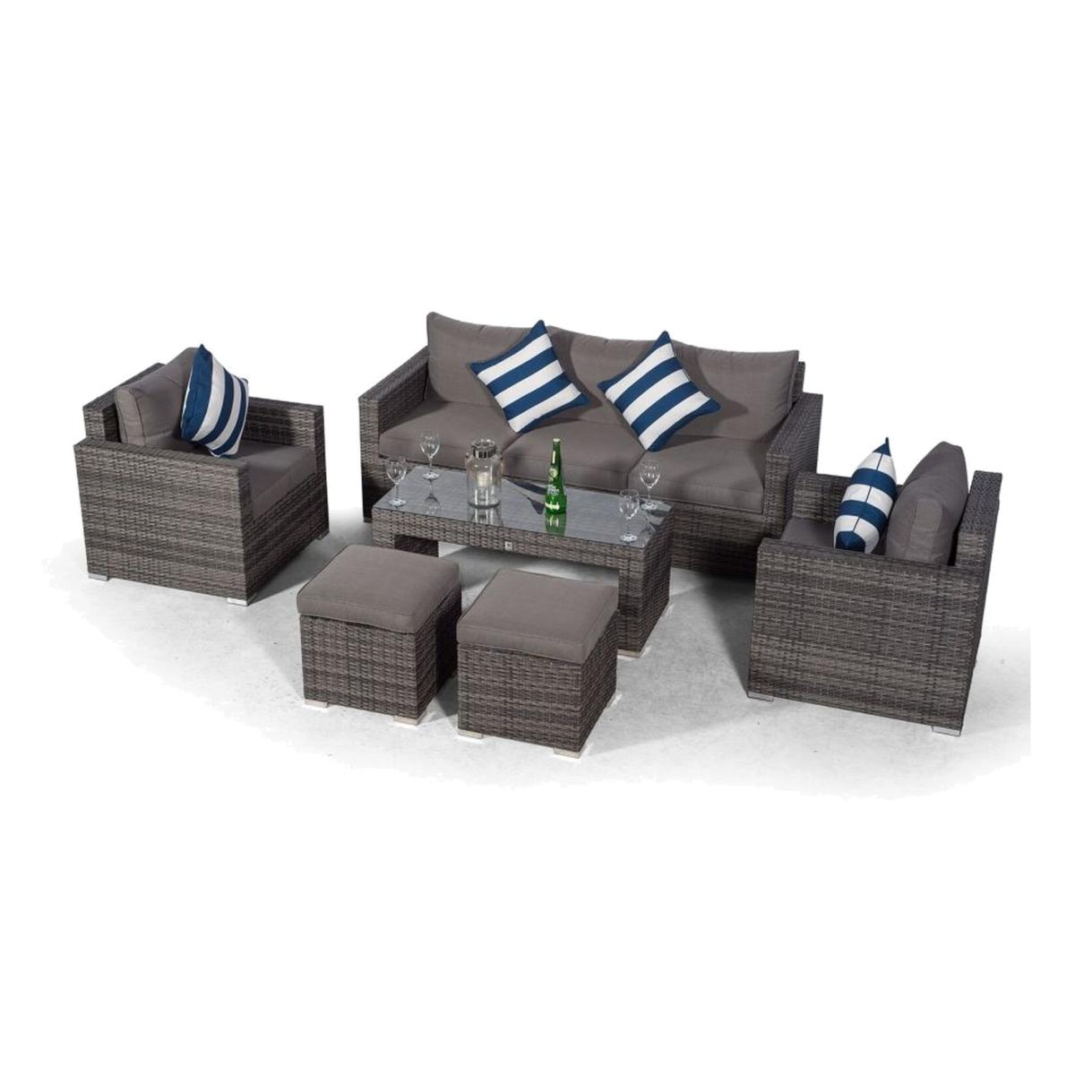 The Sydney 5 seat rattan patio conversation set consists of a 3 seater sofa, 2 x armchairs, large glass top coffee table and 2 stools. This set is available in an ultra stylish mixed grey or the stunning mixed brown rattan weave. The stools can be used as footrests or extra seating allowing you to seat up to 7 people. When not in use, the stools can be neatly stored underneath the table for a clutter free look. This rattan garden furniture features multi-density foam and fiber padded cushions making this outdoor rattan sofa set super comfortable. Featuring 10cm thick seat cushions and 20cm thick back cushions, the multi density fillings enhance the shape and structure of the cushions providing comfort and support to your rattan conversation set. Giardino rattan garden furniture is made using aluminium frames and polyethylene all weather rattan, making this outdoor rattan sofa set strong, light-weight and corrosion resistant. Each piece of rattan furniture comes fully assembled and the impressive synthetic wicker furniture material is UV resistant, able to withstand temperatures from -15 degrees celsius to 60 degrees celsius. Our special water-resistant fabrics protect your rattan garden set cushions from showers and all cushions feature easily removable zip-off covers for easy maintenance. The Sydney rattan sofa set is designed to be left outdoors all year round without the need for covering, however it comes complete with a high quality all weather furniture covers to keep dust and leaves away during winter months. At Thats Furniture, we pride ourselves on meeting all our customers' individual needs. Along with our impeccably designed outdoor furniture, our dedication to customer satisfaction means our rattan garden furniture comes with a full 12-month manufacturers warranty and 5 year extended warranty on the internal frames, backed by our no quibble 30 day money back guarantee so you can buy your garden furniture with complete confidence.