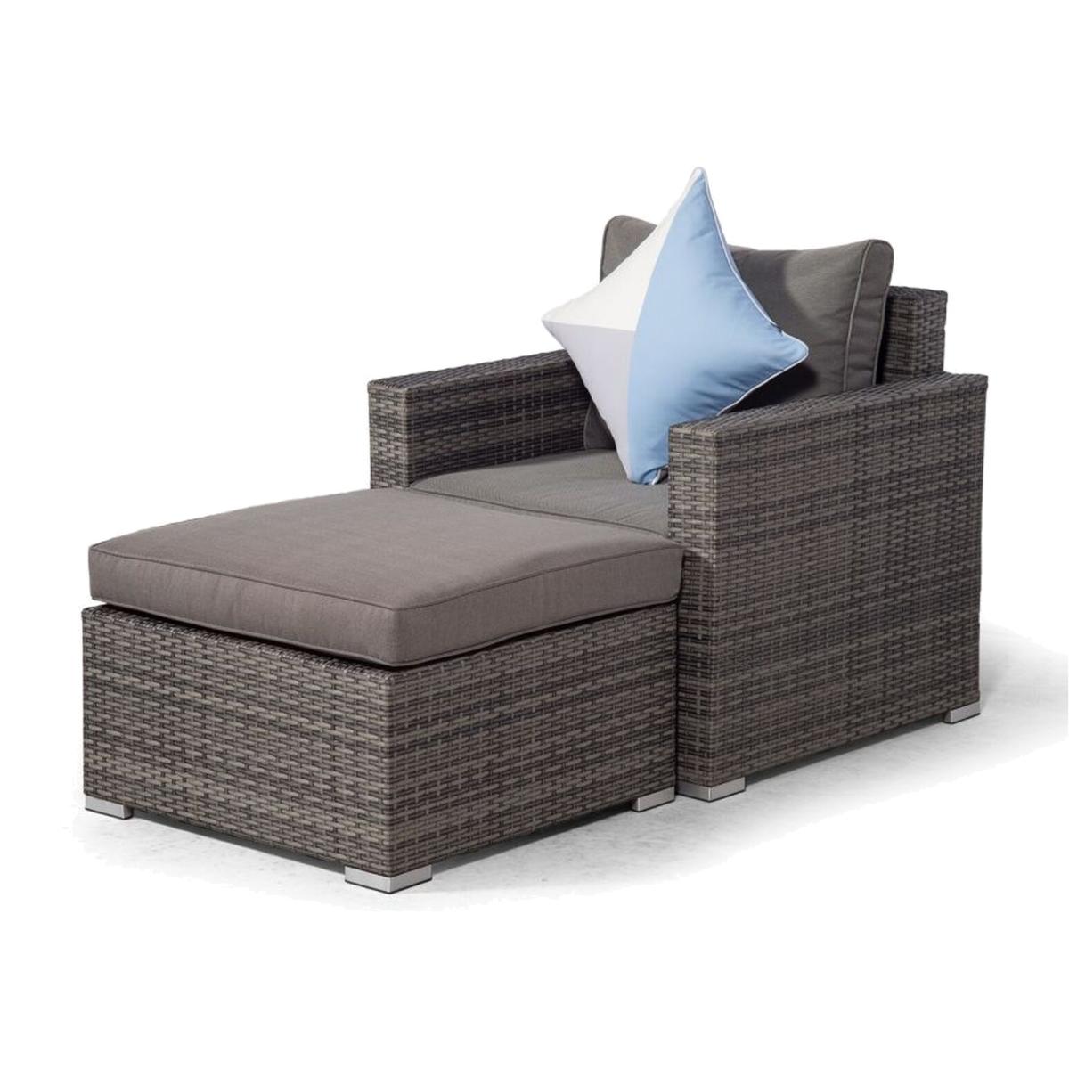 Stylish and compact, the Sydney rattan armchair and ottoman set features a pouf that can be used as a footrest and also comes with a spare glass top to convert it into a coffee table. This stylish rattan lounge set is available in an ultra stylish mixed grey or the stunning mixed brown rattan weave and is suitable for indoor and outdoor use. Giardino rattan garden furniture features multi-density foam and fiber padded cushions making this outdoor rattan chair set super comfortable. Featuring 10cm thick seat and ottoman cushions and 20cm thick back cushion, the multi density fillings enhance the cushions by providing comfort and support to your rattan lounge chair set. Giardino rattan garden furniture is made using aluminium frames and polyethylene all weather rattan, making this outdoor rattan chair strong, light-weight and corrosion resistant. The armchair and stool come fully assembled and the impressive synthetic wicker furniture material is UV resistant, able to withstand temperatures from -15 degrees celsius to 60 degrees celsius. Our special water-resistant fabrics protect your rattan garden set cushions from showers with all cushions featuring easily removable zip-off covers for easy maintenance. The Sydney armchair set is designed to be left outdoors all year round without the need for covering, however it comes complete with a high quality weather-proof covers to keep dust and leaves away during winter months. A damp cloth or garden hose is all that's needed to maintain this rattan furniture. At Thats Furniture, we pride ourselves on meeting all our customers individual needs. Along with our impeccably designed outdoor furniture, our dedication to customer satisfaction means our rattan garden furniture comes with a full 12-month manufacturers warranty and 5 year extended warranty on the internal frames, backed by our no quibble 30 day money back guarantee so you can buy your garden furniture with complete confidence.p