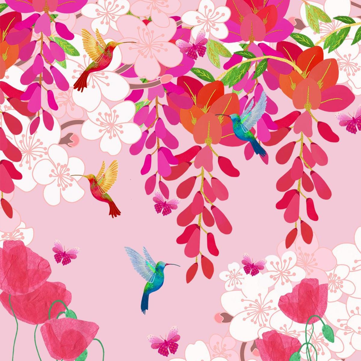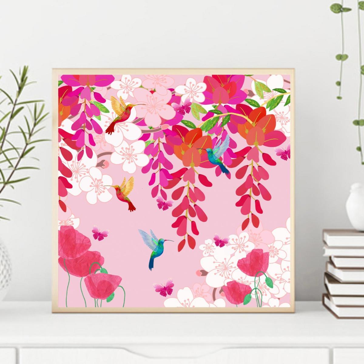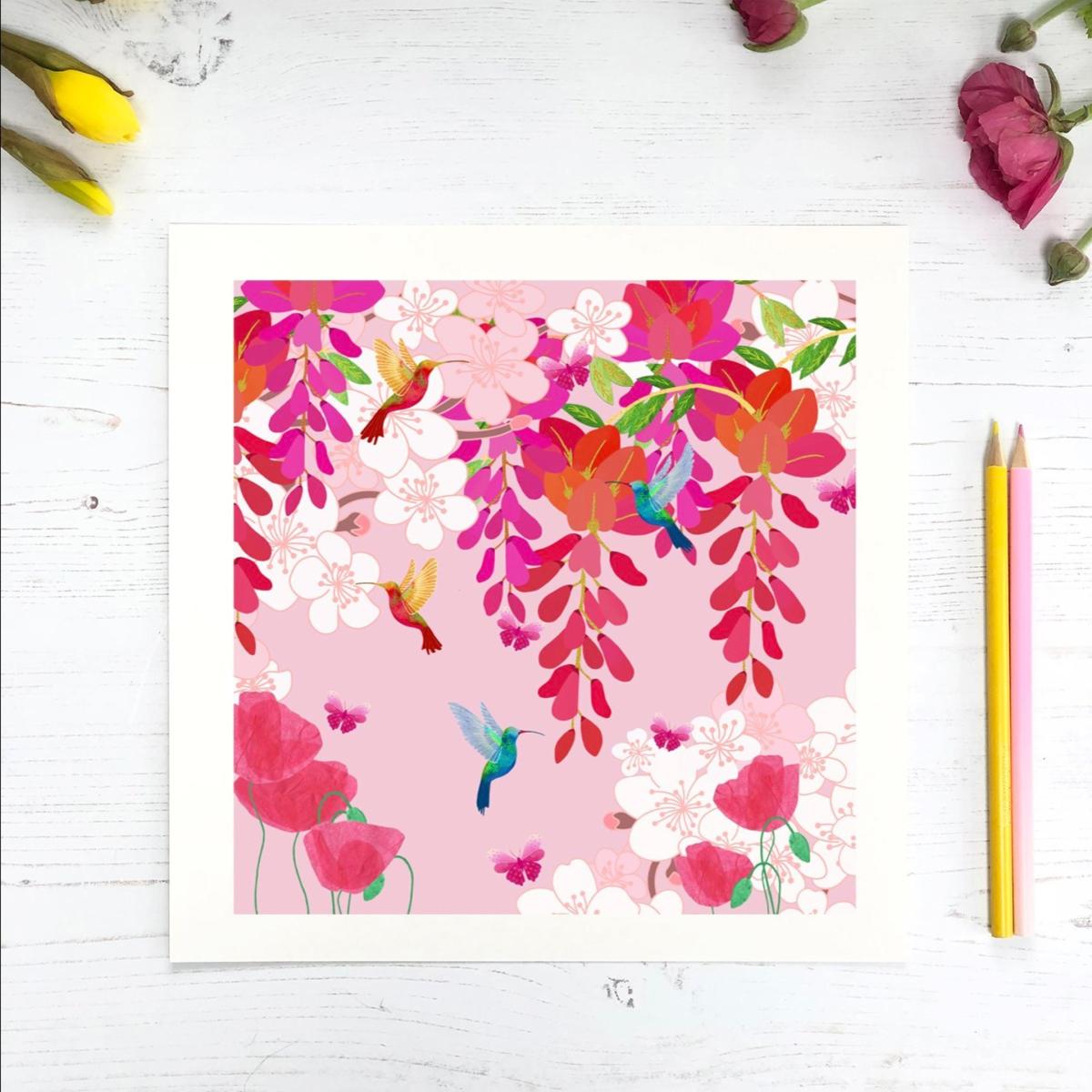 These stunning Giclee prints are printed on soft textured 310 gsm fine art paper. Giclee prints offer a superior quality than any other as the process allows the print to hold its colours for much longer, therefore preserving the details for a lifetime. The colours are wonderfully vibrant, and as a framed wall hanging they will make an impact in any room or office. This soft, blush pink print does just what the title says - fills you with colourful hugs. Exquisite little hummingbirds and butterflies flutter amongst these delicate florals that are softly balanced against a blush backdrop. Each print is signed, and will be carefully packaged with a backing board so that it will not be damaged in the post.