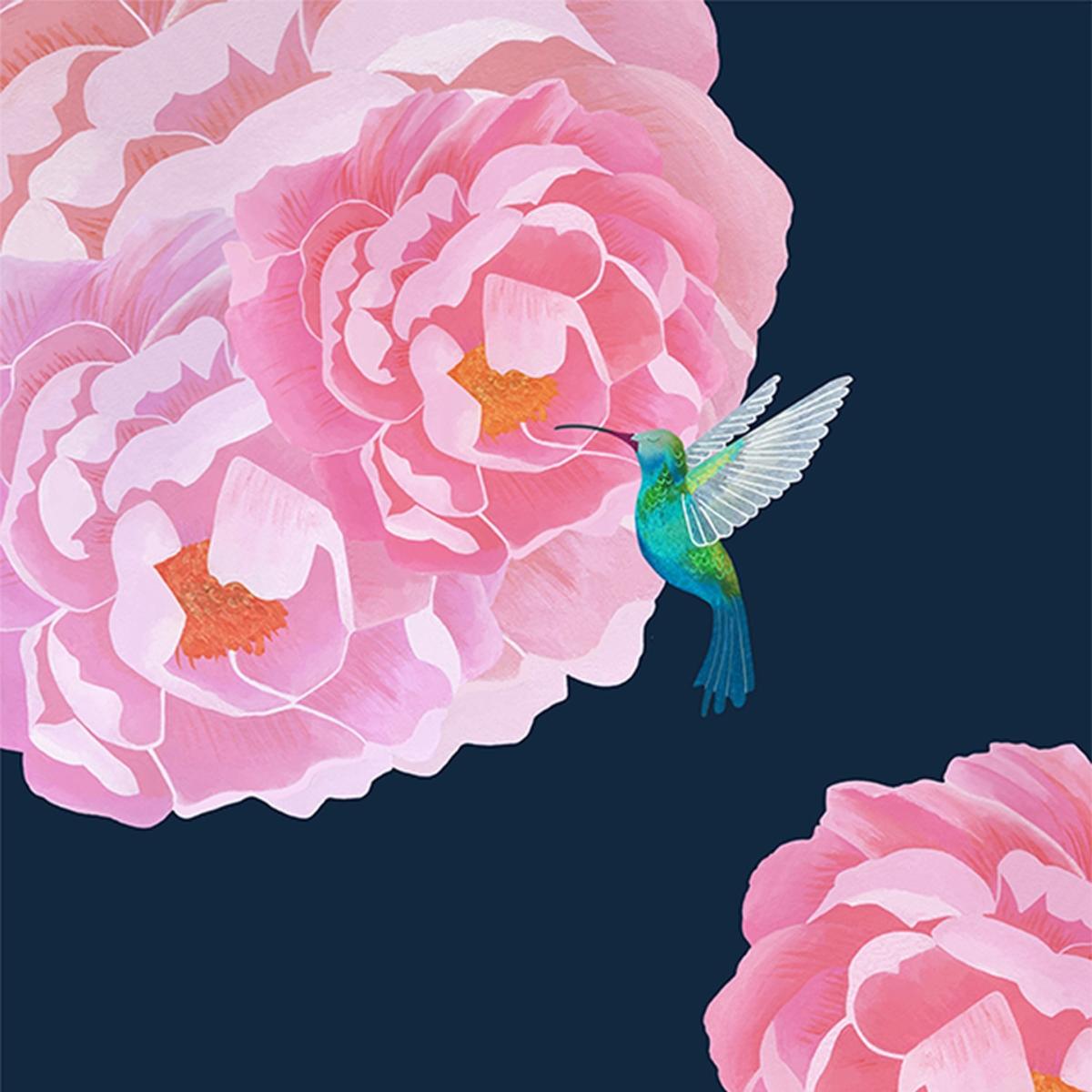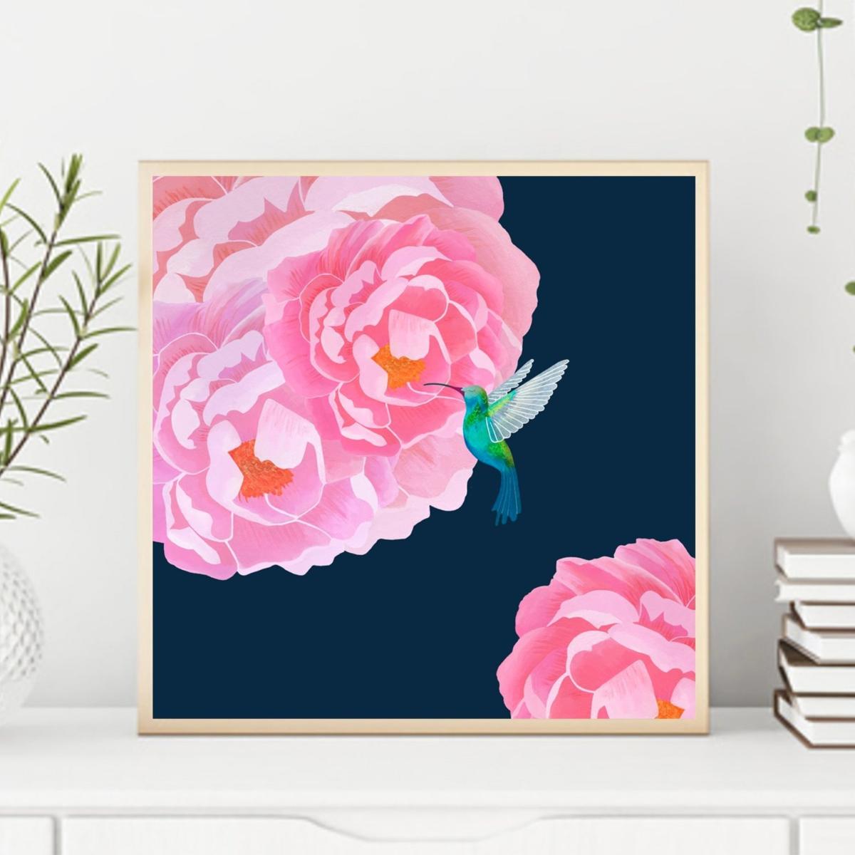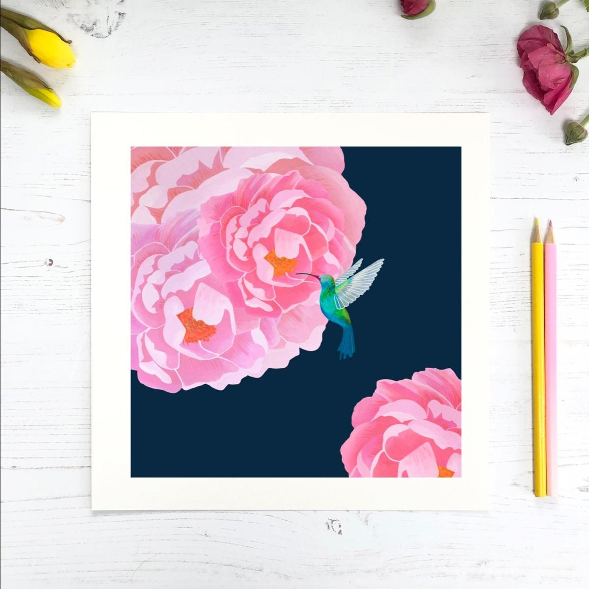 These stunning Giclee prints are printed on soft textured 310 gsm fine art paper. Giclee prints offer a superior quality than any other as the process allows the print to hold its colours for much longer, therefore preserving the details for a lifetime. The colours are wonderfully vibrant, and as a framed wall hanging they will make an impact in any room or office. The hummingbird, a symbol of joy, life and positivity. This jewel coloured hummingbird surrounds itself in the petals of stunning pink peonies. Each print is signed, and will be carefully packaged with a backing board so that it will not be damaged in the post.