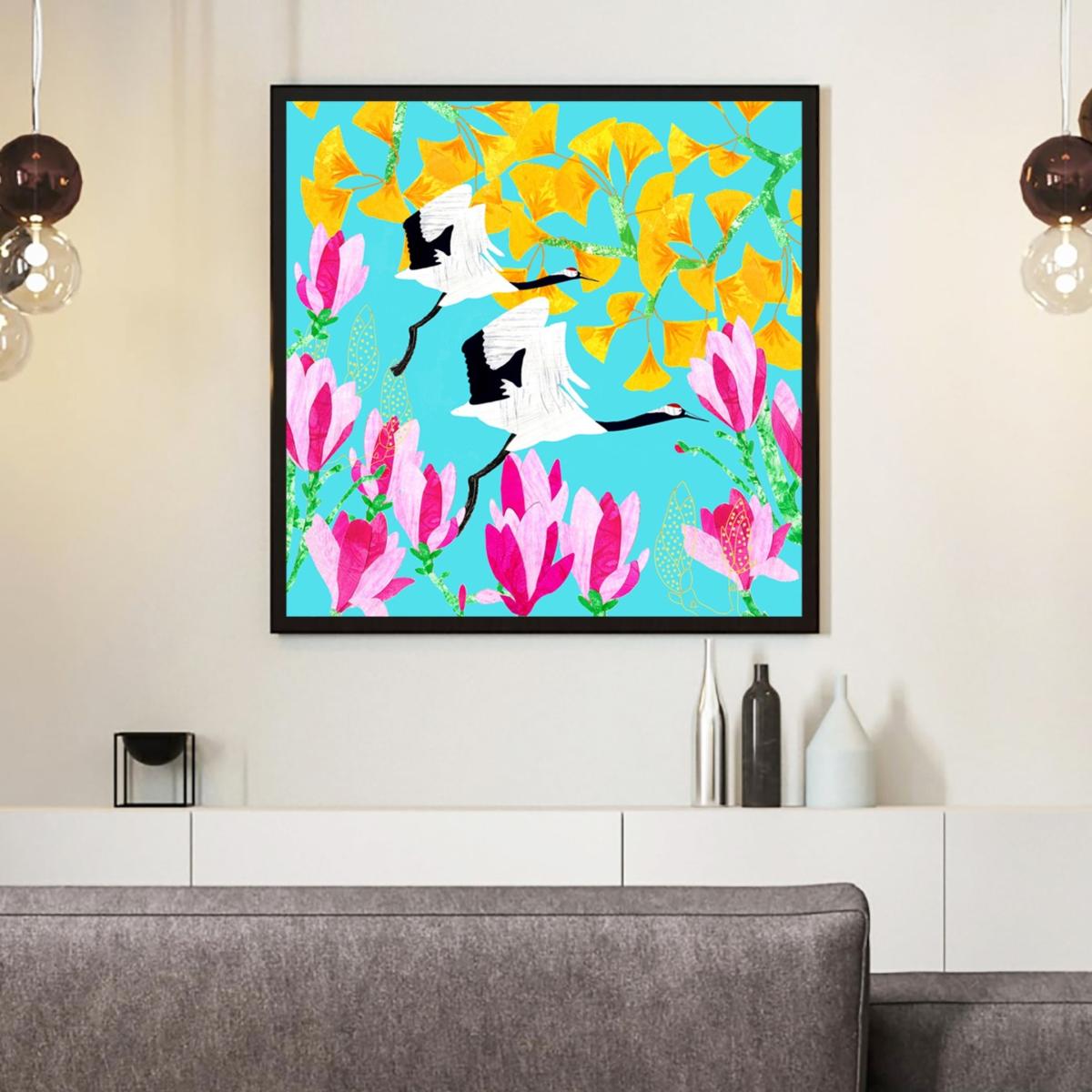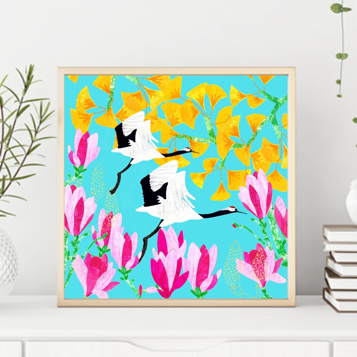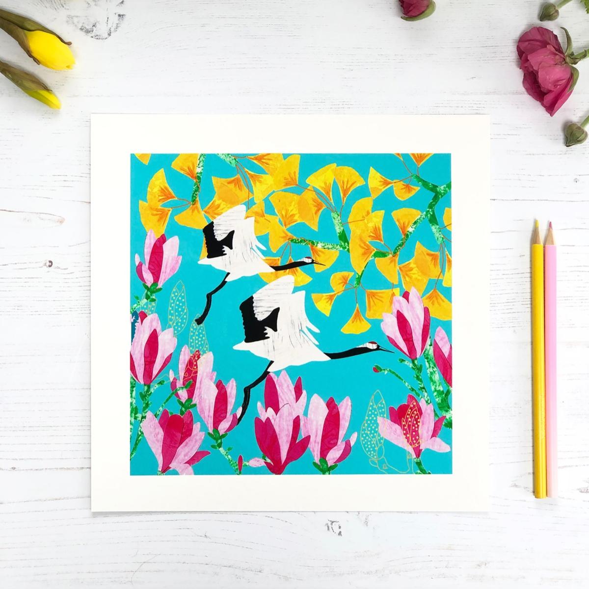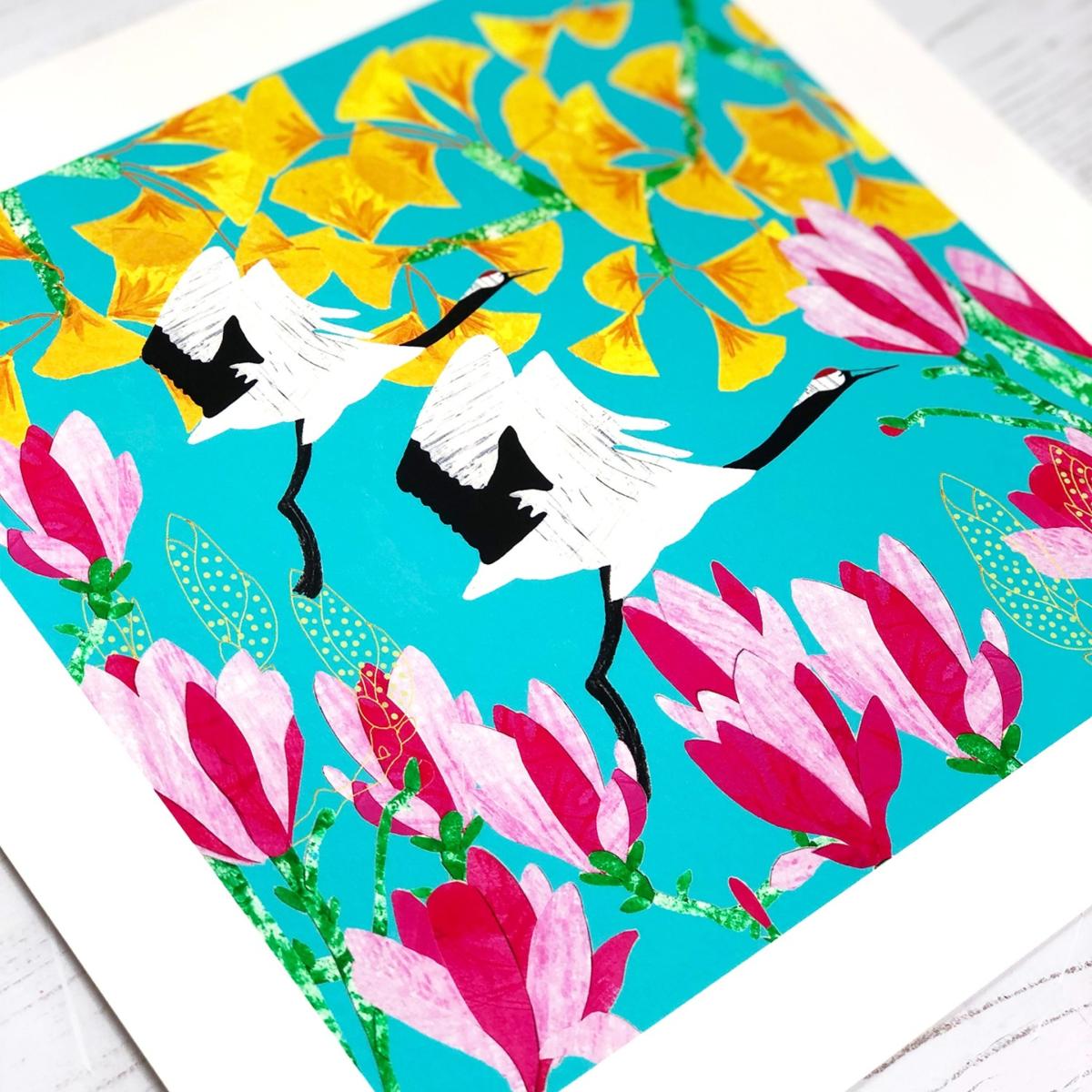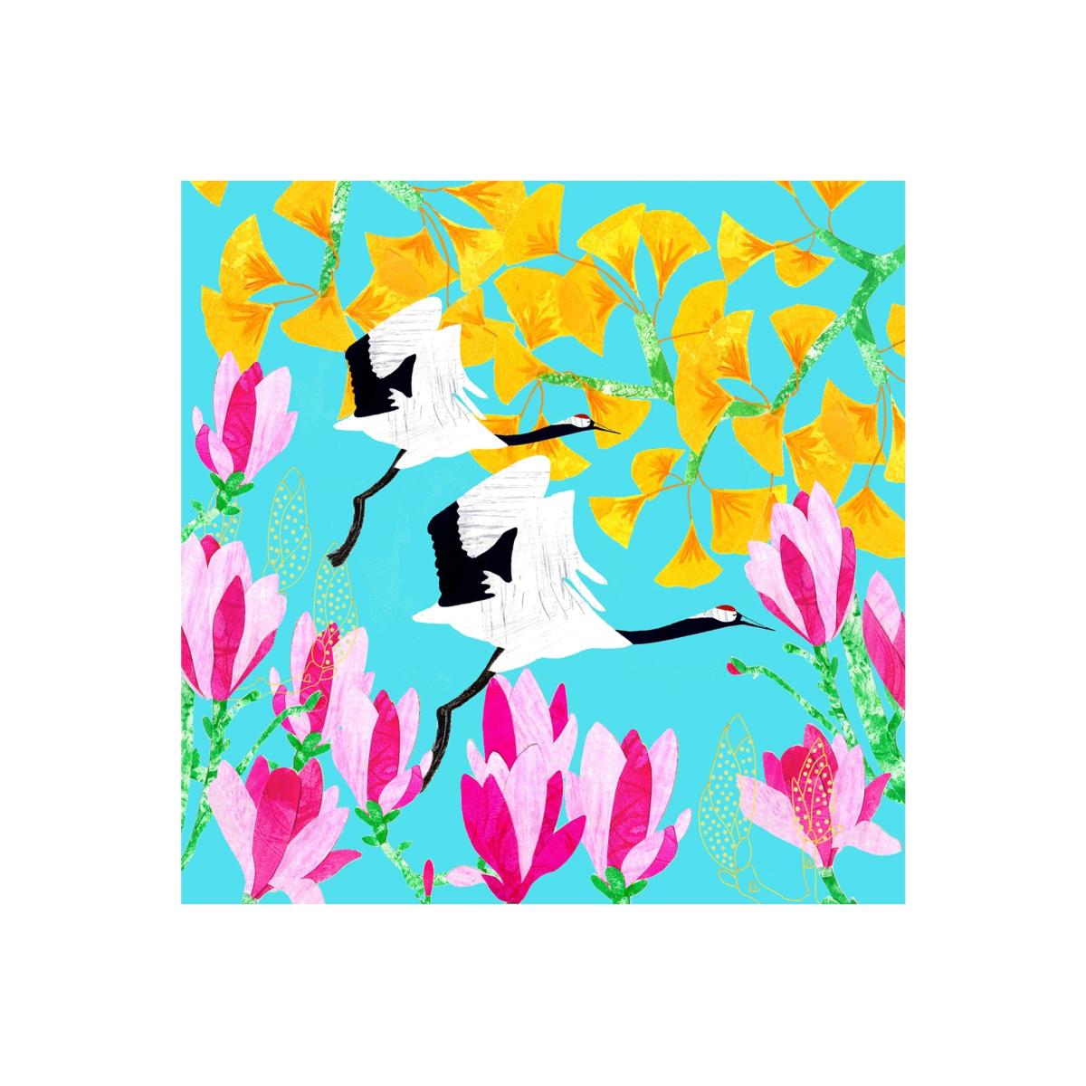 These stunning Giclee prints are printed on soft textured 310 gsm fine art paper. Giclee prints offer a superior quality than any other as the process allows the print to hold its colours for much longer, therefore preserving the details for a lifetime. The colours are wonderfully vibrant, and as a framed wall hanging they will make an impact in any room or office. Against a beautiful blue sky, the iconic red crowned crane flies gracefully amongst golden yellow ginkgo leaves and pink magnolia. Each print is signed, and will be carefully packaged with a backing board so that it will not be damaged in the post.