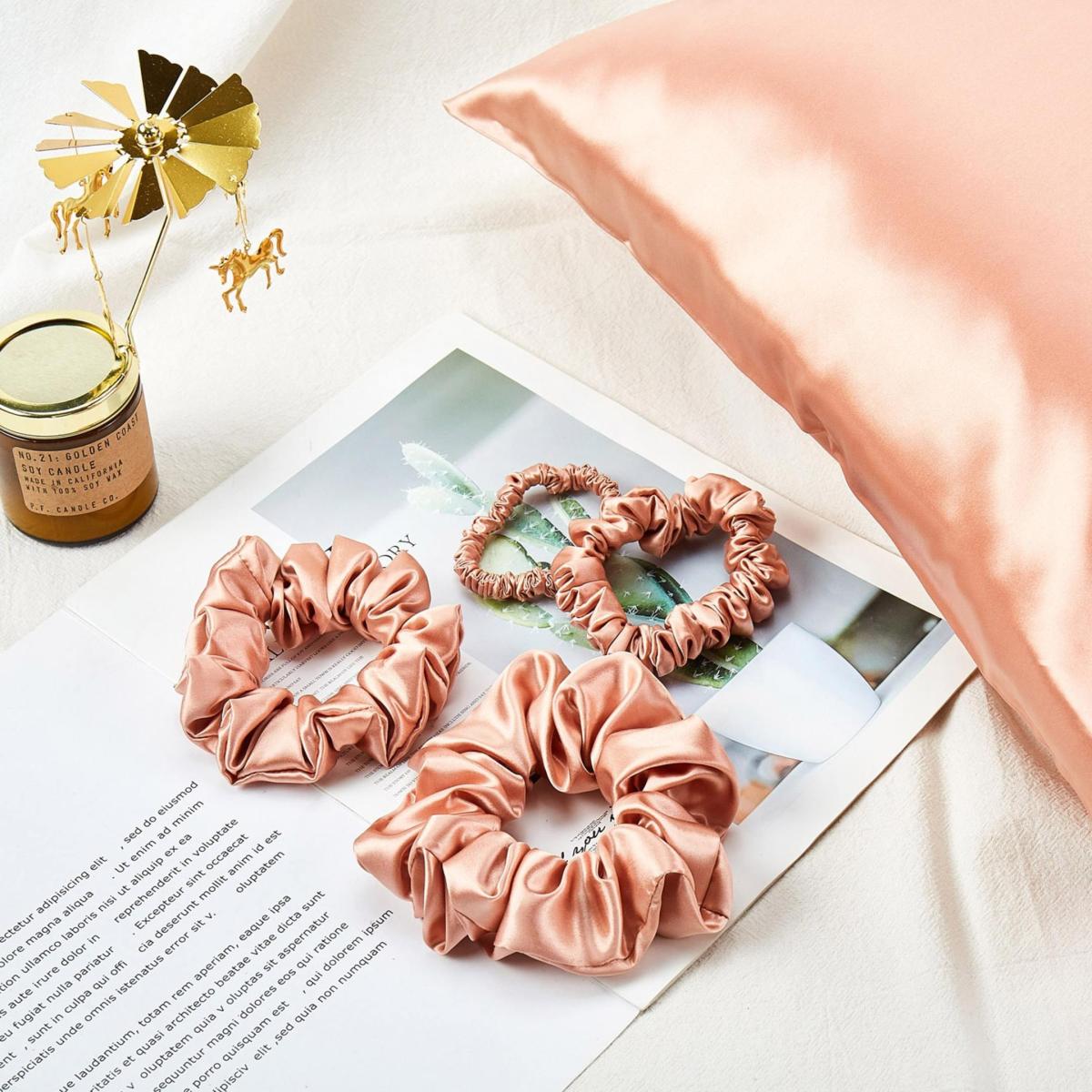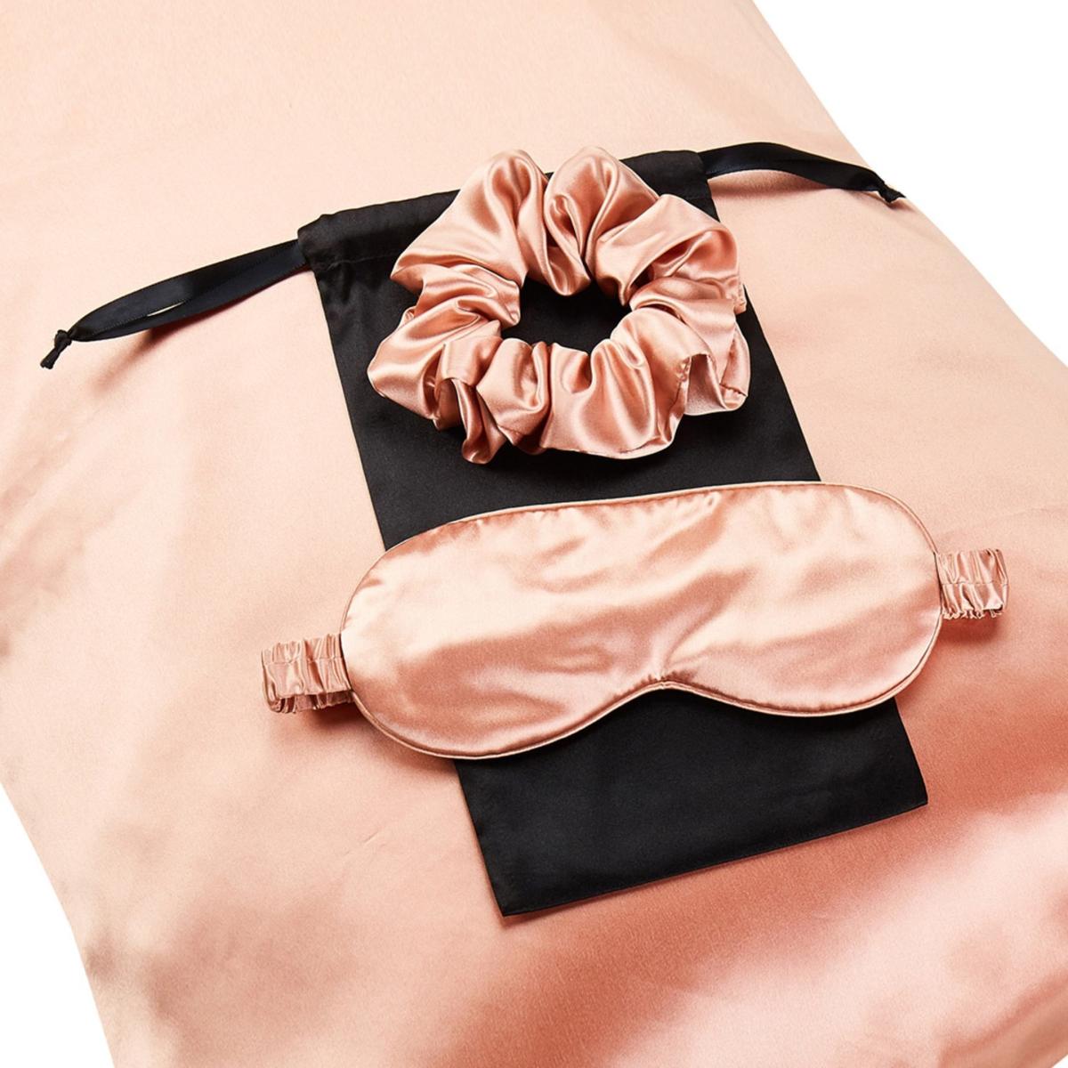 This is the gift set for someone whom you truly care about. With sumptuous silk, you are sending her the gift of hydrated hair, smooth skin, and night after night of peaceful sleep. Imagine her smile as she reaches back to tie her hair each morning. We strive to meet the best standards on the market, choosing quality tested, Grade 6. A pure mulberry silk and plant-based dyes. Even our eye masks are filled with long strands of mulberry silk, softly stroking her eyes to a sweet slumber. Designed in Toronto. You will receive: One pillowcase One eye mask Four scrunchies: 0.4, 0.8, 1.4 and 2 inches Material 100% long strand mulberry silk 22 momme (600 thread count) Extra shiny silk charmeuse Grade 6a (highest grade) Non-toxic dyes