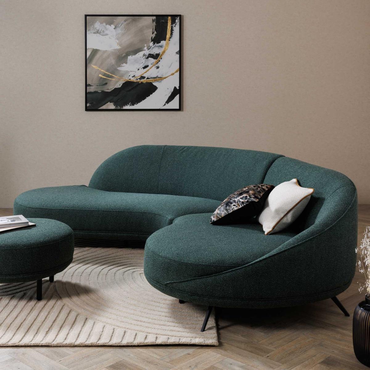 I love this Gigi corner sofa for its versatile, contemporary design and rich green fabric, which adds a touch of colour without overwhelming a space. It works particularly well in modern or eclectic interiors and pairs beautifully with neutral tones or earthy palettes. Practical styling tips include adding layered cushions for extra comfort, and pairing it with a bold or textured rug to ground the space. The round ottoman is ideal for flexible use - whether as a footrest, side table, or extra seating - making this set both functional and stylish. Its sleek legs lend a minimalist feel, so it suits open-plan living areas or cosy corners alike. This sofa is a great investment piece that balances comfort, style, and versatility.