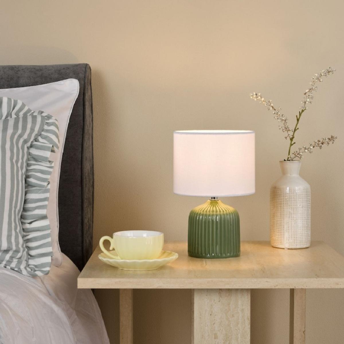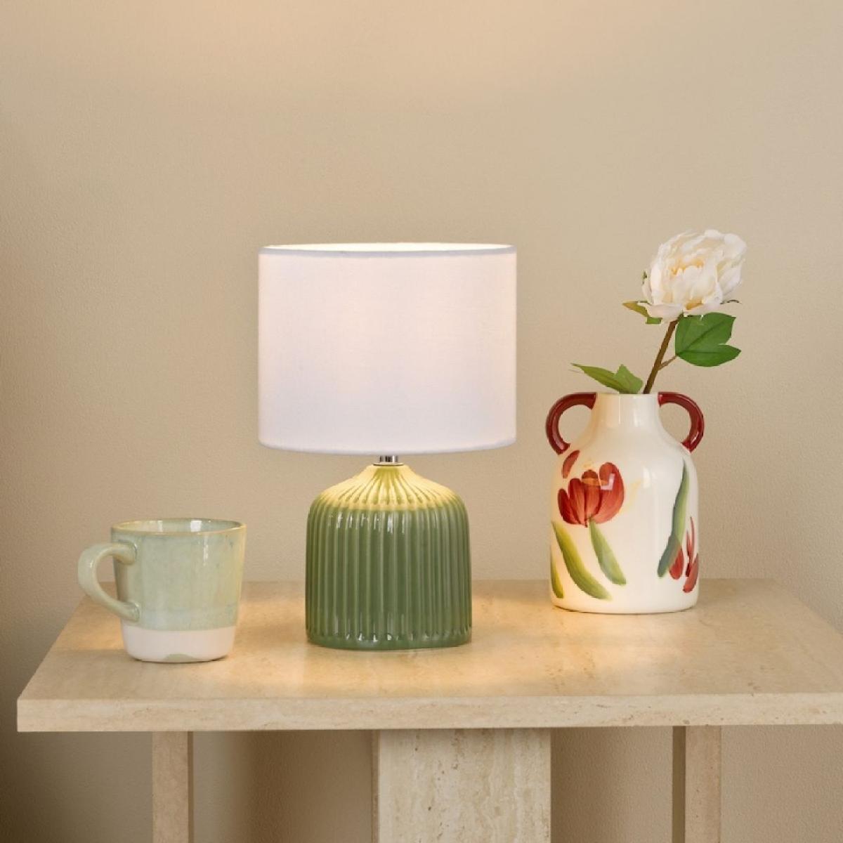 The Gigi table lamp set offers compact style and contemporary charm, featuring a ceramic base with a soft ribbed motif in verdant green, complemented by a white linen shade and finished with a luxury green braided cable and inline switch. Designed for use with frosted LED golf ball bulbs, they provide a warm, inviting glow ideal for creating atmosphere in smaller spaces. Perfect for matching bedsides, spare rooms, or compact areas such as corner shelves, the Gigi lamps blend practicality with subtle elegance, suiting both farmhouse-inspired and modern interiors.