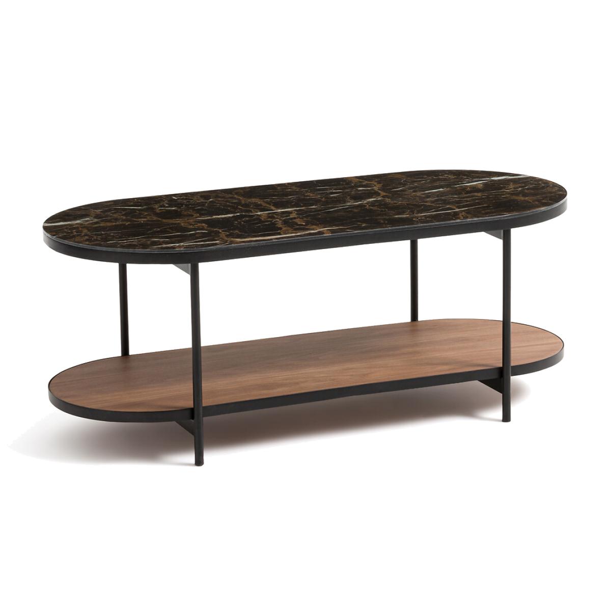 I love this coffee table for its sleek combination of marble effect glass top and warm wooden lower shelf, which adds sophisticated texture to a variety of interiors. It works particularly well in contemporary spaces, especially those with neutral palettes or subtle metallic accents, where it can serve as a statement piece without overpowering the room. Practical styling tips include pairing it with minimalist accessories like a modern vase or a stack of coffee table books, and placing it in a setting with light-toned upholstery or soft textiles to balance its darker marble top. Its open design also encourages easy styling and can help small spaces feel more open and welcoming.