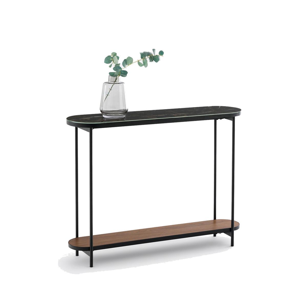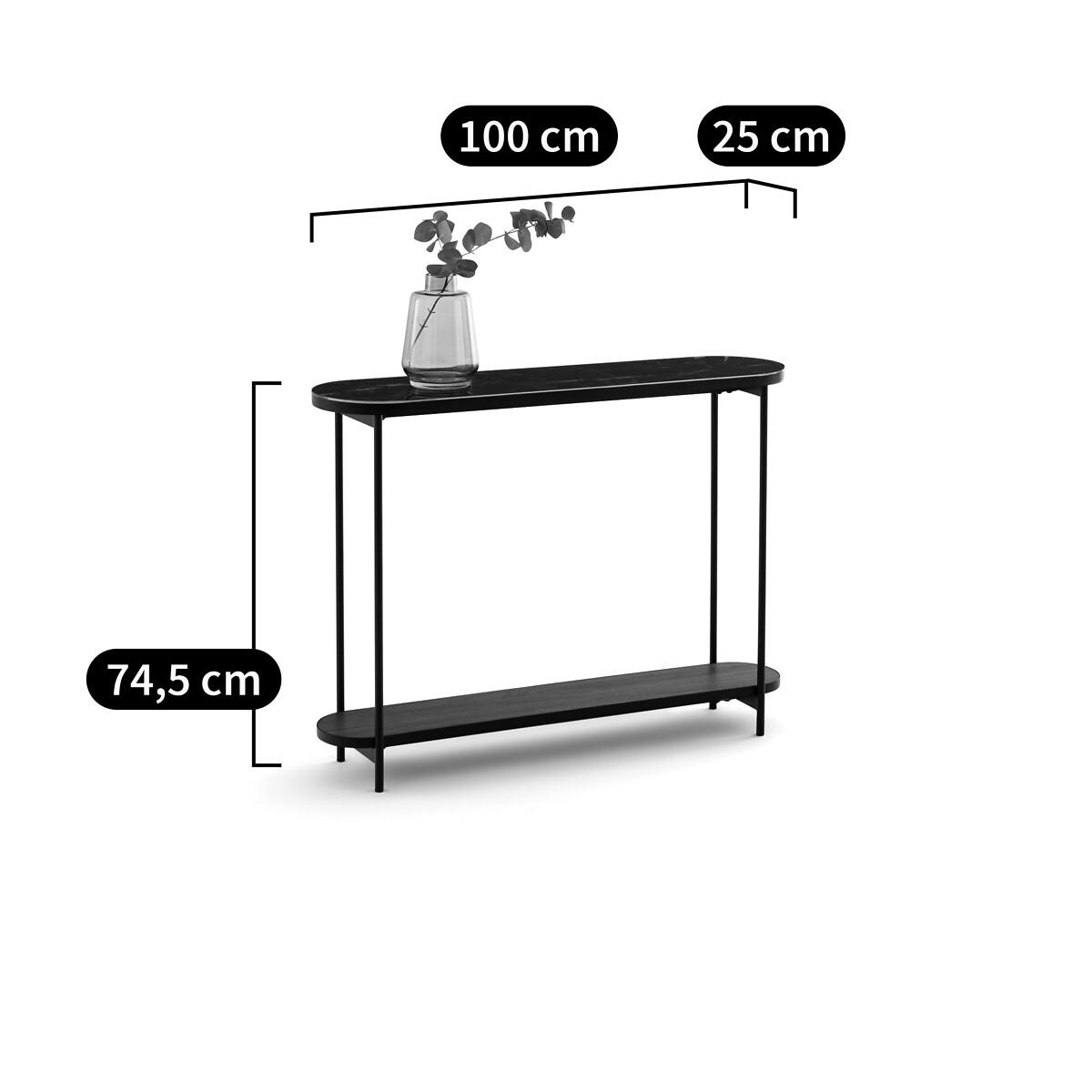 I’m a fan of this console’s slim profile and mixed materials - the marble-effect glass top feels more durable than real stone, while the black metal frame keeps the look light. The lower wood shelf adds warmth and extra storage without bulk, making it ideal for narrow hallways, compact living rooms or behind a sofa. To style, start with a round or rectangular mirror hung just above to bounce light. Keep the top simple - perhaps a pair of slender table lamps or a small tray for keys and everyday bits, plus a single vase of foliage. On the shelf below, stack a few coffee-table books or tuck in low baskets to tidy away scarves or mail. Finish with one or two small objects in complementary tones to tie it all together.