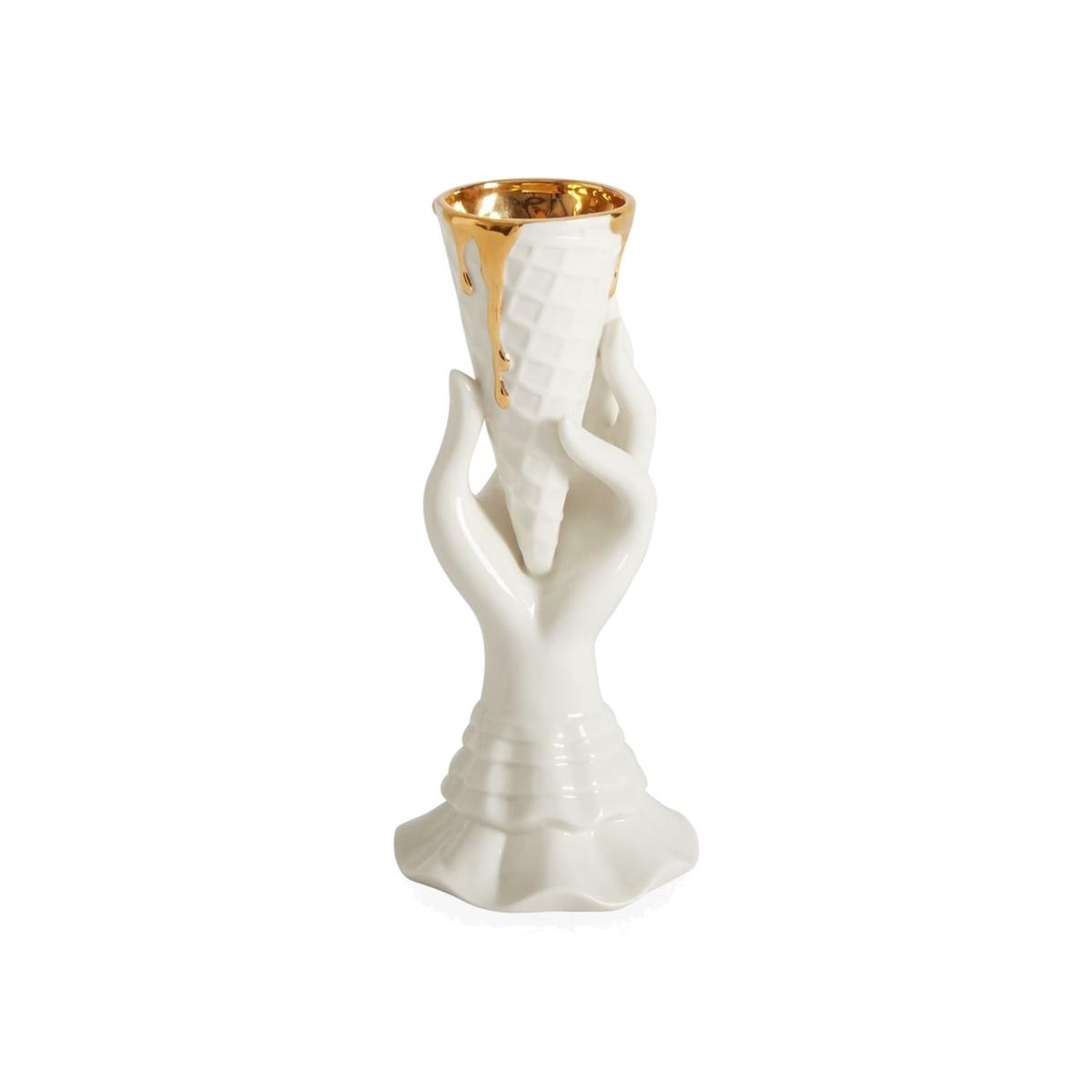 I love how this ice-cream vase adds a touch of wit and polish in one small piece. The glossy white form with its gold-leaf interior fits neatly into contemporary, minimalist or even Art Deco-inspired rooms, yet it’s equally at home in an eclectic display of objet d’art. For practical styling, pair it with a single dried stem or a sculptural branch rather than a full bouquet, and set it on a stack of coffee-table books or a slim hallway console. Its compact size makes it ideal on a desk, bathroom shelf or mantel, bringing just the right amount of personality without crowding the space.