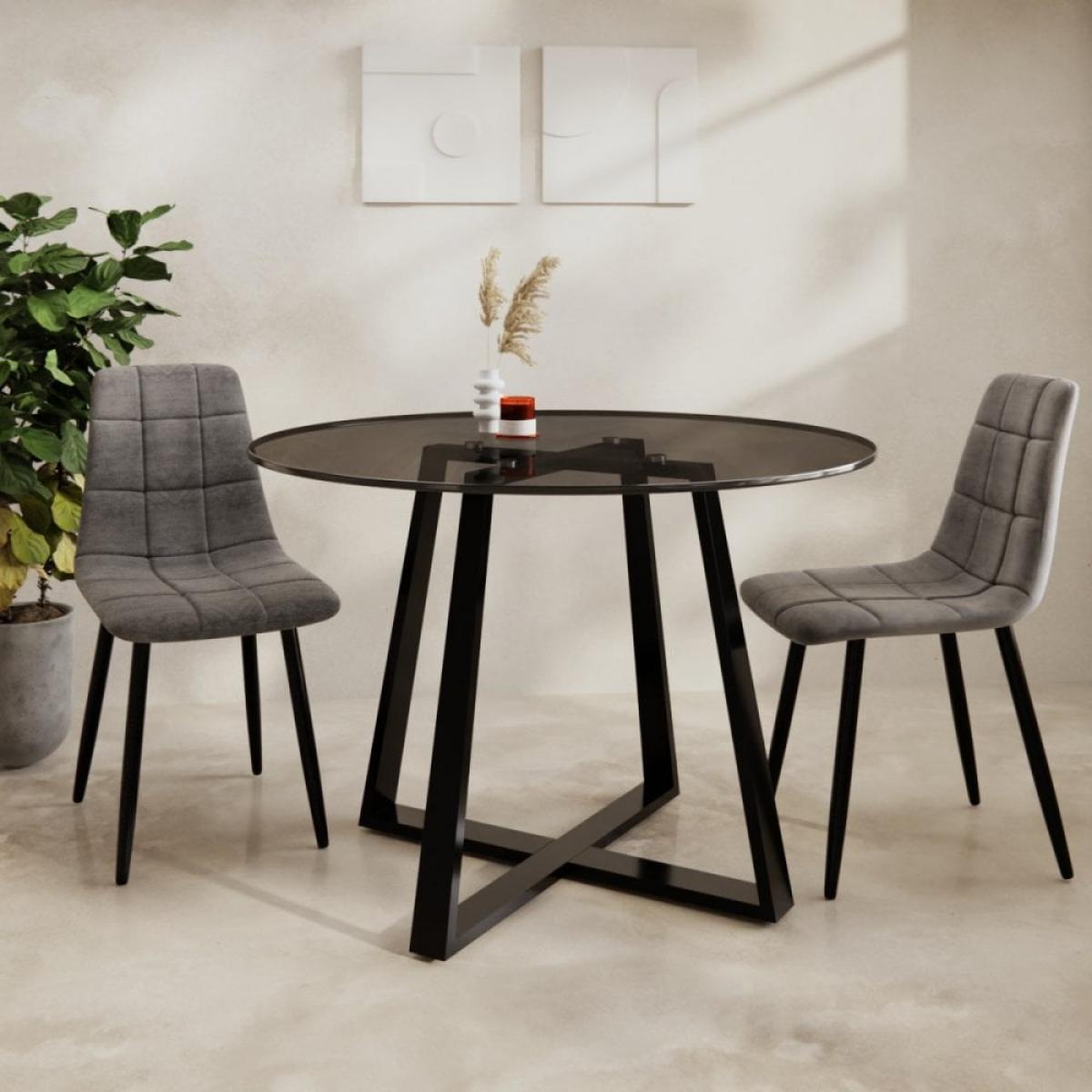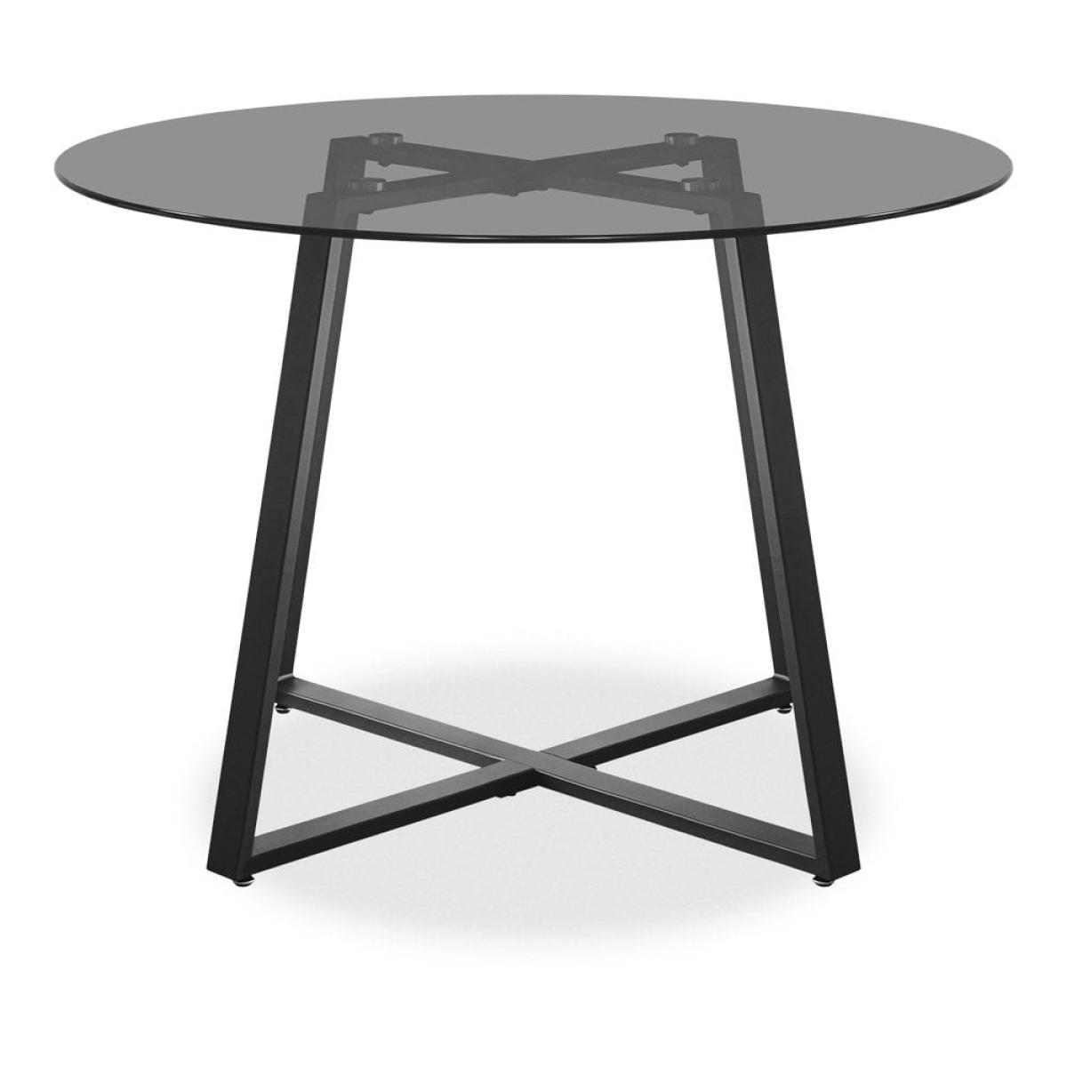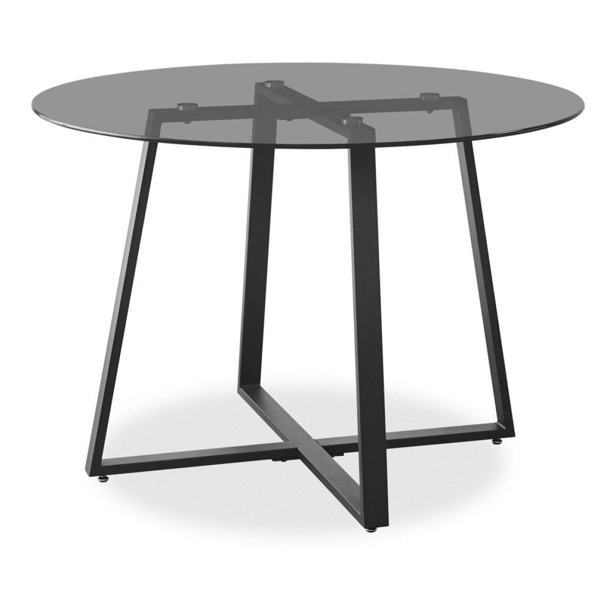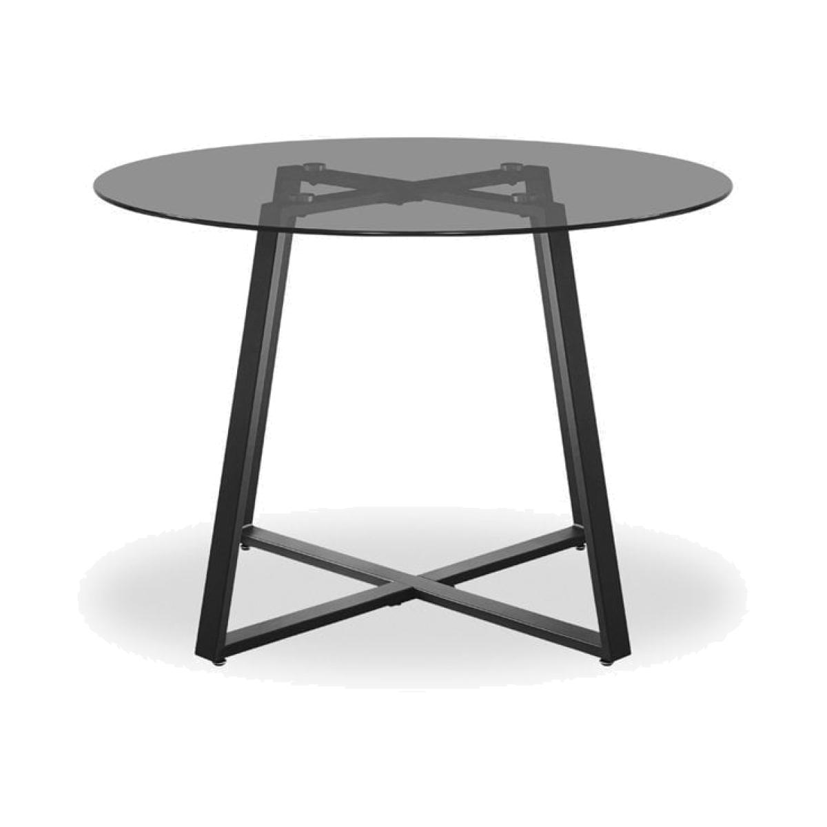 Gather around the Giles dining table for 4. With a round smoked glass top and a sleek, criss-cross black base the Giles a sculptural focal point for your kitchen or dining room. Showcasing a contemporary design that will add an elegant touch to your dining space.