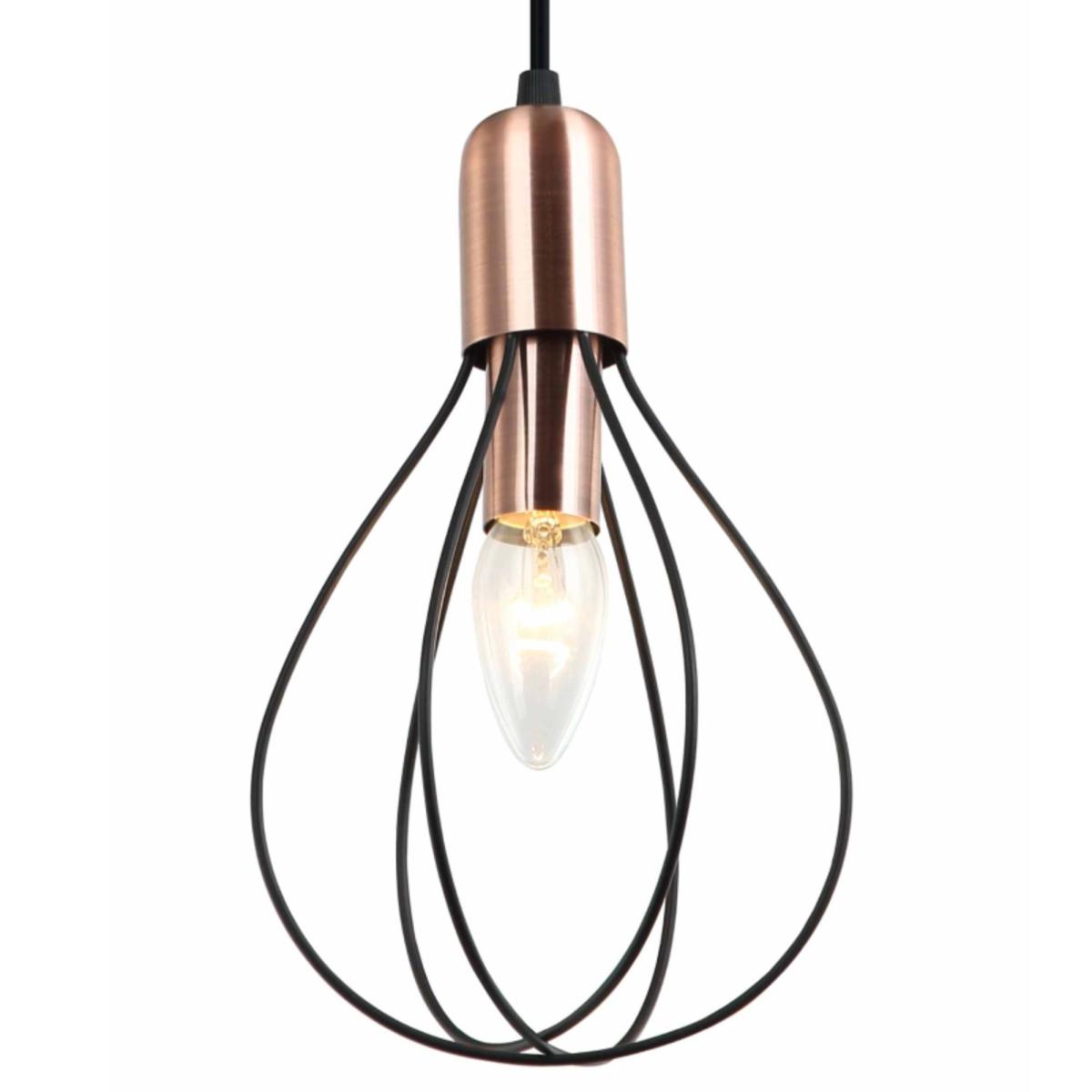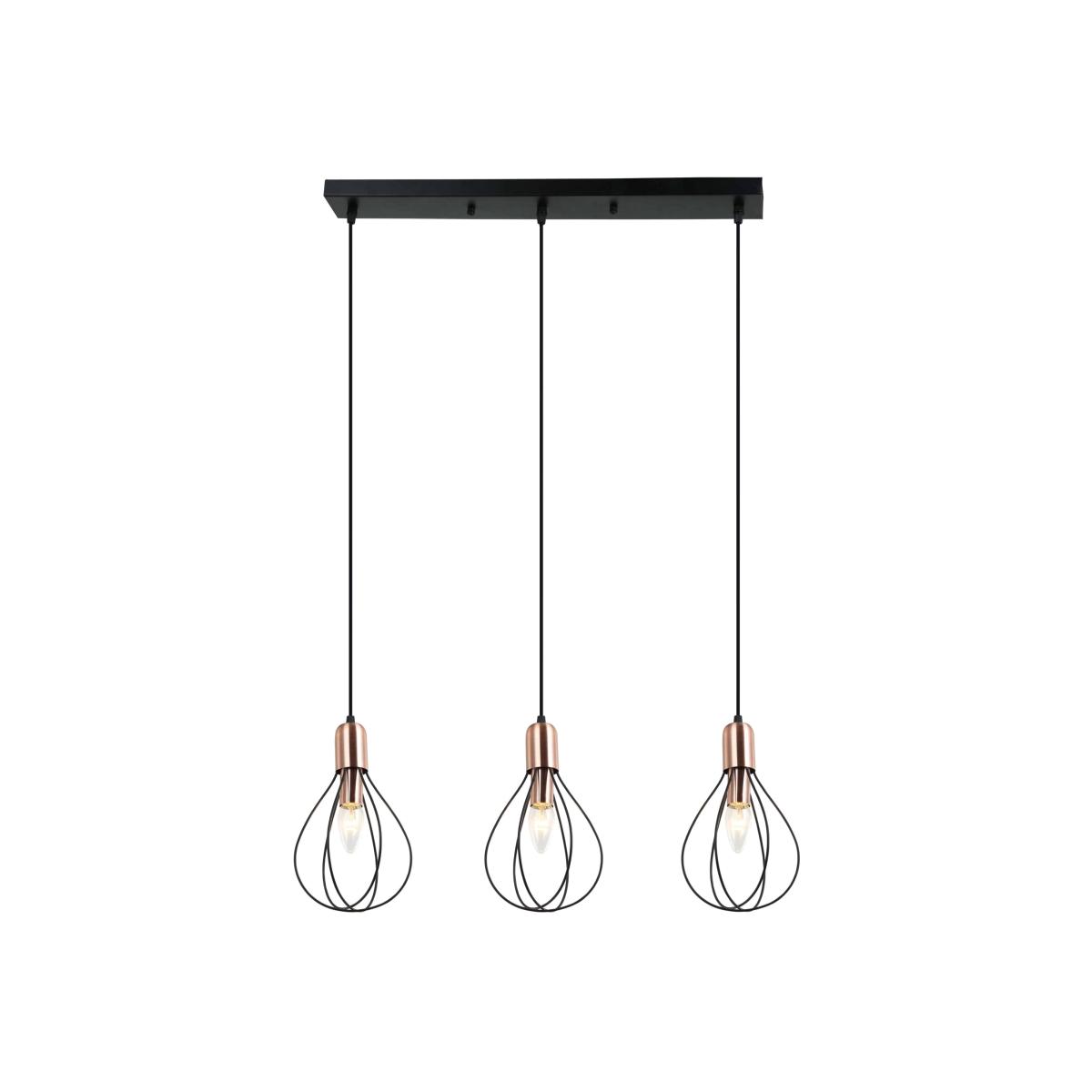 Contemporary pendant ceiling light bar boasting a black and copper finish. A modern addition to your living space, the Gilles 3 Light is a stylish piece, exclusive to Pagazzi. Boasting 3 wire shades suspended from a matt black flex, the industrial-inspired design is complete with copper detailing. Height adjustable by altering the length of the black flex, it is perfect for creating a statement above your dining table or breakfast bar in modern living areas. Pair this light with our 4w LED Vintage bulbs for a rustic and industrial glow to compliment the copper detailing.