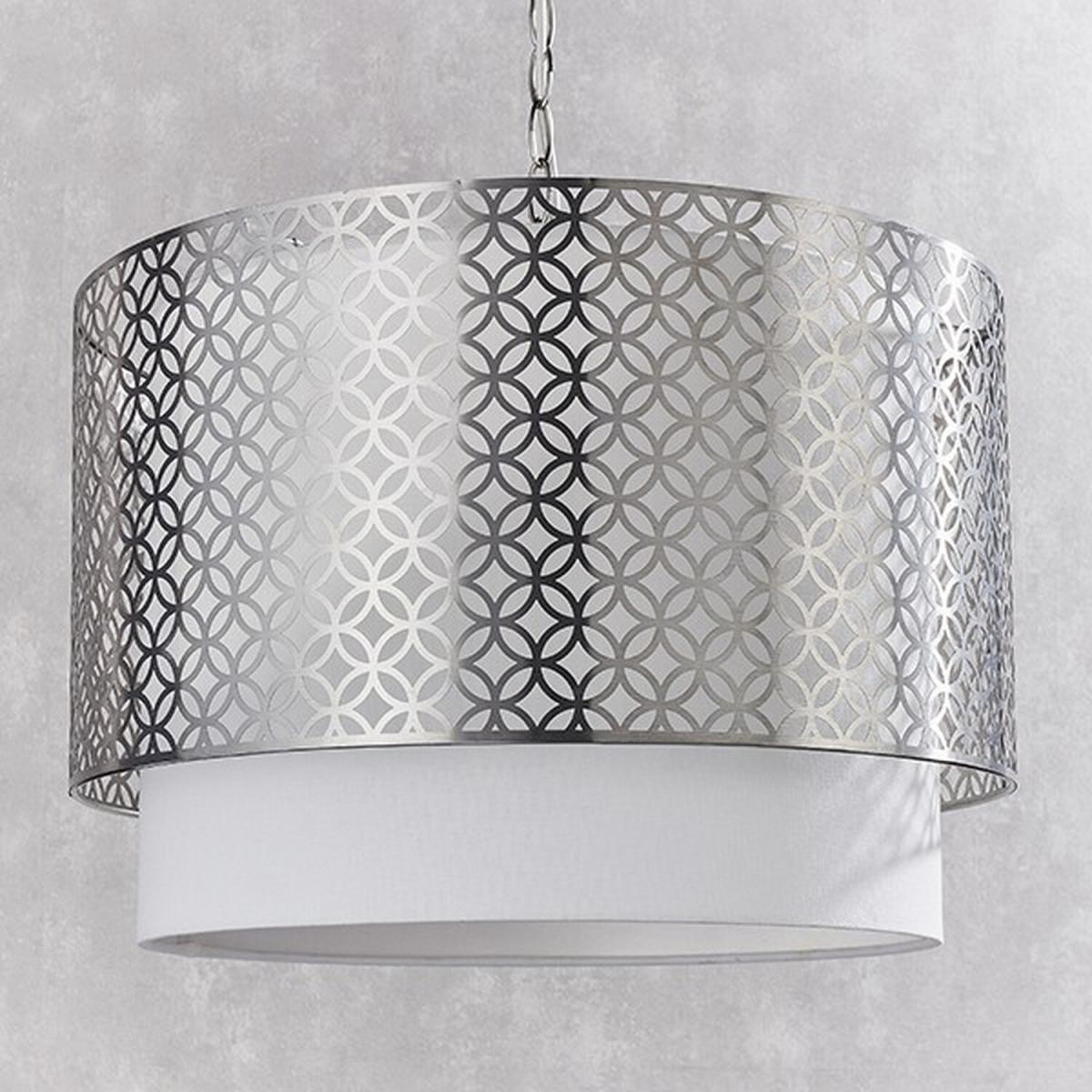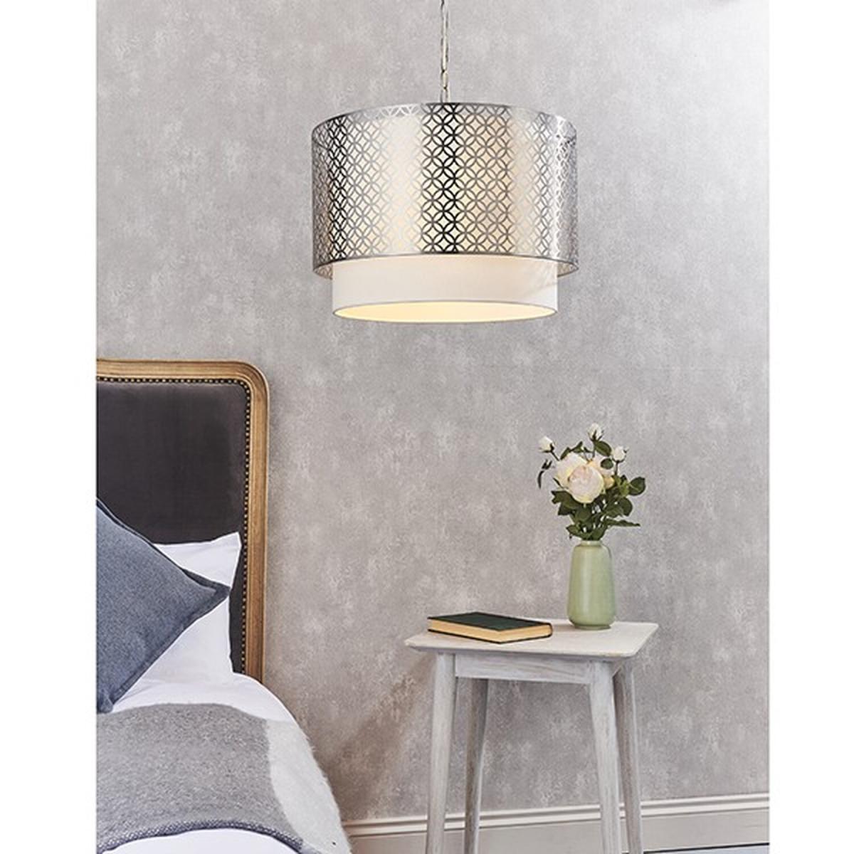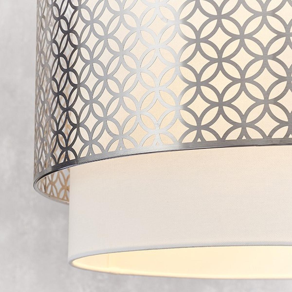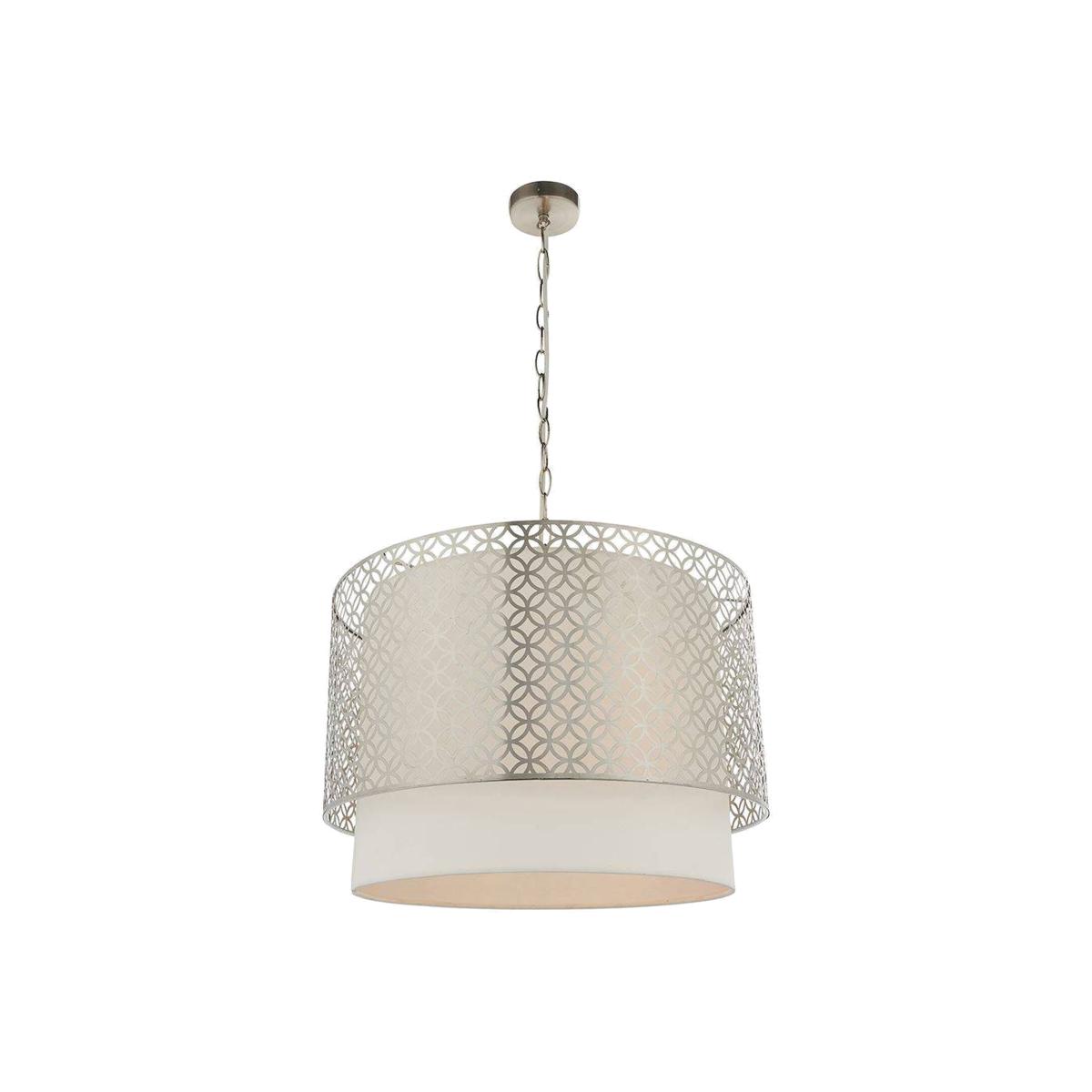 A beautiful layered 2-tier single pendant. The inner vintage white linen shade is framed by a decorative metal satin nickel shade, both combine to create a soft diffused light effect.