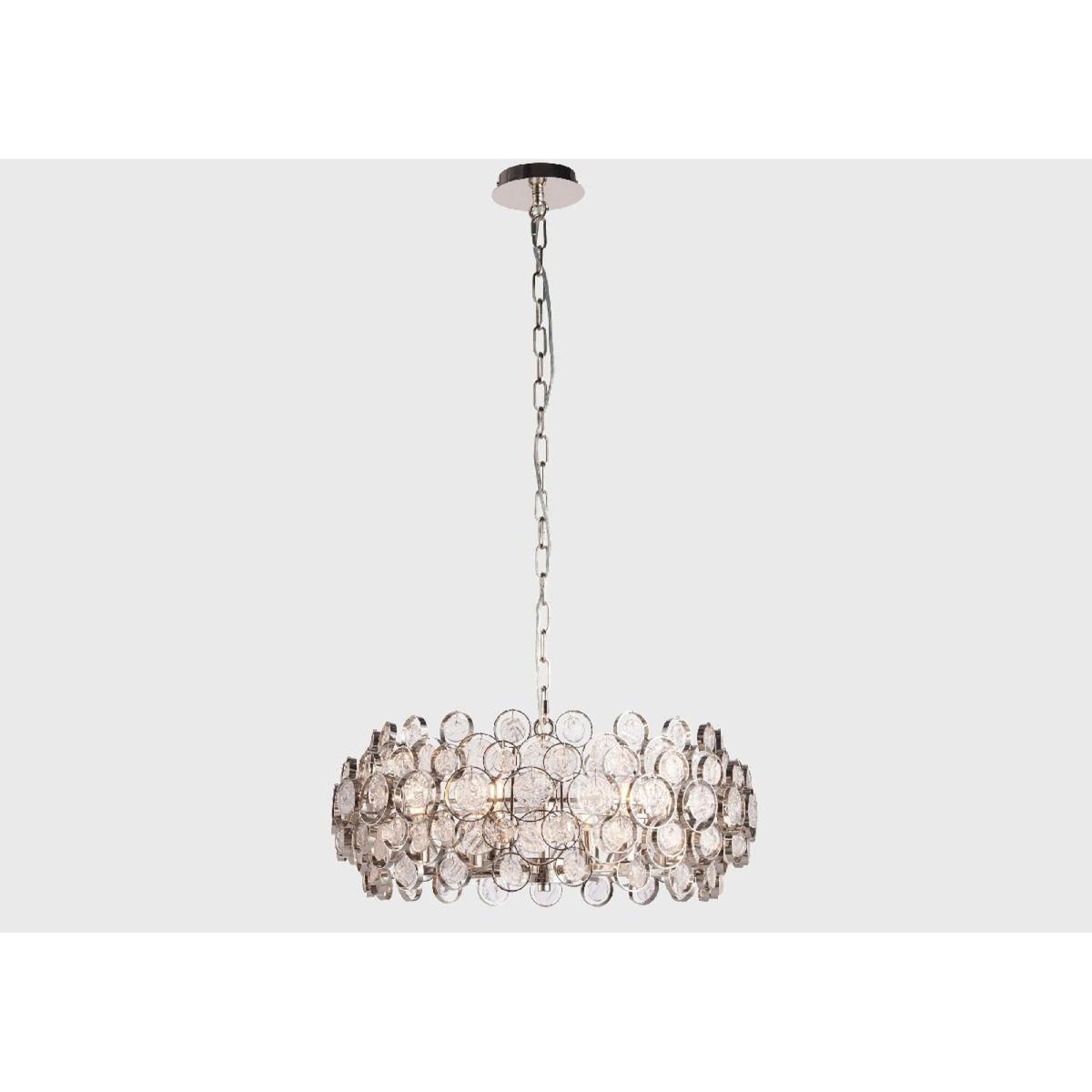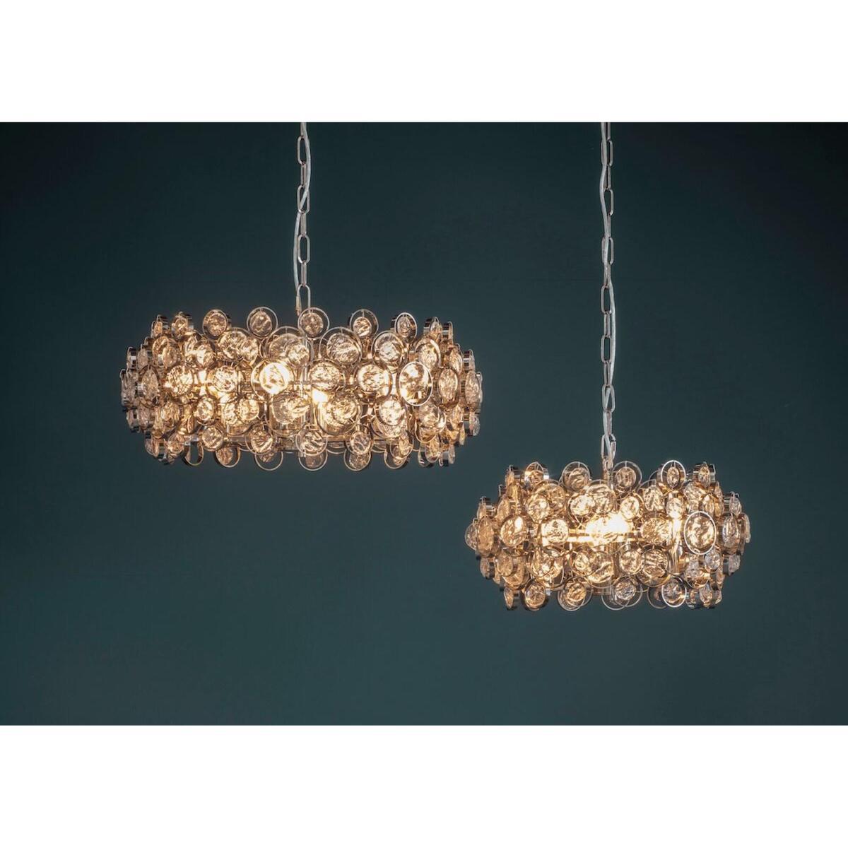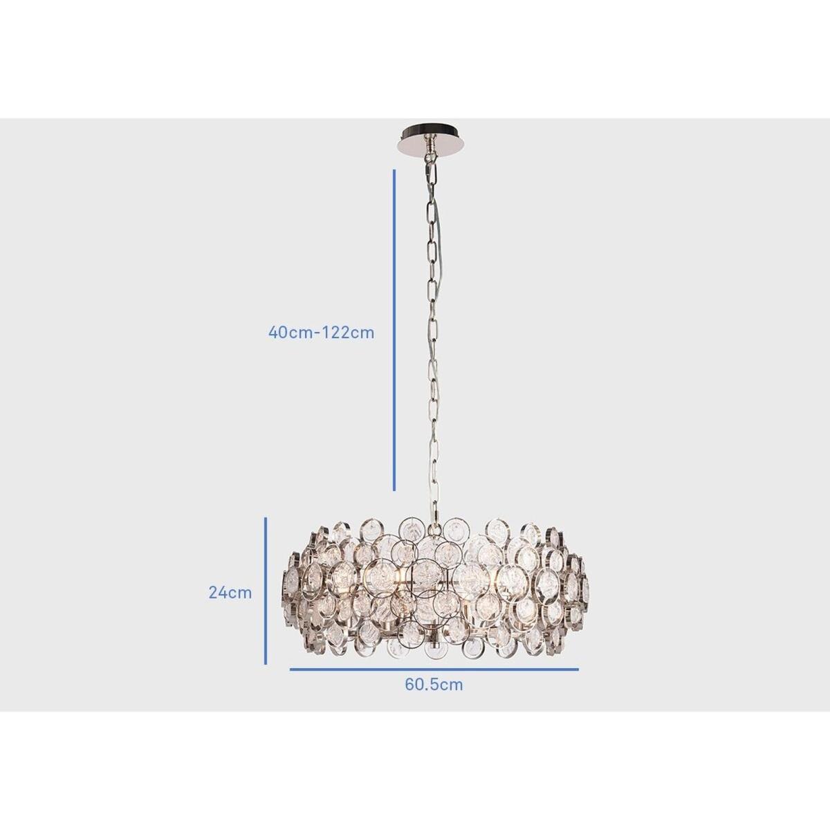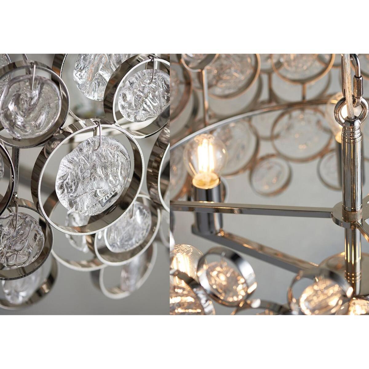 Make a grand statement with the Gillian pendant. This chain light fitting has an ornate design, decorated with handmade glass medallions that are encased in nickel-finished rings for a shimmering contrast. Let the Gillian shine by placing it low above a side table for a warm glow that will steal the show.