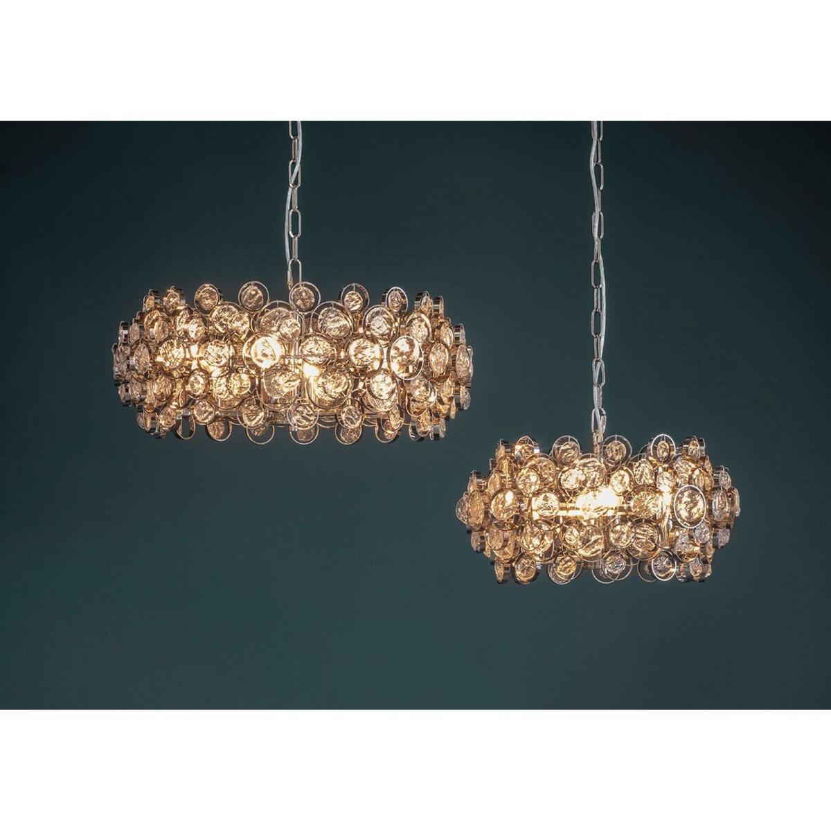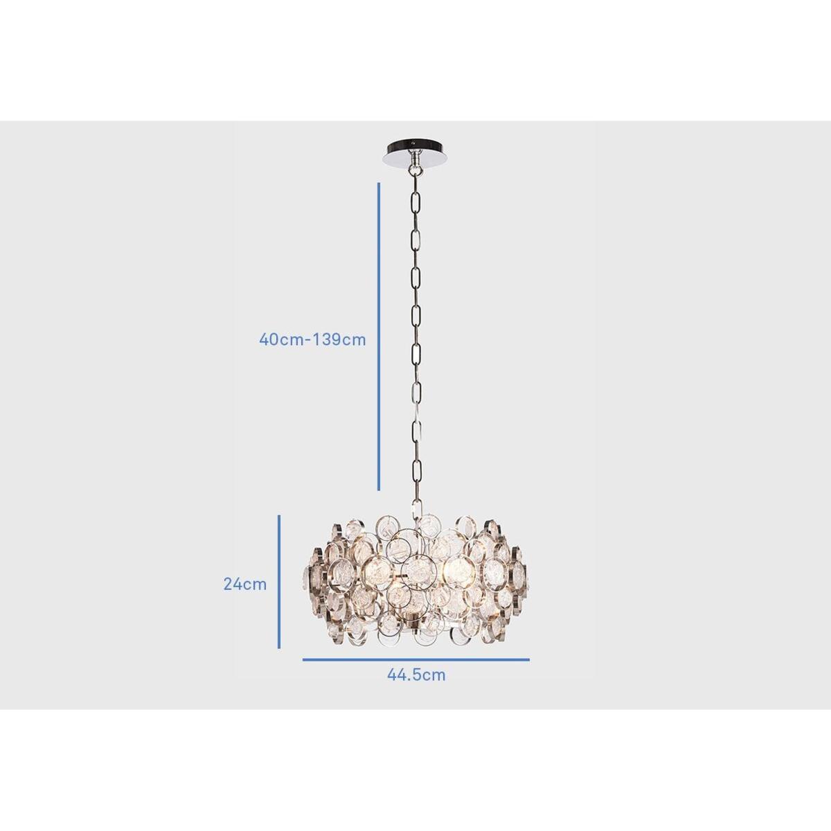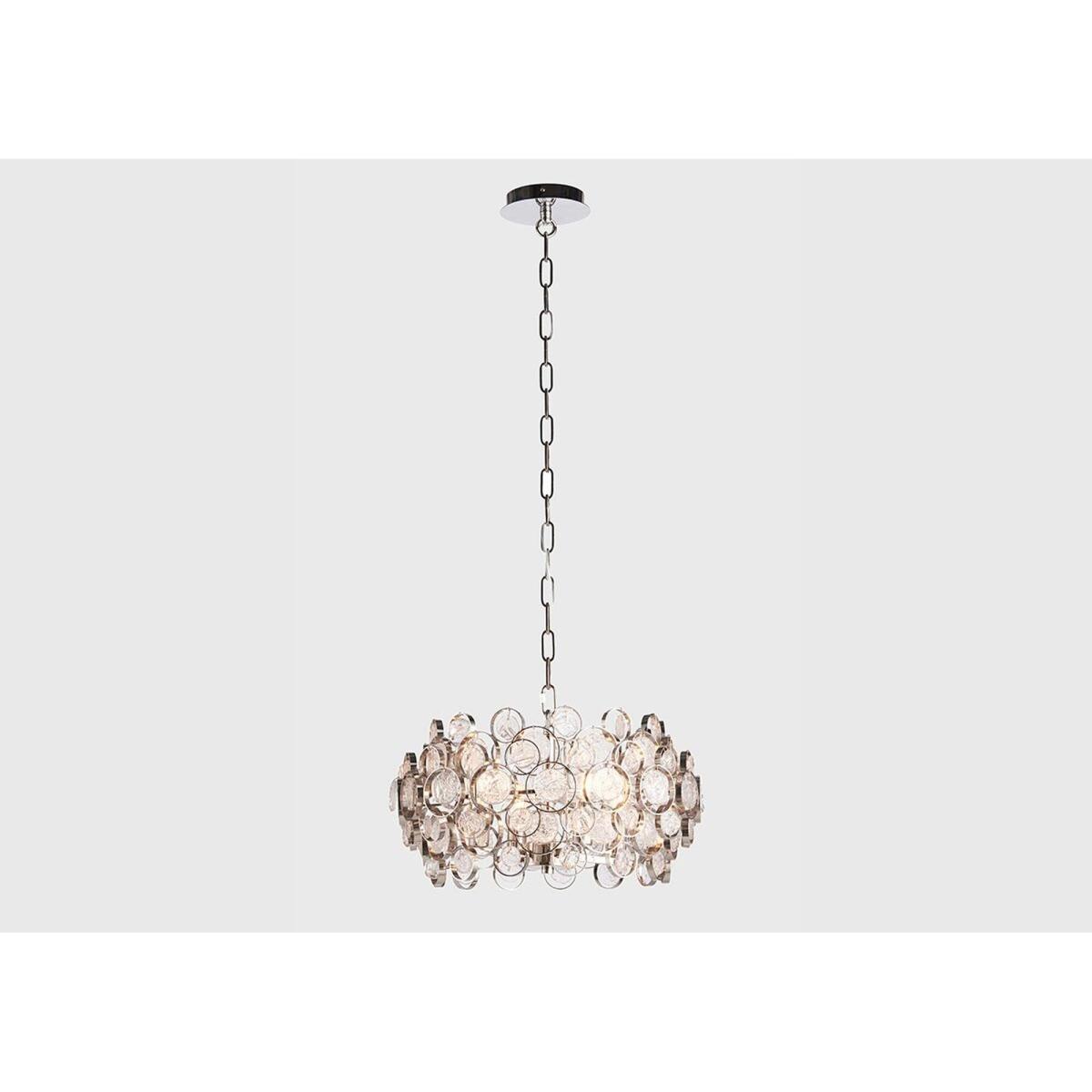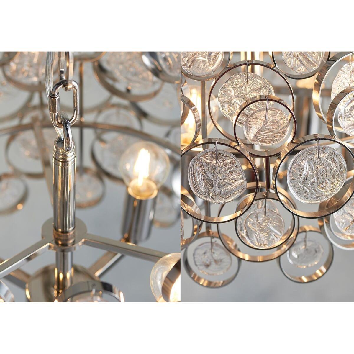 Make a grand statement with the Gillian pendant. This chain light fitting has an ornate design, decorated with handmade glass medallions that are encased in nickel-finished rings for a shimmering contrast. Let the Gillian shine by placing it low above a side table for a warm glow that will steal the show.