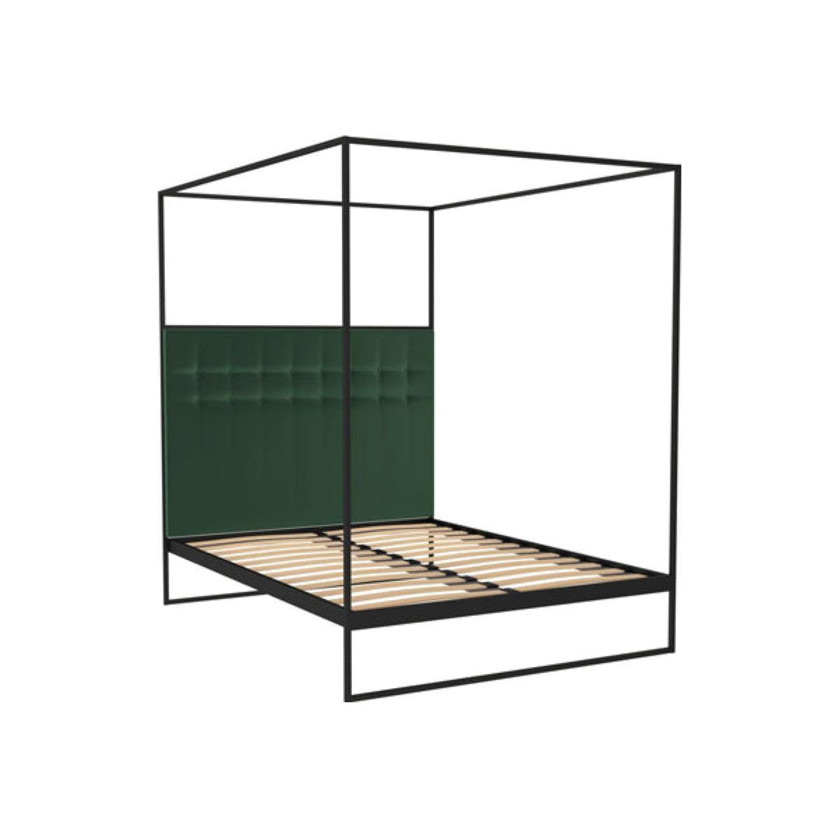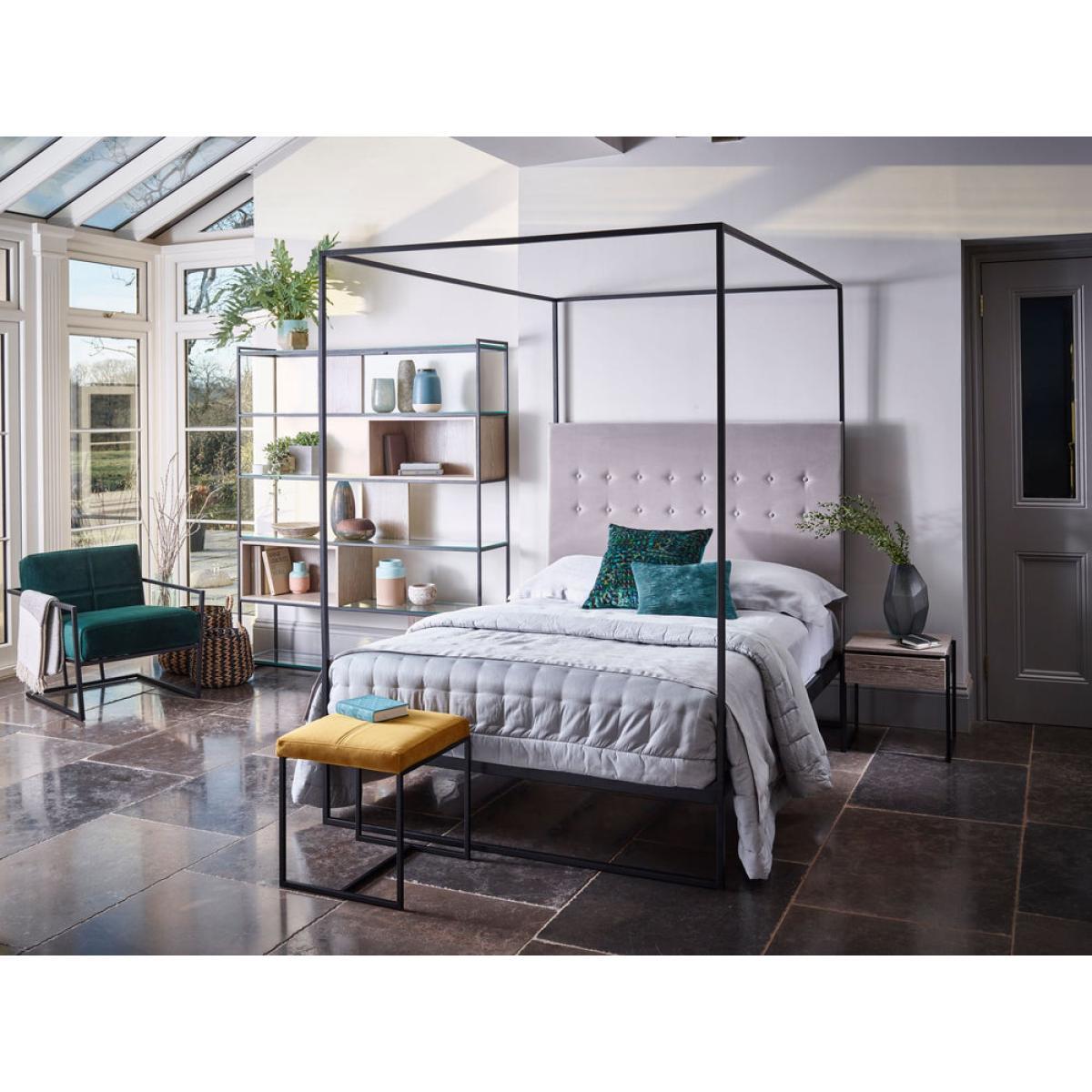Federico black powder coated canopy frame in a matt black finish including headboard upholstered in deep green velvet fabric. A subtle mix of contemporary design and early 20th century decadence. The deconstructed frame structure of each piece beautifully contrasts with the rich texture of the wood panelling and velvet upholstery to create a tactile and truly timeless series of bedroom and living room furniture. *Moot Trading Ltd is not a lender and acts only as an introducer. The credit product is provided by Klarna Bank AB (publ). Credit is only available to permanent UK residents aged 18 and over, subject to status. Terms and conditions apply. Please note that the following products are not regulated by the FCA: Pay in 30 days and Pay in 3 instalments. Read More.