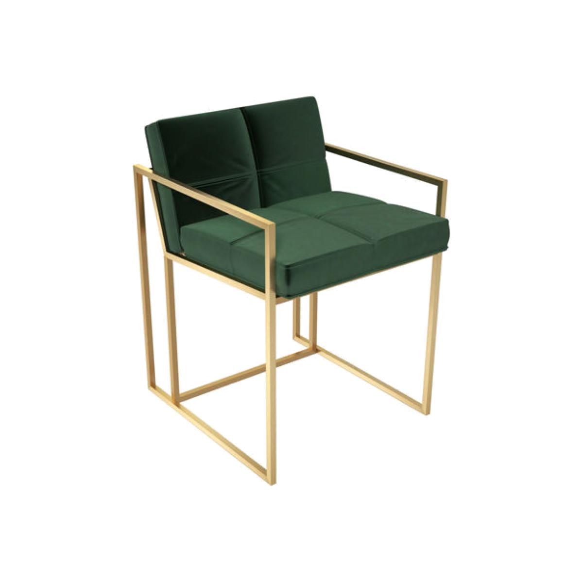 A modern, contemporary dining chair, upholstered in deep green velvet fabric with a brushed brass finish frame Dimensions: H: 71 x W: 53 x D: 53 cm