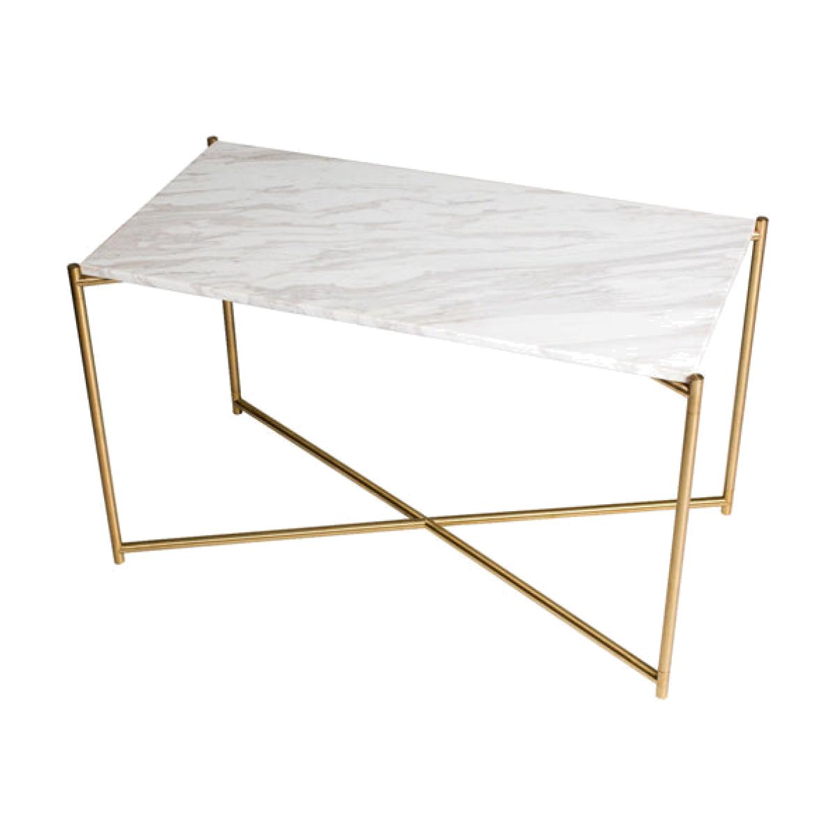 This stunning Gillmore Iris side table is the perfect way to bring glamour and style into your home in a highly practical way. The stunning brass effect fittings complement the striking white Jazz. View More. This stunning Gillmore Iris side table is the perfect way to bring glamour and style into your home in a highly practical way. The stunning brass effect fittings complement the striking white Jazz marble top perfectly for that ultra modern glitzy effect - the ideal addition to any contemporary interior. Measuring at a generous 83 x 42cm, the attractive rectangular shape makes this a great table to place next to a wall, perhaps in a hallway or living space, to display trinkets, vases or photographs. It is versatile, sleek and the perfect combination of functionality and style for any home. This product is made from marble which is a natural stone. The beauty of natural materials is that they have an authentic and unique finish which may result in slight variation in the vein, pattern and colour from the image shown.