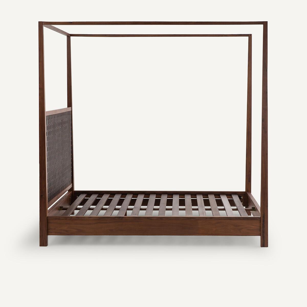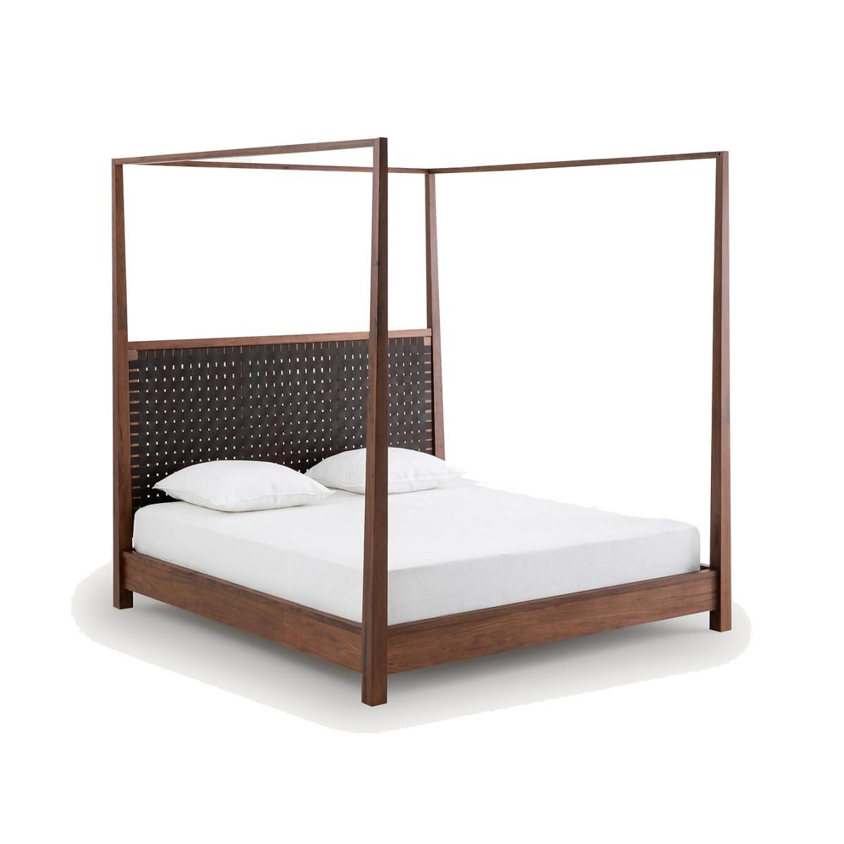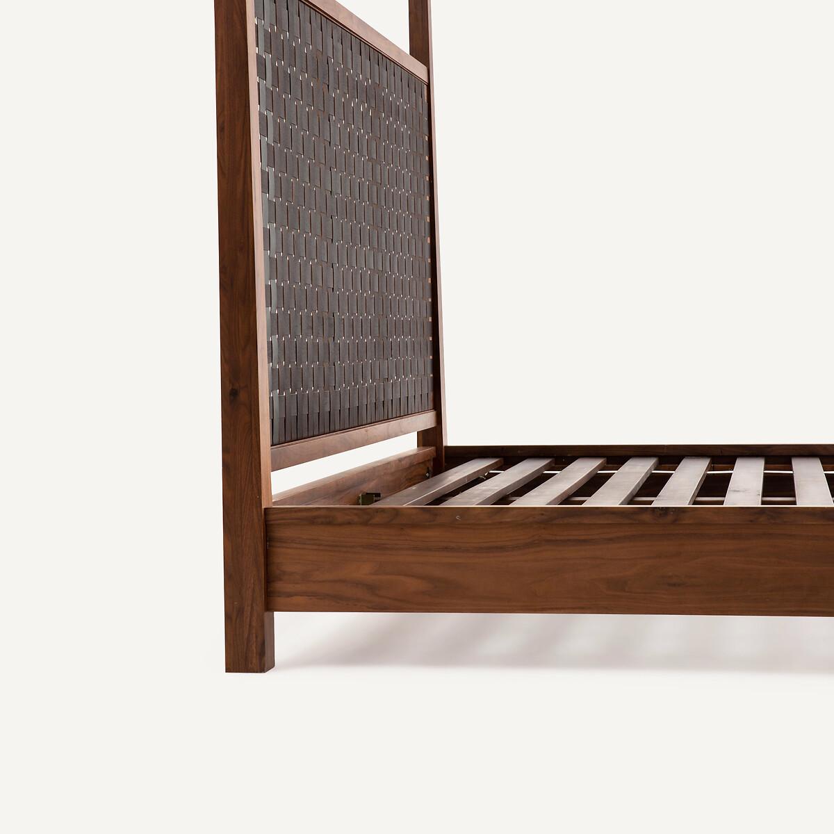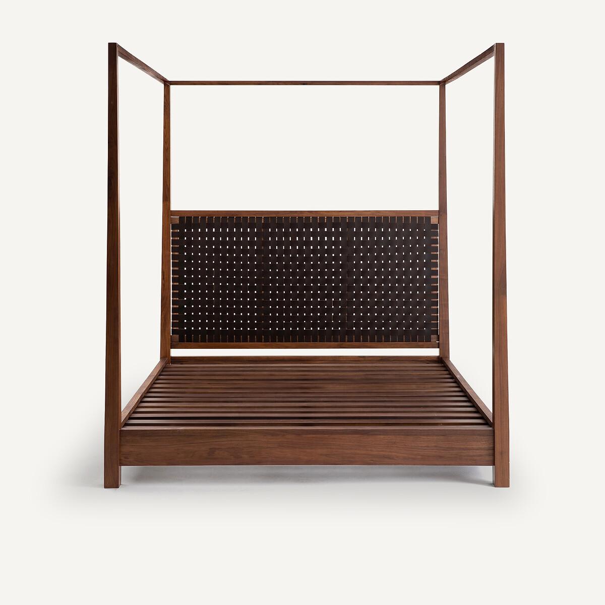 Thanks to its tapered lines and ultra-modern structure, the Gilmour bed has all the refinement of a high-quality piece of furniture.The large headboard is woven with strips of synderme (a material obtained from leather scraps) for an authentic feel. Product Details • Solid walnut structure, polyurethane finish • Walnut veneered MDF bed frame, polyurethane finish • Headboard woven with strips of synderme (material obtained from leather scraps) • Solid walnut legs with polyurethane finish, H18cm • Supplied with multi-ply slatted base in solid beech. Additional information • The material of this braided headboard is obtained from scraps of leather, crushed and agglomerated using a synthetic resin.. Dimensions • Sleeping area: 180 x 200cm • Width: 194cm • Length: 213cm • Height: 210cm • Mattress height: 28cm • Assembly required. • Recycled Leather. Using Post Consumer Leather is all about conserving resources and reducing waste. • WOOD FROM SUSTAINABLY MANAGED FORESTS. FSC® certified wood comes from forests that are environmentally, socially and economically well managed. Dimensions and weight of parcel3 parcels • L192 x H15 x D100cm - 23kg • L220 x H15 x D38cm - 45kg • L159 x H10 x D35cm - 25kg