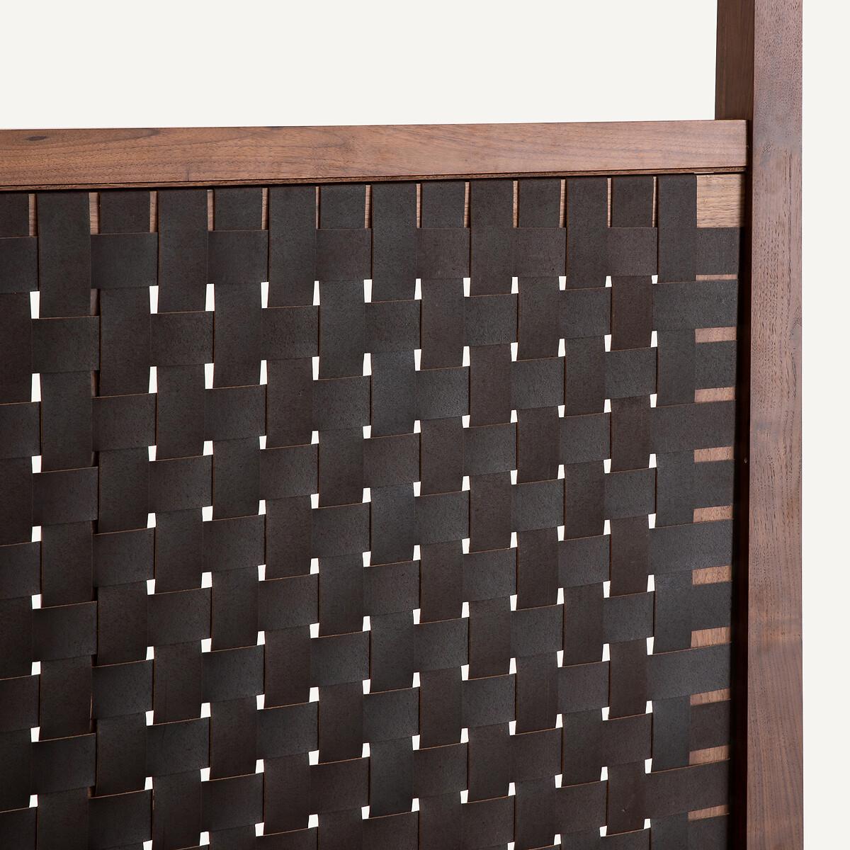 Thanks to its tapered lines and ultra-modern structure, the Gilmour bed has all the refinement of a high-quality piece of furniture.The large headboard is woven with strips of synderme (a material obtained from leather scraps) for an authentic feel. Product Details • Solid walnut structure, polyurethane finish • Walnut veneered MDF bed frame, polyurethane finish • Headboard woven with strips of synderme (material obtained from leather scraps) • Solid walnut legs with polyurethane finish, H18cm • Supplied with multi-ply slatted base in solid beech. Additional information • The material of this braided headboard is obtained from scraps of leather, crushed and agglomerated using a synthetic resin.. Dimensions • Sleeping area: 180 x 200cm • Width: 194cm • Length: 213cm • Height: 210cm • Mattress height: 28cmDelivery:. Assembly required. Available for home delivery. • Recycled Leather. Using Post Consumer Leather is all about conserving resources and reducing waste. • WOOD FROM SUSTAINABLY MANAGED FORESTS. FSC® certified wood comes from forests that are environmentally, socially and economically well managed. Dimensions and weight of parcel3 parcels • L192 x H15 x D100cm - 23kg • L220 x H15 x D38cm - 45kg • L159 x H10 x D35cm - 25kg