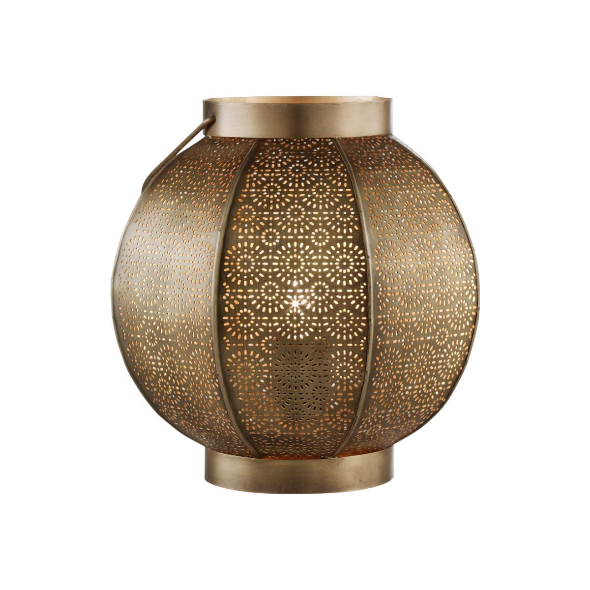 Gimili Brass 27cm Table Lamp. The Gimili table lamp is a traditional lamp styled on festival lanterns. This beautiful brass lamp is stunningly hand etched by skillful artisans, with intricate patterns covering the shade. ? We recommend our E27 Warm White LED bulbs for a warm glow, or our E27 Daylight LED bulbs for a crisp sharp look.