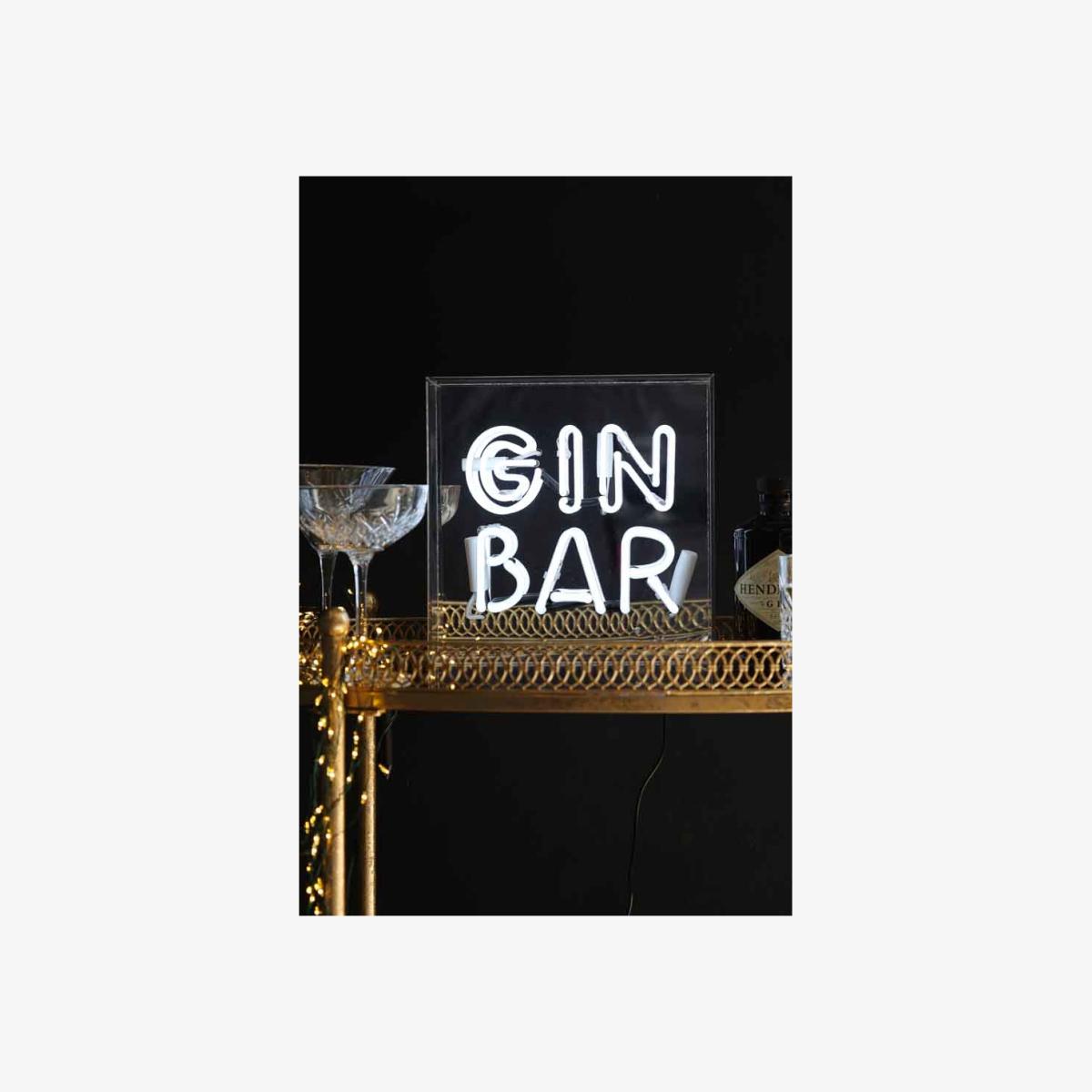 About The Gin Bar Neon Light Box Transform your home into a spectacular gin palace with the Gin Bar Neon Light Box! Showcasing an ultra cool style, this neon light features striking typography with the words ‘Gin Bar’ illuminated in bright white tube lights enclosed in a large perspex box. Exuding a snazzy style statement, this extraordinary neon light box measures 25cm in height, 25cm in width and 10.5cm in depth. This neon light sign for home comes with a standard UK plug and an EU adaptor and would make a spectacular gift for a cocktail lover! Why We Think You’ll Love The Neon Bar Light At Rockett St George, we’re firm believers in filling our homes with quirky ornaments that are bursting with character. It’s what makes a scheme unique whilst offering instant wow-factor and this neon tube light will most definitely do that! Showcasing an utterly retro design, this neon light bar sign will become the focal point of wherever you choose to style it, so what’s not to love?! Where To Style The Neon Light Sign Making a lasting impression this neon light up sign deserves to be seen so we recommend styling it in a high traffic area of your home. Showcasing an utterly eye-catching look with its striking neon radiance, this neon light sign will take pride of place as a decorative ornament in a cocktail corner or on one of our fabulous bar trolleys. Not only will it command instant attention but it will also get the party started when you have guests over!