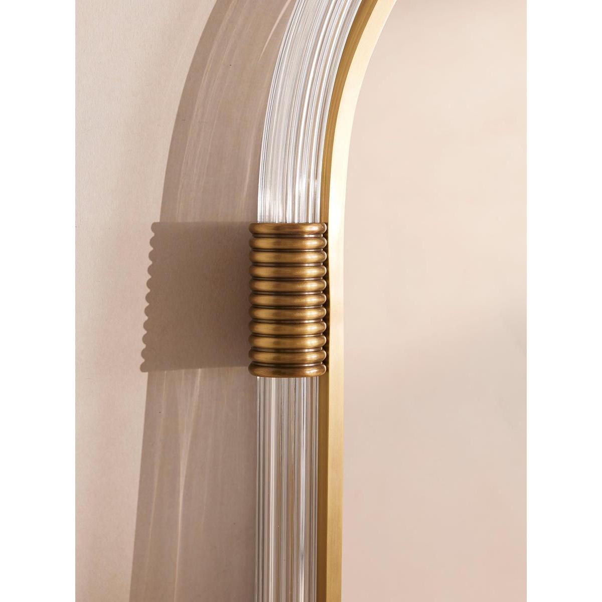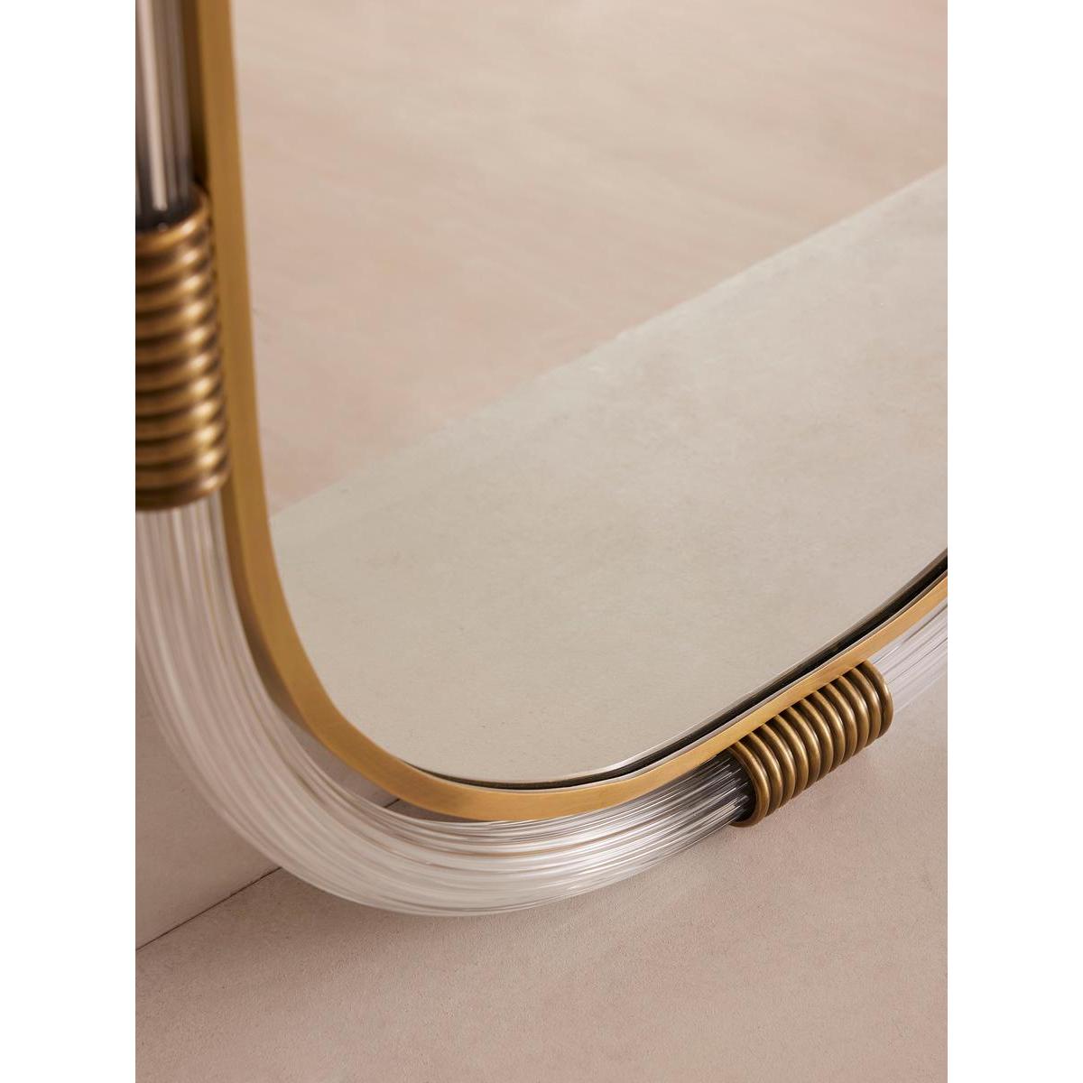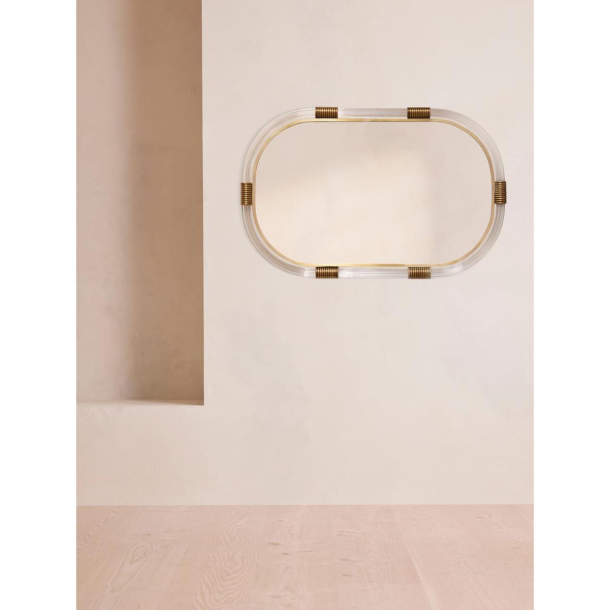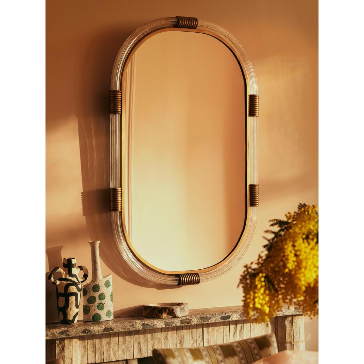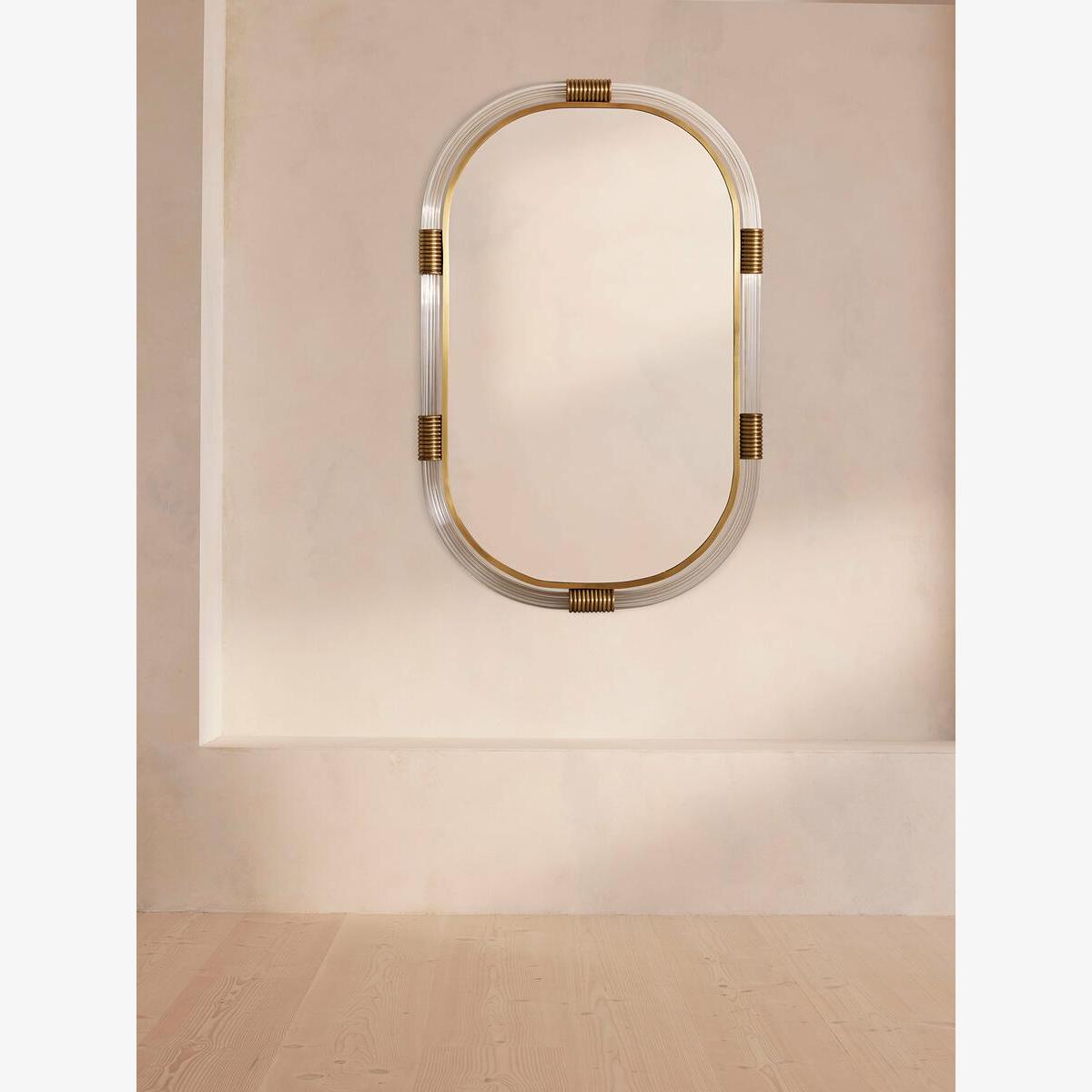 Our Gina mirror is bathroom-safe, but can be used anywhere in the home for a contemporary touch. A ribbed lucite frame is accented with real solid brass detail, inspired by the finishes seen in White City House, while the curved, oblong shape is made to soften your interiors scheme.