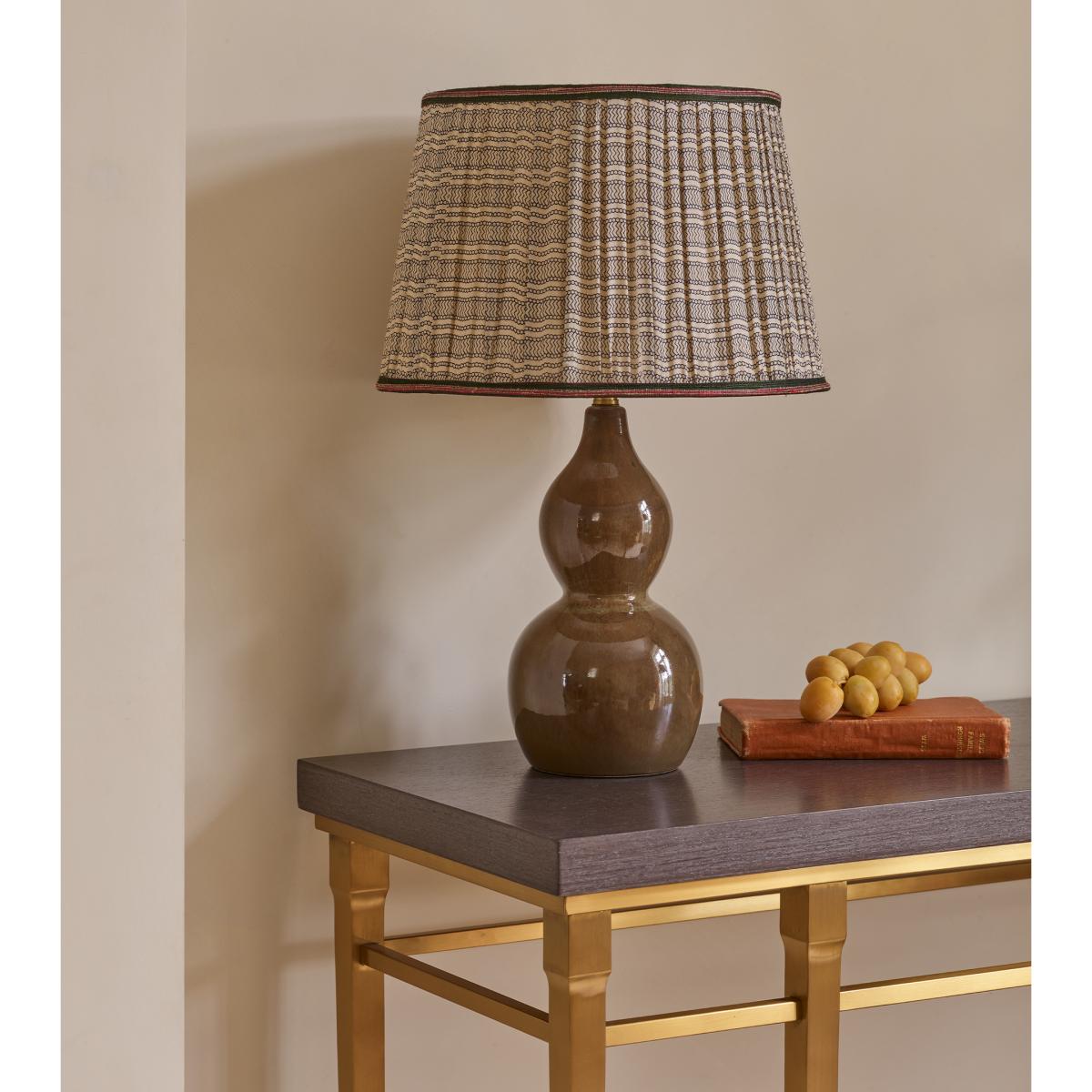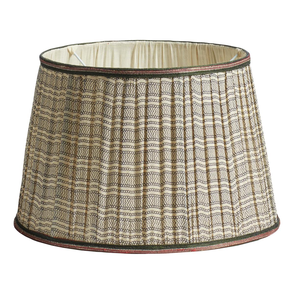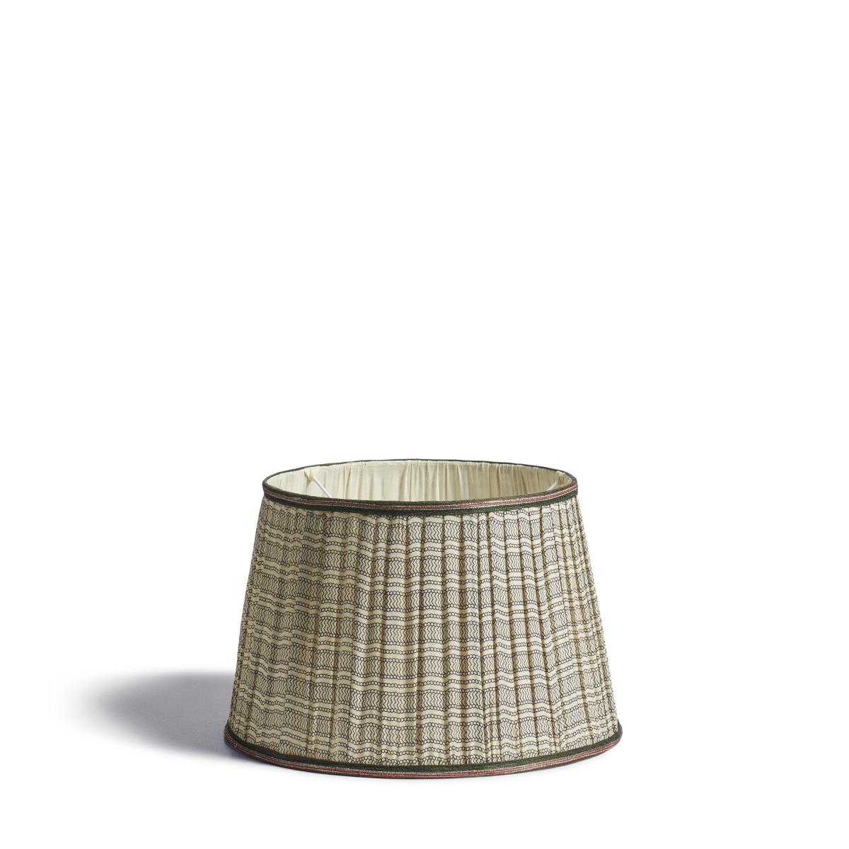 Stripes of horizontal pattern decorate the Ginevra Lampshade, and its name translates from Italian to mean ‘white wave’. The pattern is hand screen printed onto raw tussar silk, which is hand gathered and bordered by a handwoven gold and teal trim. The vibrancy of the trim pairs well with our similarly coloured Artemisia Cushion Cover. This is the smaller of our two lampshade sizes.