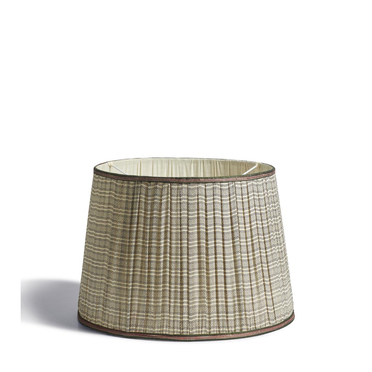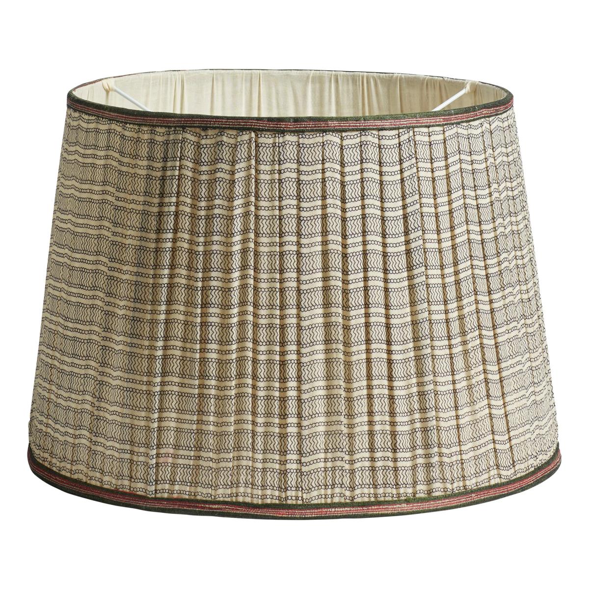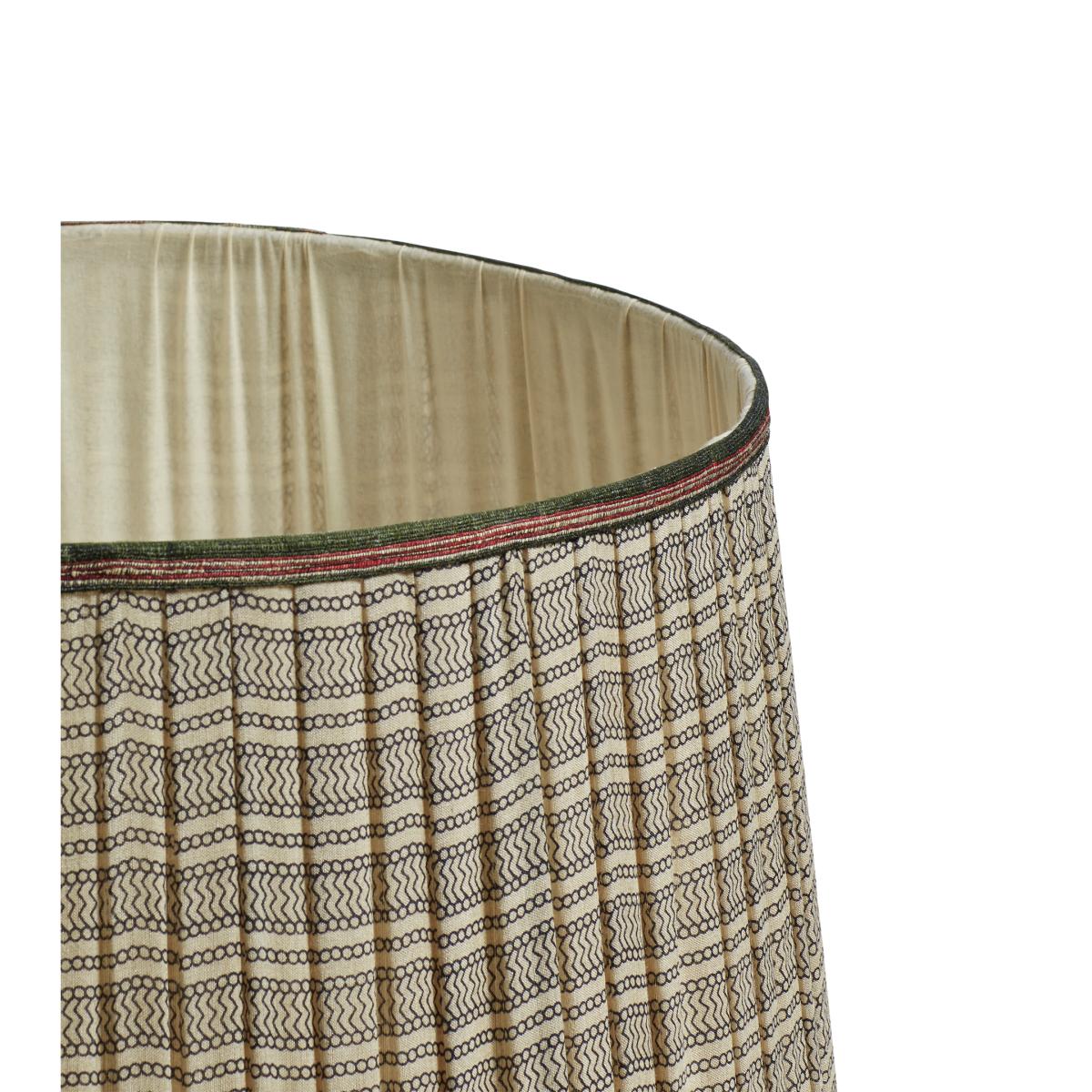 Stripes of horizontal pattern decorate the Ginevra Lampshade, and its name translates from Italian to mean ‘white wave’. The pattern is hand screen printed onto raw tussar silk, which is hand gathered and bordered by a handwoven gold and teal trim. The vibrancy of the trim pairs well with our similarly coloured Artemisia Cushion Cover. This is the larger of our two lampshade sizes.