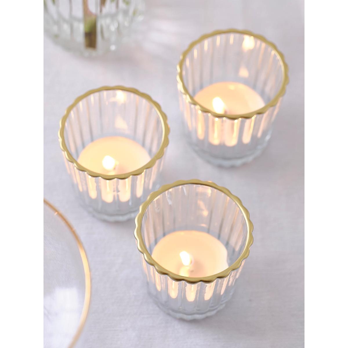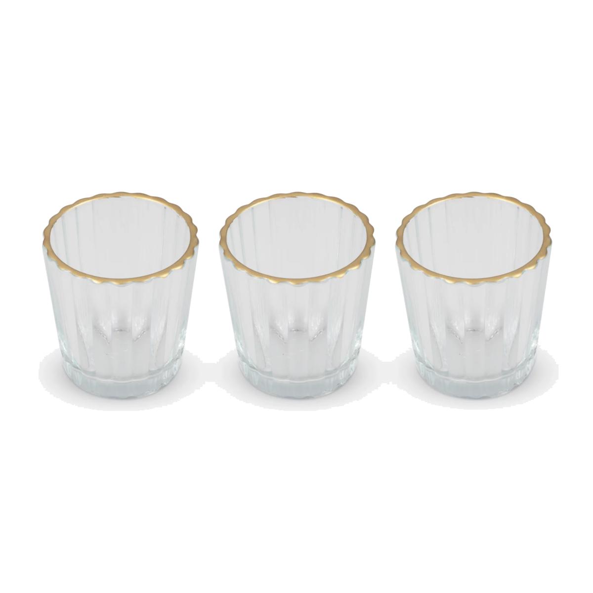 Add a lovely twinkle to your table decor with these glass tea-light candle holders. Each pack contains 3x tealight holders in ribbed glass with a gold rim.