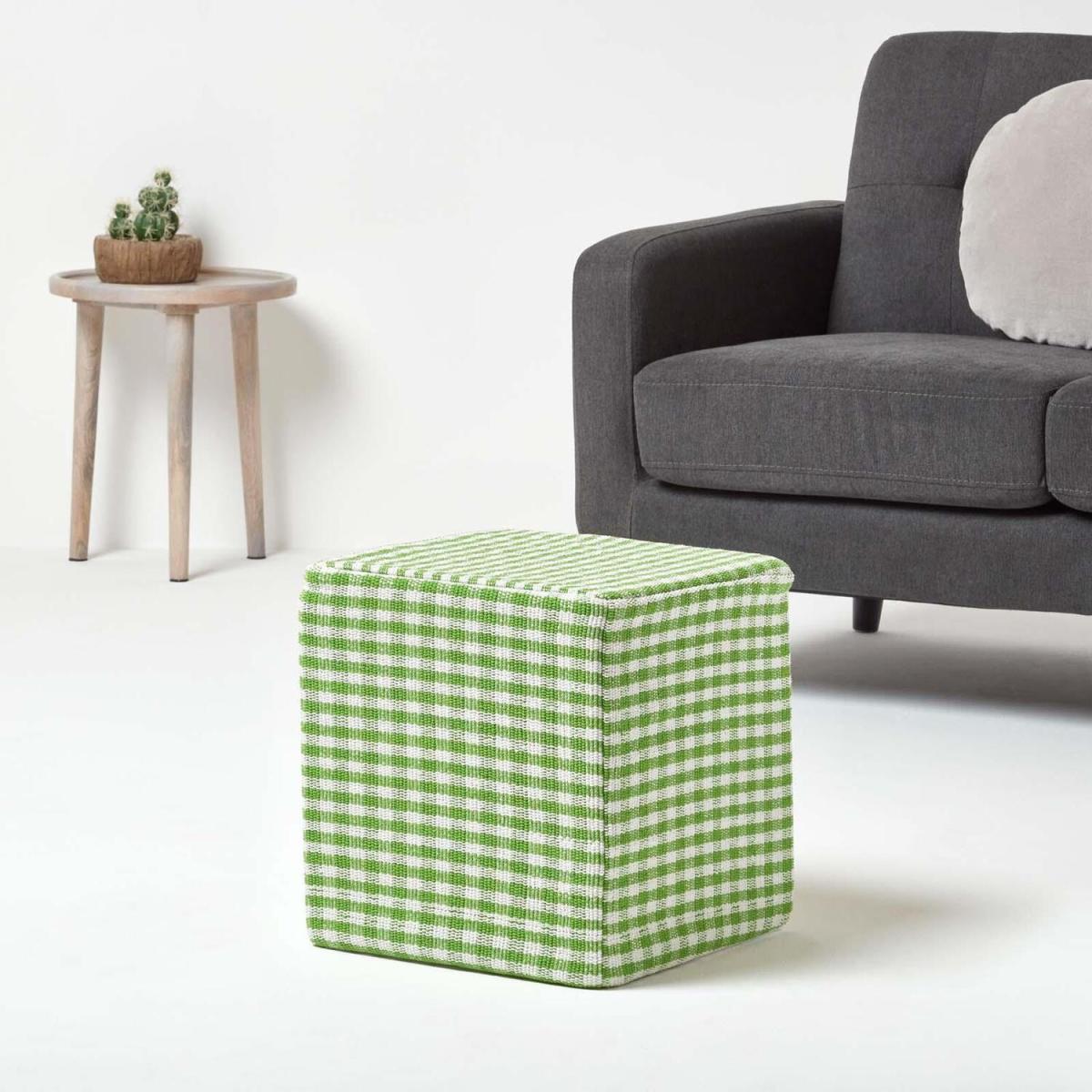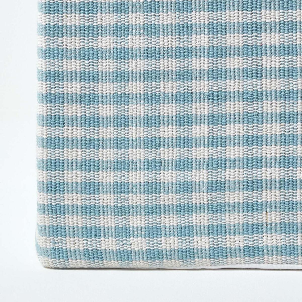Our cube-shaped pouffe is filled with soft but sturdy foam and covered in cotton and provides a great place for you to put your feet up after a long day. The traditional gingham check fabric has a gentle makeover in baby blue, making this a perfect option for a cool living room or childs room. The compact, flat-topped design means that it can be used as a footstool, seat or even a table.