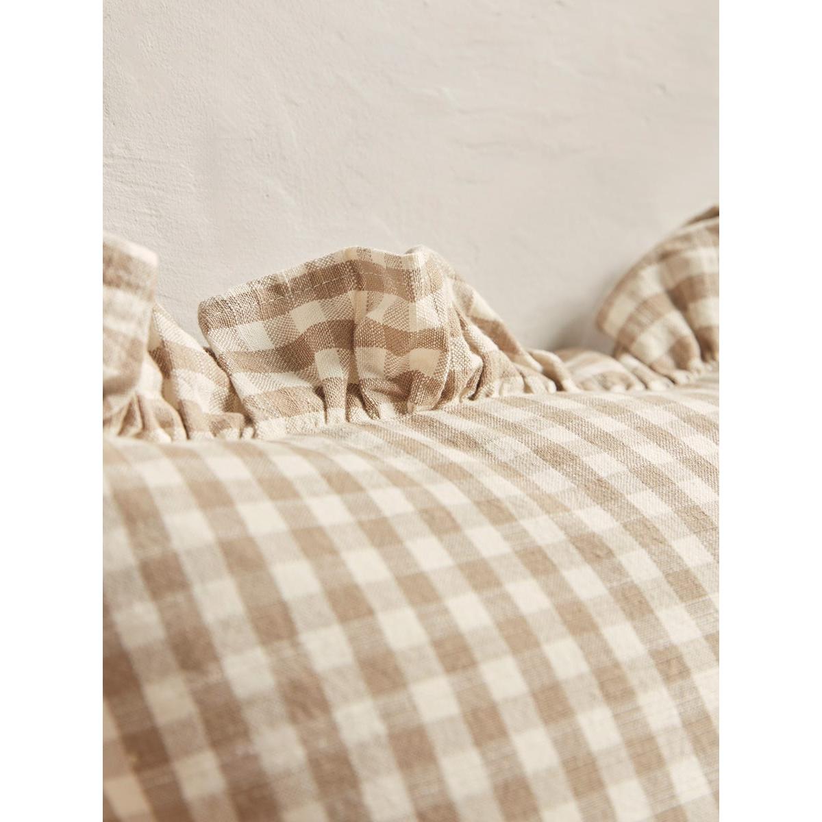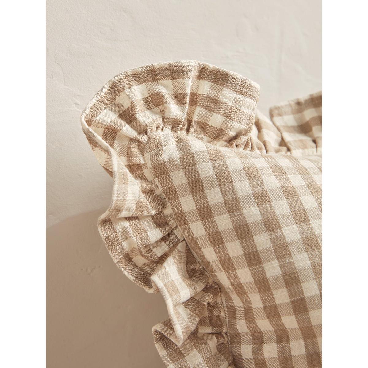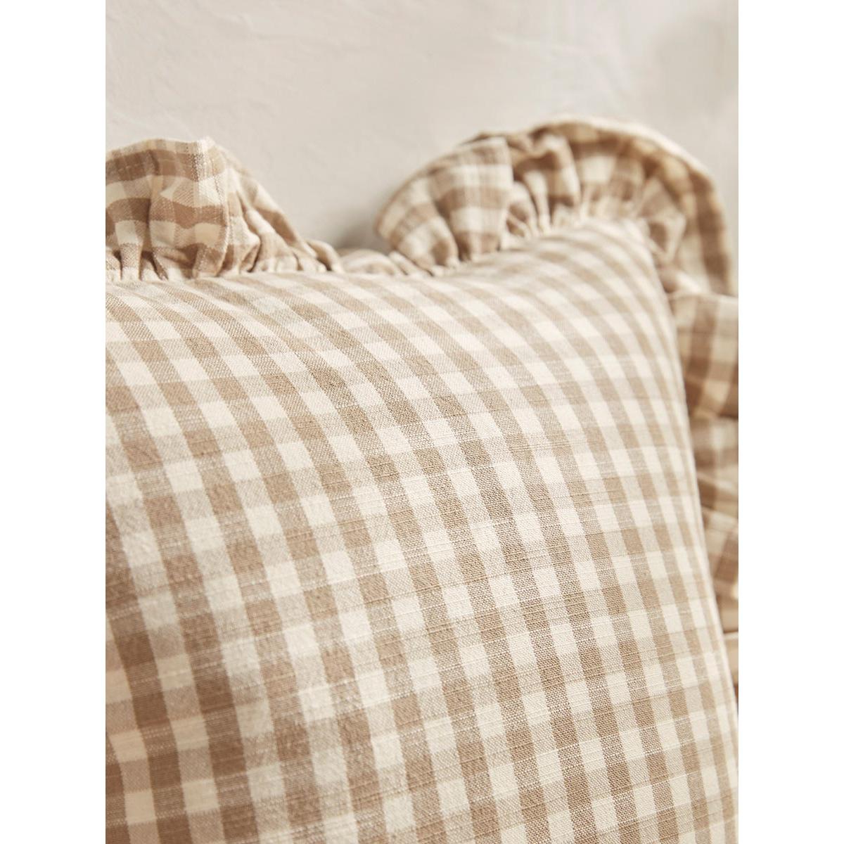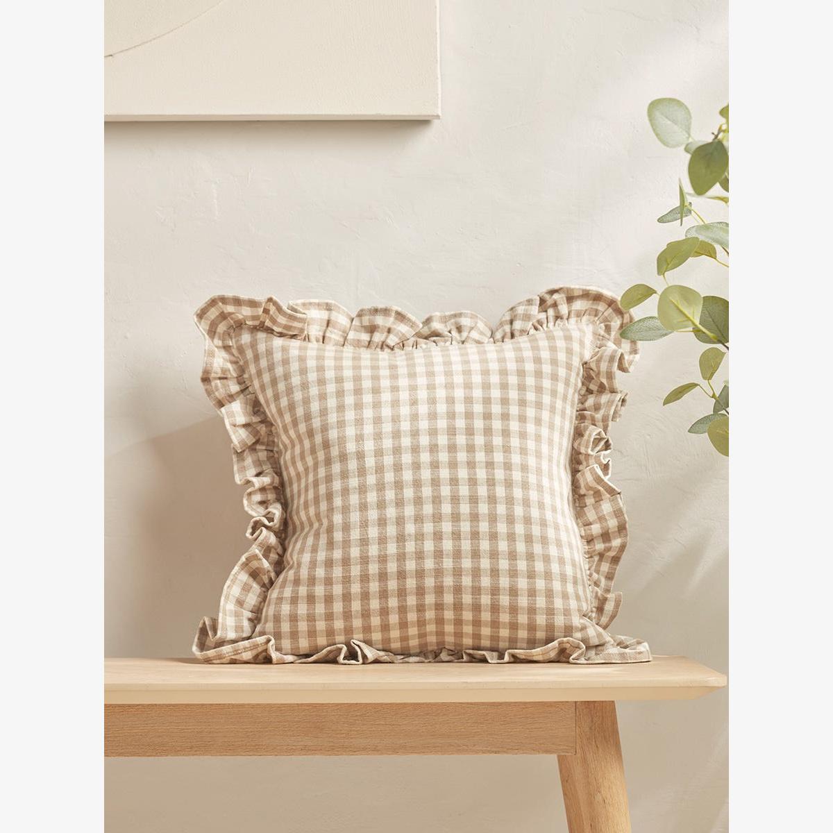 A  fresh gingham fabric and deep ruffled trim gives this square cushion a lovely cottage feel that will invigorate wherever you place it in your home.  In tones that will blend with a multitude of other shades, this cushion is sure to charm.
