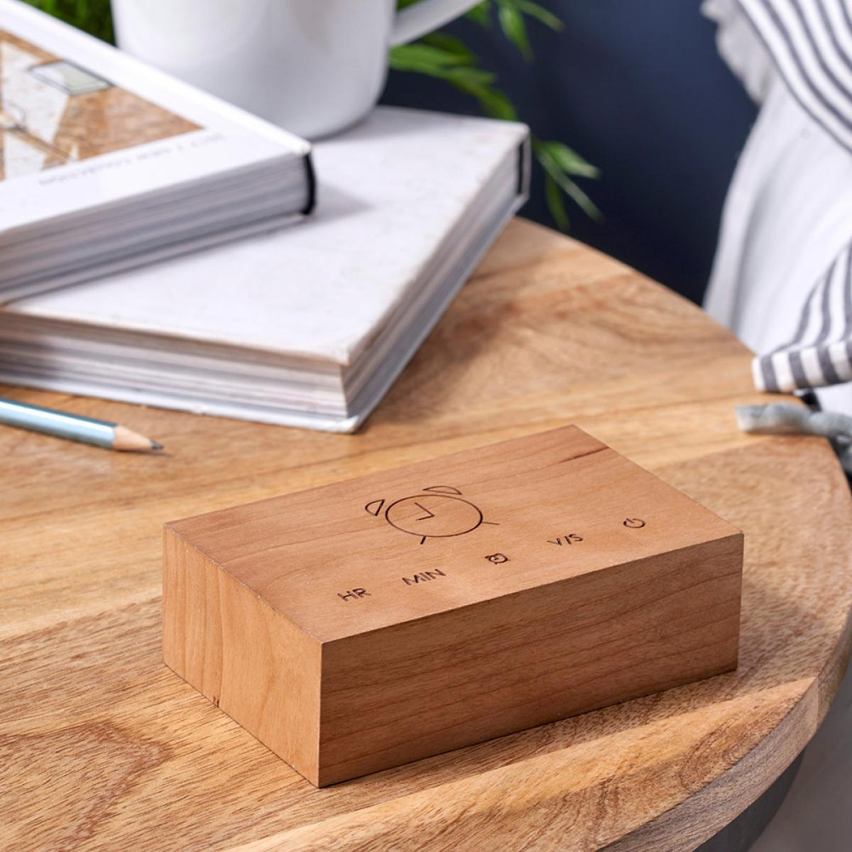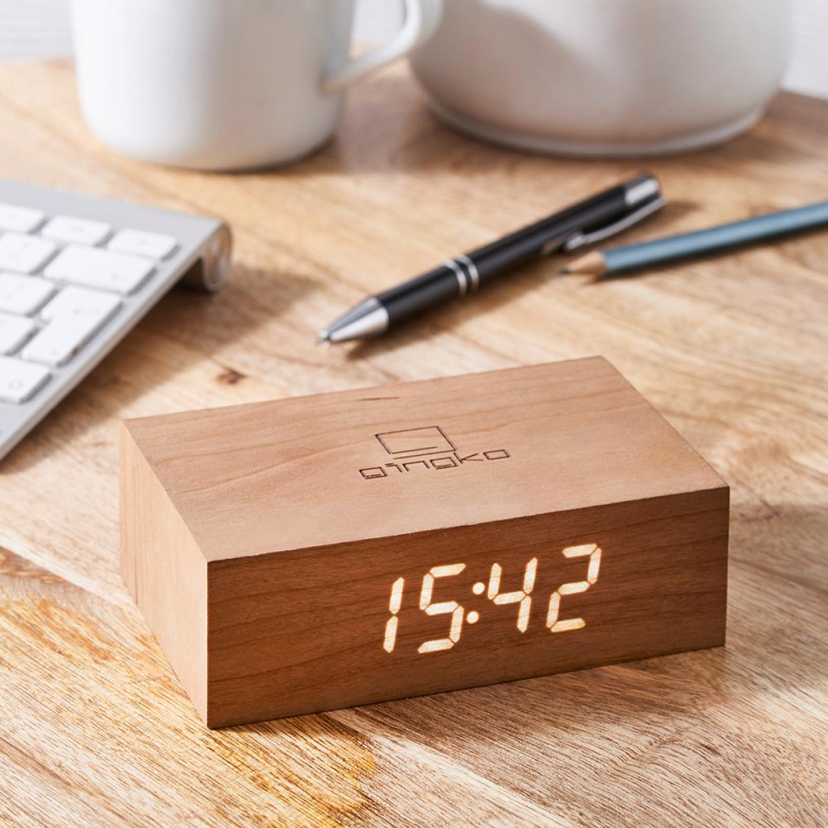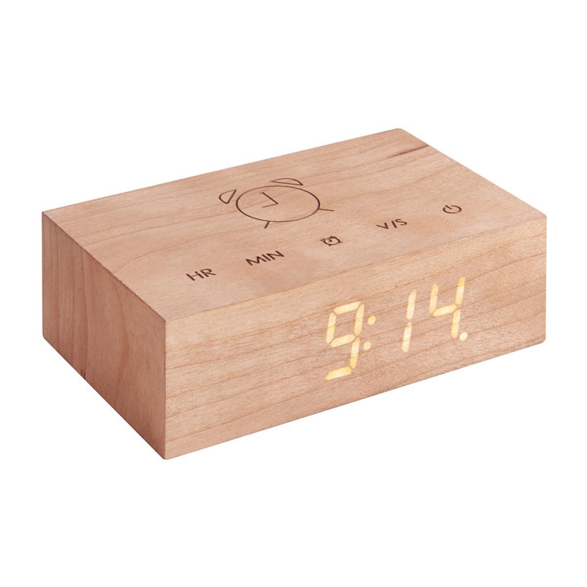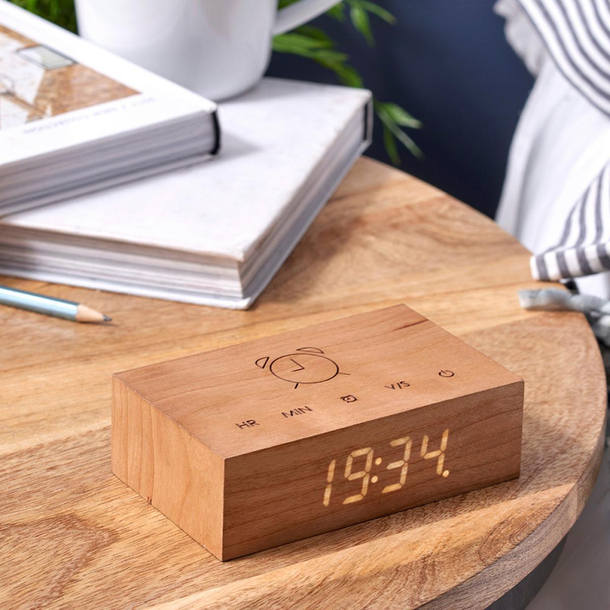 I love this piece’s minimalist design and natural cherry finish, which makes it versatile across a range of interiors. It works particularly well in modern, Scandinavian, or even Japandi schemes where understated elegance is key. The simple wooden form paired with a clean digital display offers a subtle yet functional focal point on bedside tables or desks. As a styling tip, consider pairing it with other natural materials like linen or ceramics for a calm, cohesive look. Its compact size also makes it practical for smaller spaces, where it can seamlessly integrate without overwhelming other décor elements.