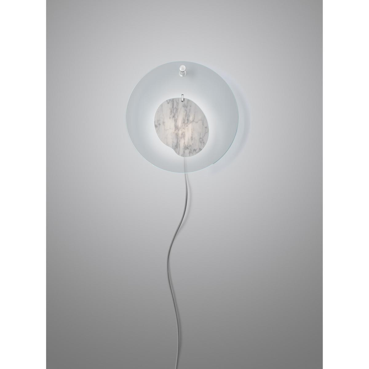 Domestic jewel. An alliance of opposites, Gioia unites past and present, humble and precious. Evoking a pendant, the Gioia wall lamp is a real jewel designed to decorate domestic space. Its designer, Andrea Anastasio, explains: "I’ve always imagined the house as a protective and mysterious deity. Gioia is a kind of tribute, an ornament offered to the ‘domus’, the home. "The magic of this light lies in the colourful combination of styles, materials, shapes and colours. Gioia consists of a large coloured plexiglass disc in the middle of which hangs a precious piece of marble hiding the light source. The two elements are linked by a thin metal ring that evokes the world of the goldsmith. The transparency and modernity of the plastic disc contrast with the opacity, noble character and organic lines of the marble element. The disc is fixed to the wall by a small metal pin. The two parts are free to move, recalling the oscillating rhythm of a pendant or earring. Italian designer Andrea Anastasio brings past and present together to create a new poetic item, rich in references as eclectic as they are erudite. A meeting between a past full of statues, friezes and great works of architecture, and a present made of synthetic materials and inventions. The technical part of the lamp is completely independent of the decorative disc, which gives the decorative element complete freedom of movement. The LED light source is in fact located in a diffuser box that attaches to the wall at the back of the disc. Designer and philosopher Andrea Anastasio explores ancient cultures, the boundaries of art and contemporary design. Fascinated by the study of the poetics of conceptual art and its possible convergences with industrial design, he draws objects that generate contaminations of languages and meanings.