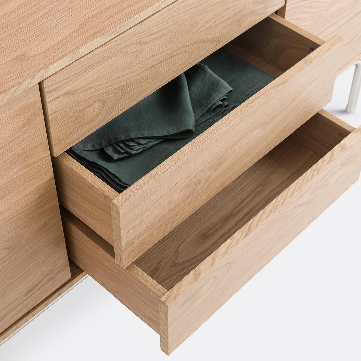 This sideboard is a versatile piece that works beautifully in both modern and mid-century inspired interiors. Its combination of oak veneer and chrome steel legs adds a warm, natural texture balanced with a sleek, contemporary finish. I love using it in living rooms or dining areas due to its spacious storage, which helps keep clutter out of sight while adding a sophisticated touch. Practical styling tips include pairing it with minimal accessories-such as a statement vase or a stack of coffee table books-to highlight its clean lines, or contrasting it with colourful ceramics or textured fabrics for visual interest. Its neutral tone makes it easy to incorporate into various colour schemes, making it a flexible addition to a range of interiors.