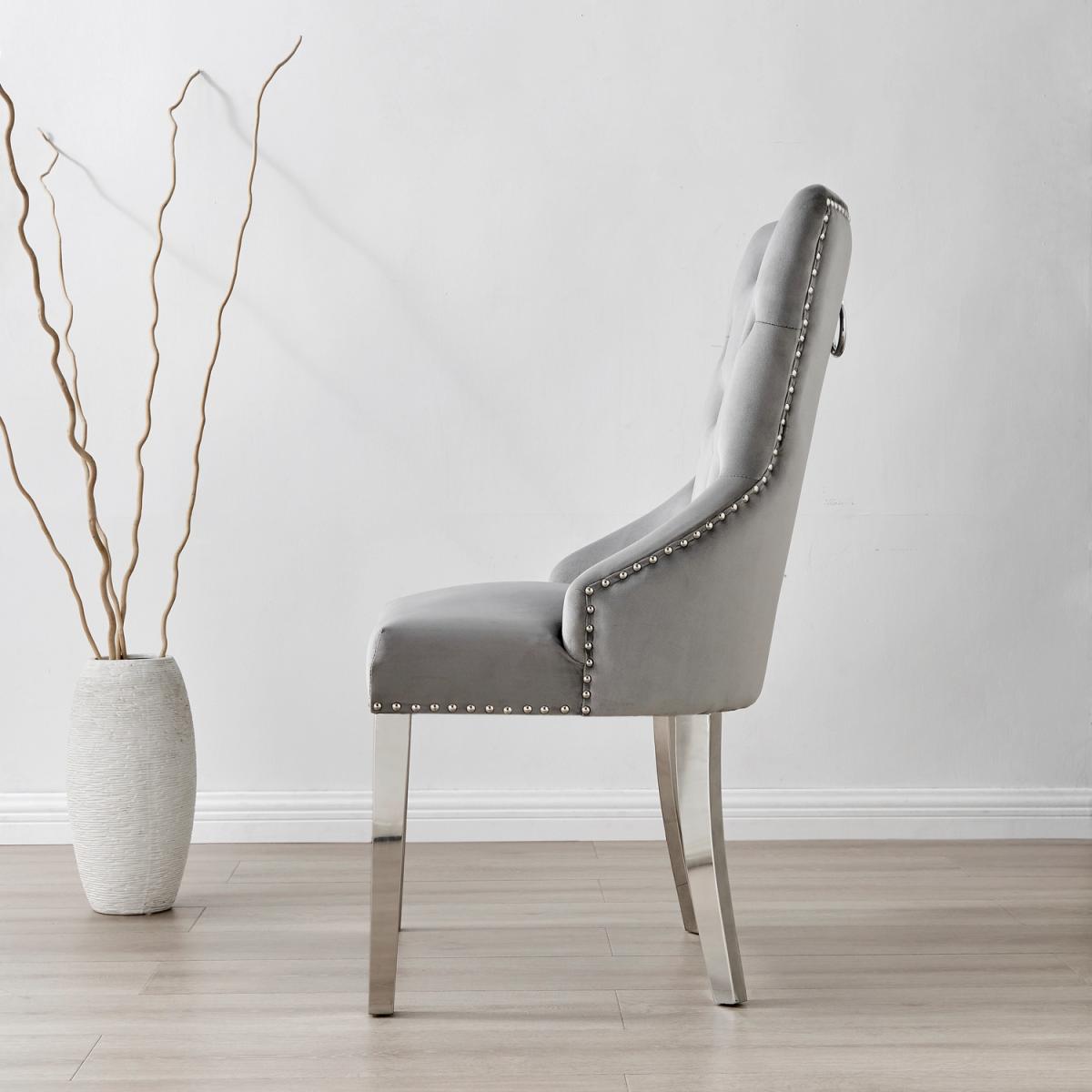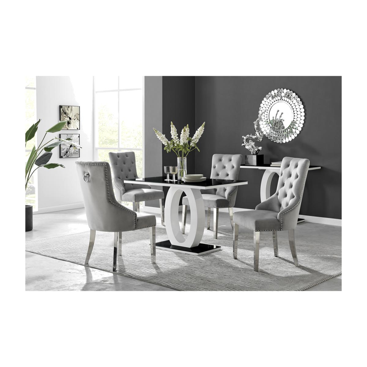 Our best selling Giovani dining table is the centrepiece of any dining room, with its rich high gloss and black glass surface, featuring a mesmerising halo structure. The Giovani ticks all the boxes of modern elegance for any home. Our 4 seater design generously offers a 120x70cm surface, and for those spaces that want seating on a grander scale while keeping class at the forefront. We do the beautiful Giovani table in a 6 seater design with a 160x90cm surface also. The opulent Belgravia chairs provide a touch of luxury, with thickly padded velvet upholstery, and a striking knockerback detail. Anyone for a lovely dinner party or some cocktails