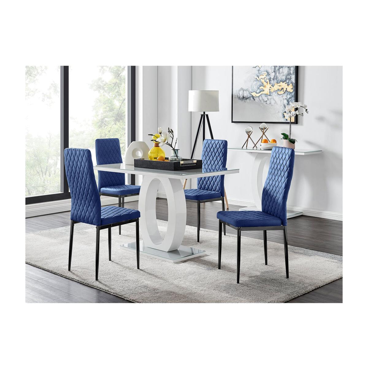 The Giovani table is arguably the most striking and artistic in our range of bespoke high gloss tables. The beautifully designed Giovani will be the centrepiece of any modern home, combining not just design and function, but also affordability! The two-tone effect, along with the crisp clean lines, really does give it that modern wow factor. The Giovani has a 120cmx70cm table top made from grey tempered glass, is easy to maintain and offers plenty of room for dining with guests and seat up to 4. The gorgeous rectangular glass table top, silhouetted by the rectangular base, combine beautifully to create a symmetrical centrepiece. Upholstered in soft touch navy blue velvet and finished with diamond pattern stitching the Milan dining chairs would seamlessly fit in with most dining spaces, whilst not compromising on either style or comfort. The stylish black powder coated metal leg and hatched velvet combination gives this chair a contemporary edge, whilst it's simple design allows for practical everyday usage. The chairs are made from high quality durable velvet that's easy to keep clean and are ergonomically designed for maximum comfort and support. They feature a deep foam seat cushion and plastic feet to protect the floor from any damage! At an unbeatable price you cannot go wrong with these chairs!